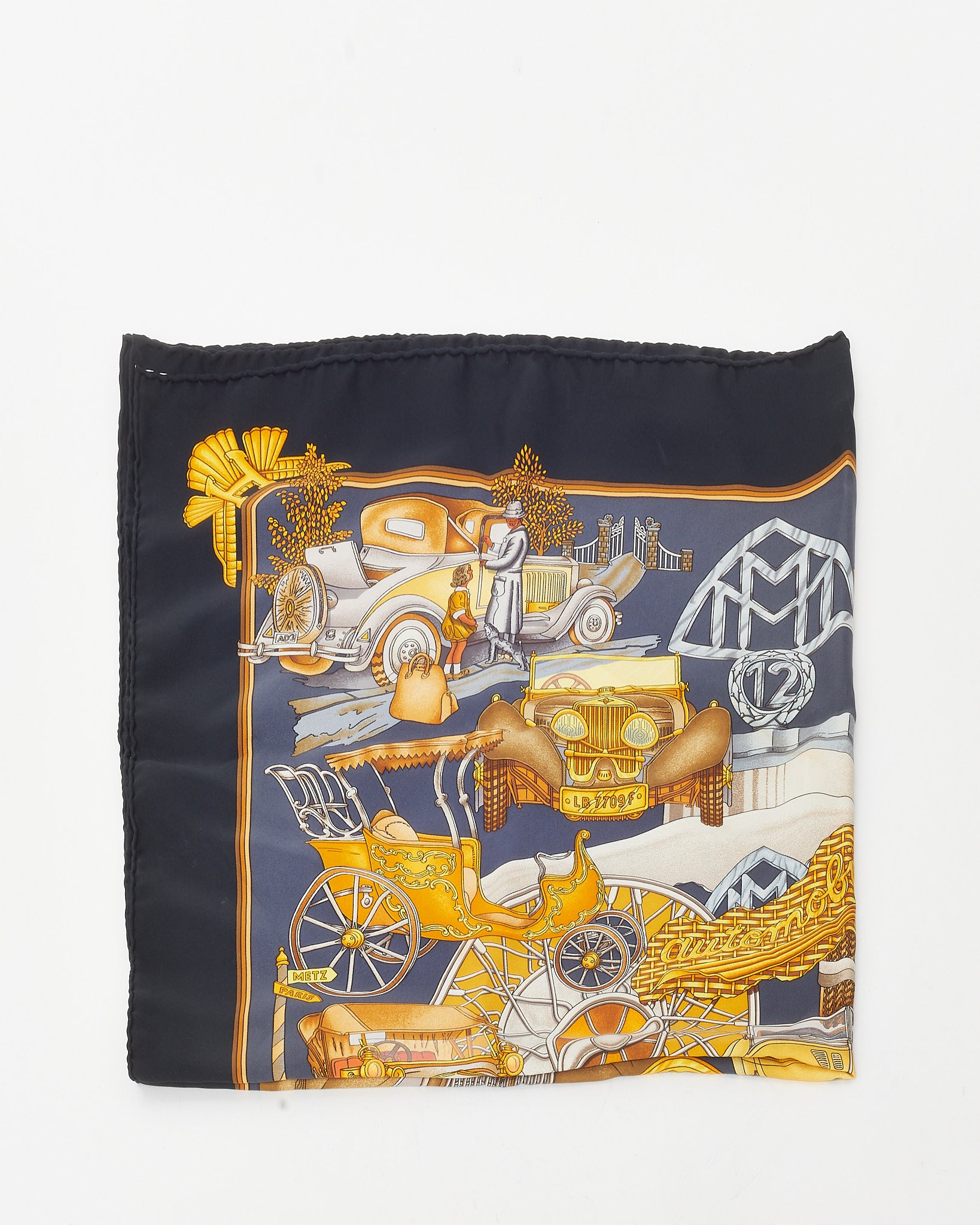 Artful and elegant, this pre-loved authentic Hermès Black/Gold/Multi “St. Christophe et l’Enfant Jésus” 90 Silk Scarf captures the house’s dedication to storytelling through exquisite design. Crafted in luxurious silk twill, this classic carré features a richly detailed depiction of Saint Christopher and the Christ Child, framed in a regal palette of black, gold, and multicolor tones. Hand-rolled edges and vibrant print artistry make it a collectible piece that can be worn, displayed, or passed down. A true testament to timeless Hermès craftsmanship.