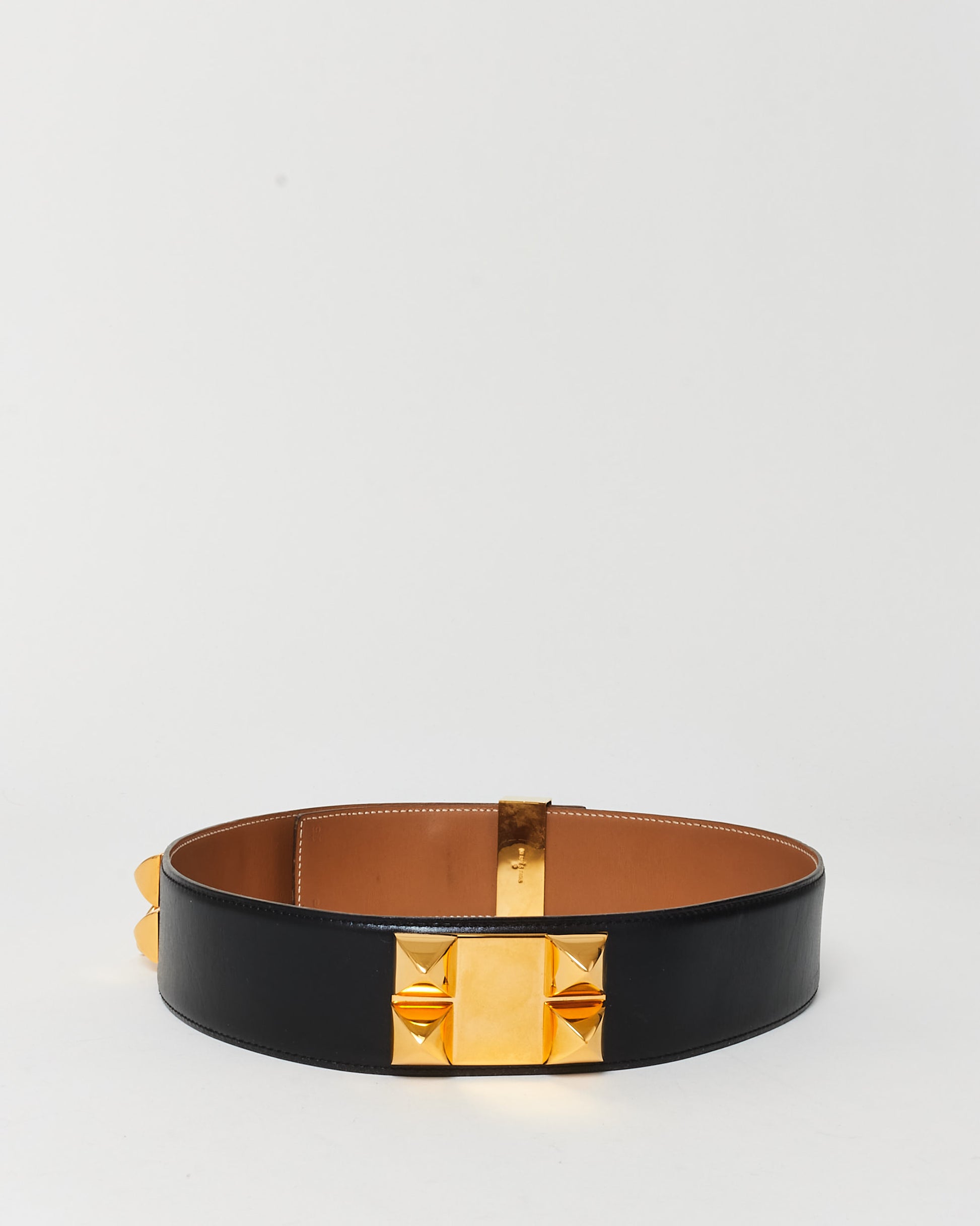 Enhance your wardrobe with the iconic authentic pre-owned Hermès Black Leather Collier De Chien Belt, Size 75, accented with luxurious Gold Hardware and four gold plated decorative studs. This exquisite belt is crafted from premium black leather, offering a sleek and sophisticated aesthetic. The bold, gold-tone hardware adds a touch of glamour, making it a standout accessory for any outfit. Shop pre-owned authentic Hermès belts at Retyche.