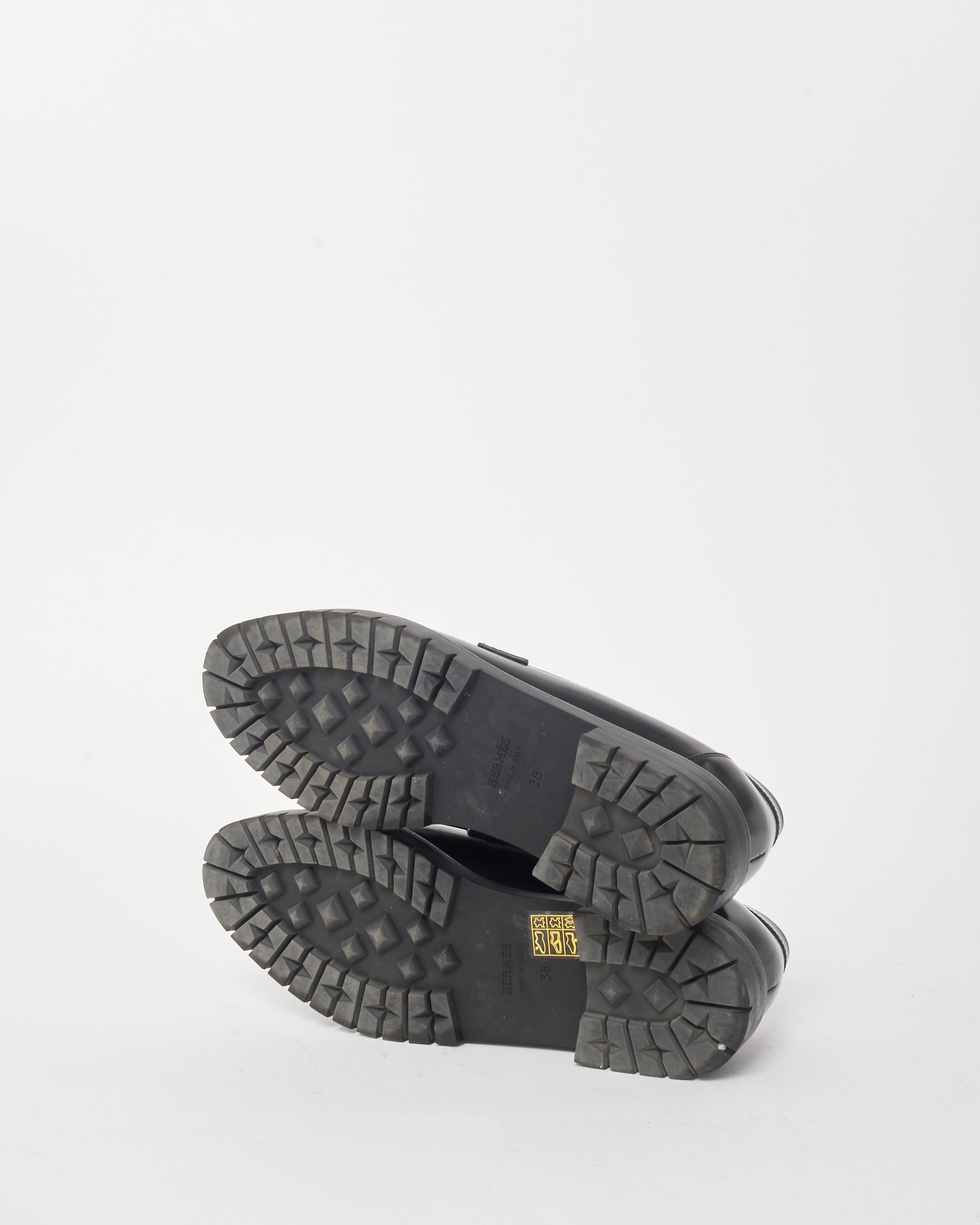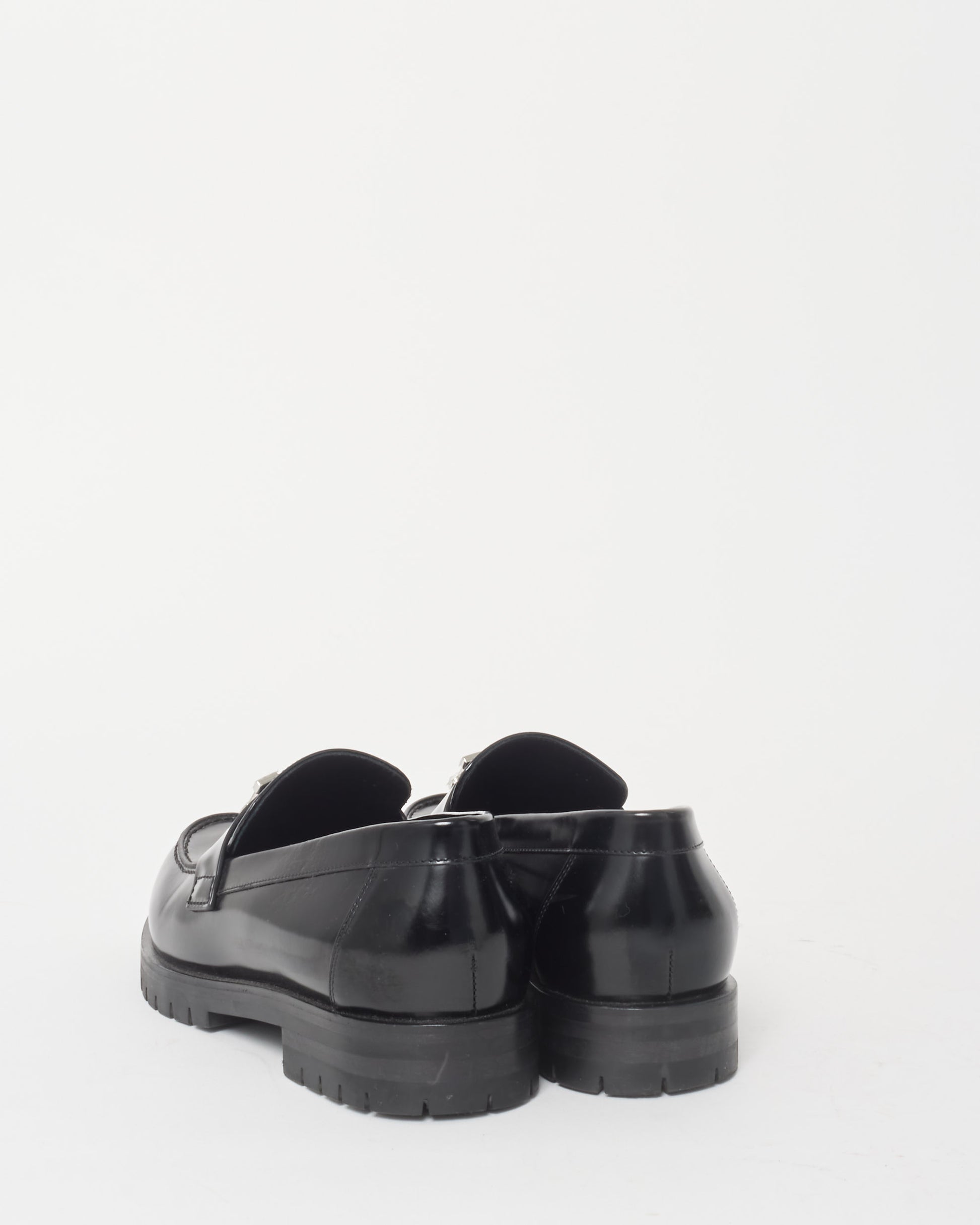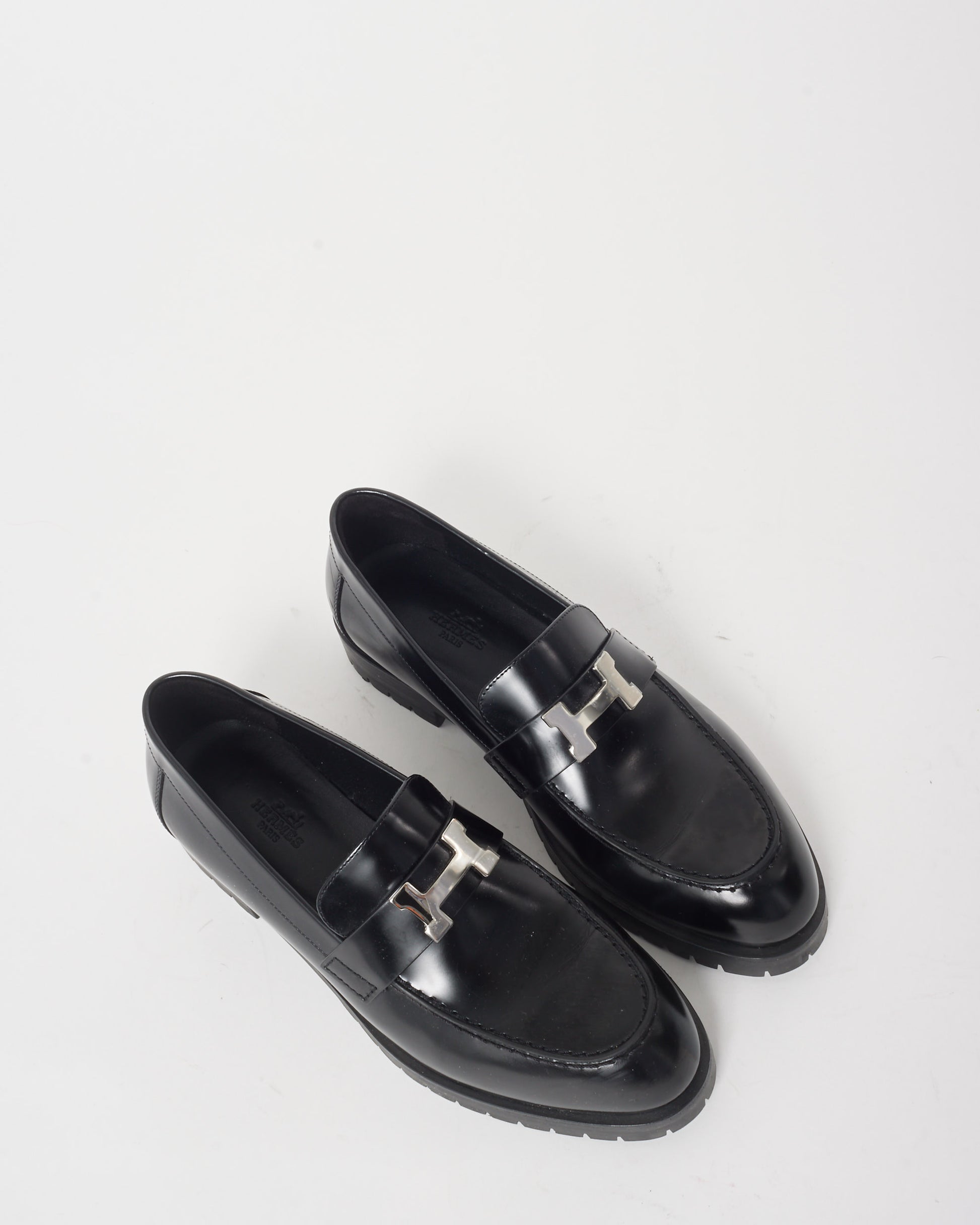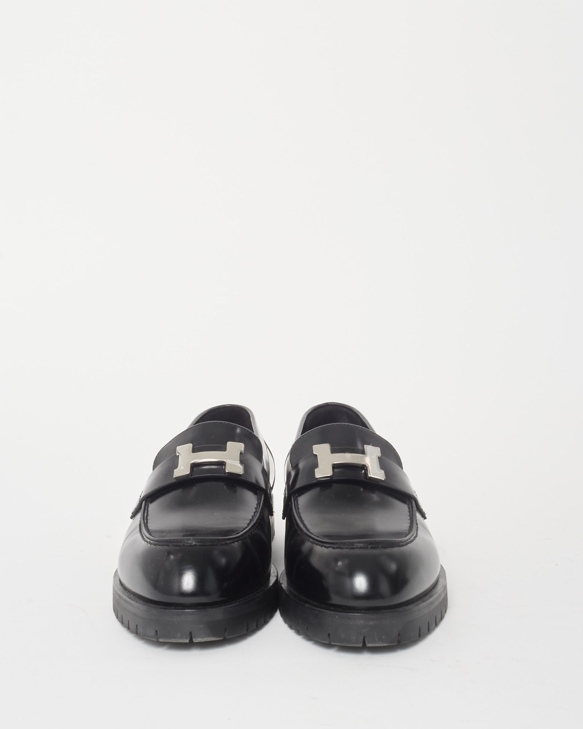 These are pre-owned authentic Hermès Faubourg Loafer is a sophisticated blend of classic design and modern elegance, crafted from premium black leather. This loafer features a notched sole and is adorned with a palladium-plated signature “H” detail, offering a chic yet casual style. Black glazed calfskin leather, notched black rubber sole. Palladium-plated “H” buckle, black lambskin insole and lining and made in Italy. Shop pre-owned authentic Hermès shoes and loafers at Retyche.