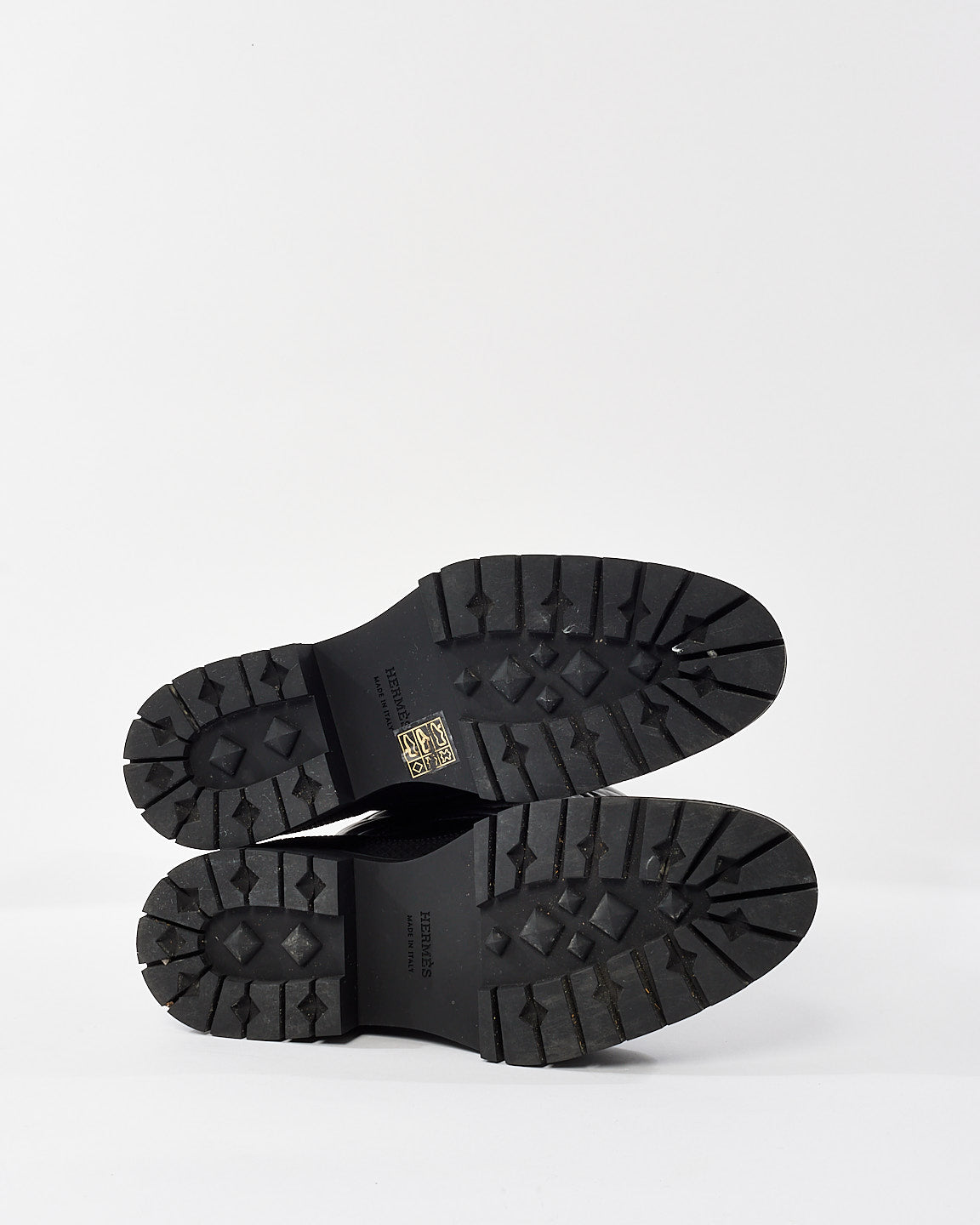 Explore Hermès's exquisite collection of shoes, featuring this certified pre-owned Black Leather Fuji High Shaft Boots - 37.5. Embodying timeless elegance and modern sustainability, each piece, including favorites like this, is authenticated by Retyche. Discover sustainable luxury — shop our current treasures or find inspiration for your next coveted find.