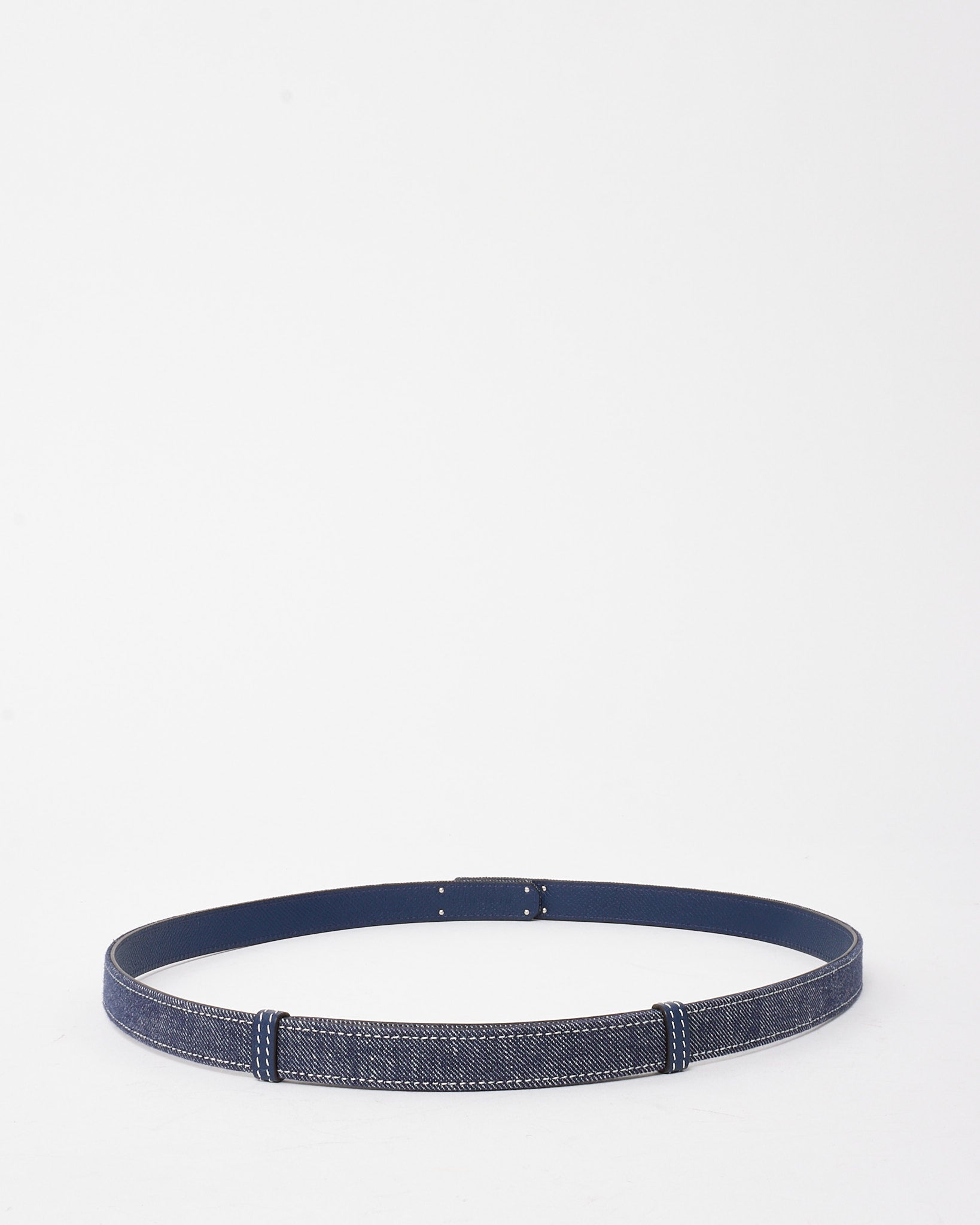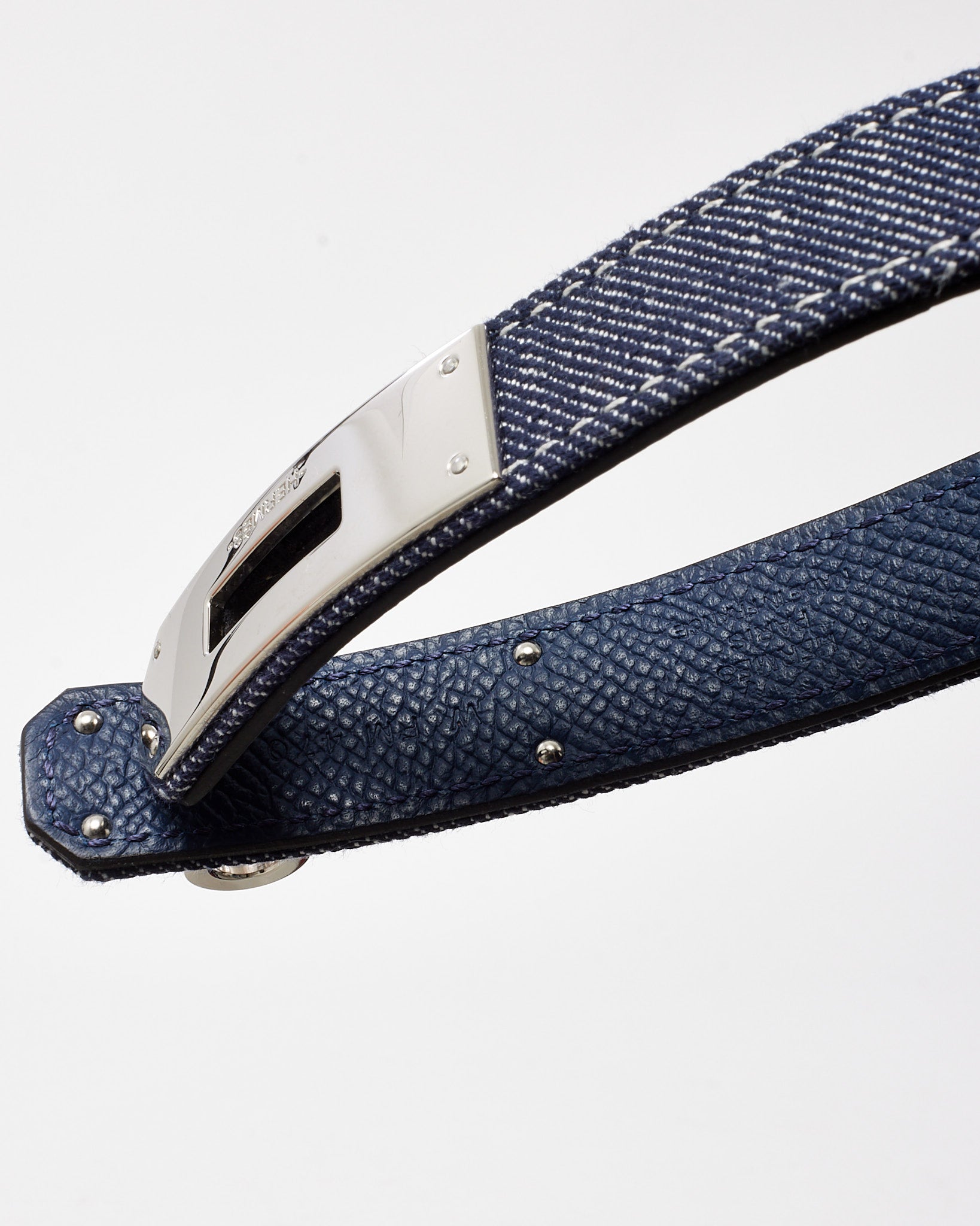 Make a striking statement with this pre-loved authentic Hermès Blue “Bleu Indigo/Blanc/Bleu Navy” Kelly Jean 18 Belt, an elevated take on the brand’s timeless sophistication. Crafted in rich indigo blue leather with white accent stitching and a polished palladium Kelly-style closure, this slender belt evokes the iconic silhouette of the Kelly bag in wearable form. Designed to cinch the waist with effortless Parisian elegance, the belt adds a refined edge to dresses, jackets, or tailored ensembles. An understated yet instantly recognizable piece, it’s perfect for those who appreciate the artistry and heritage of Hermès.