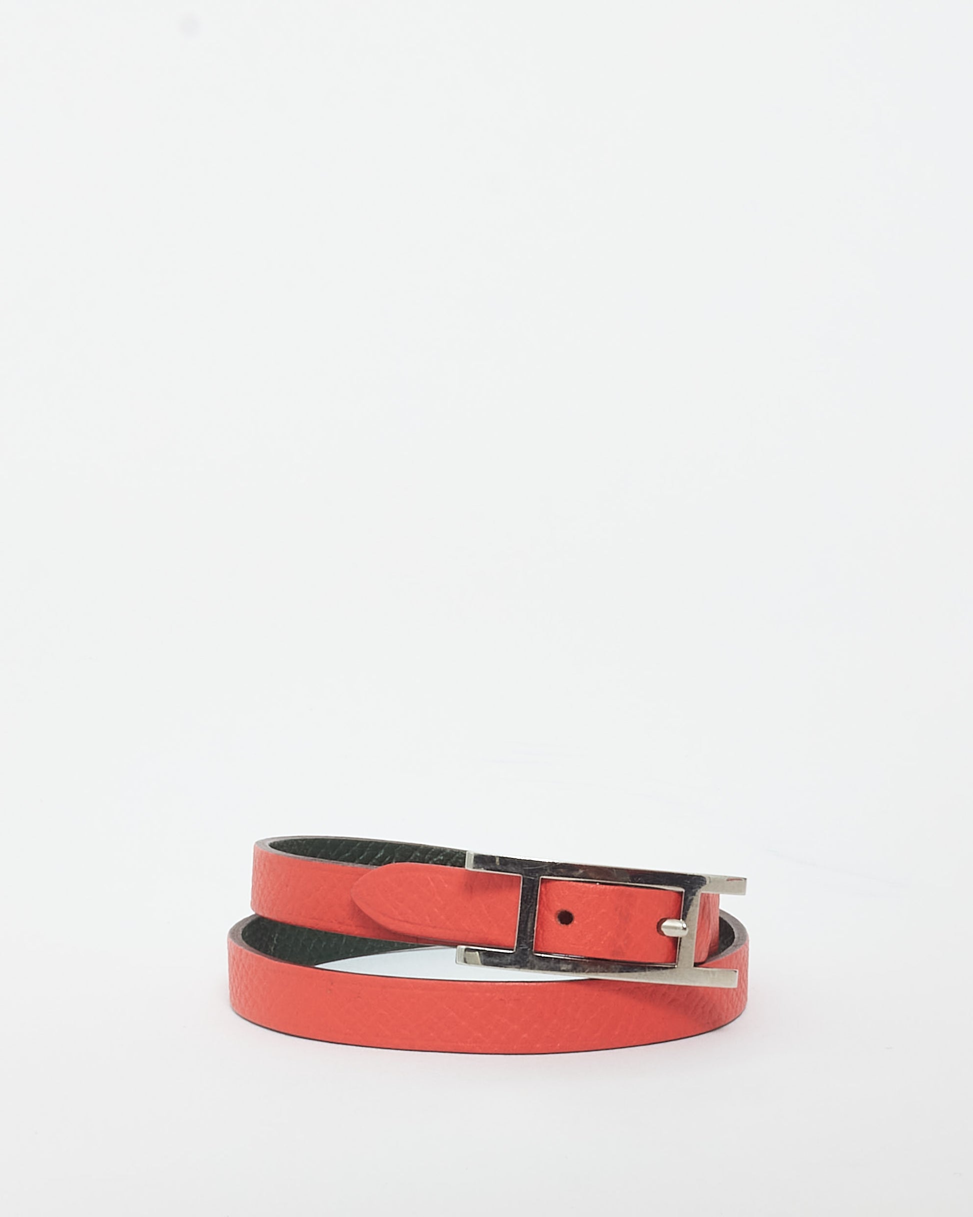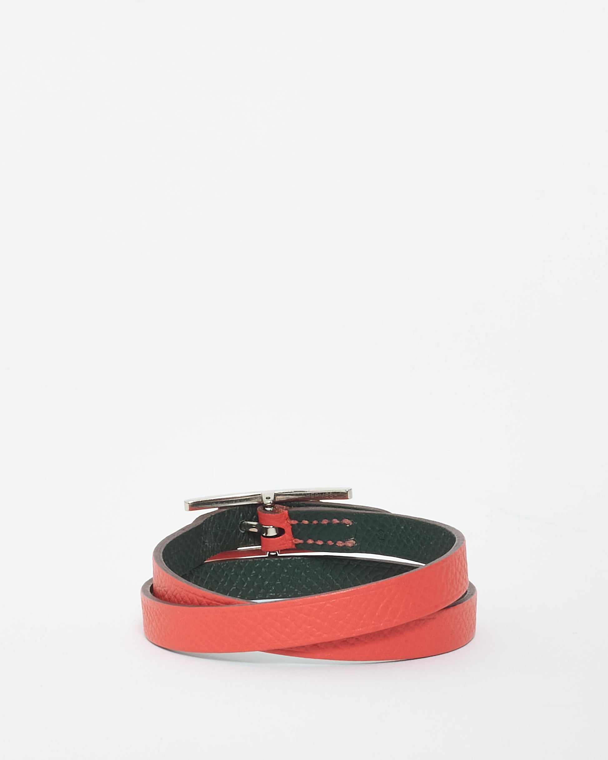 Explore Hermès's exquisite collection of accessories, featuring this certified pre-owned Coral/ Dark Green Leather Behapi Bracelet - S. Embodying timeless elegance and modern sustainability, each piece, including favorites like this, is authenticated by Retyche. Discover sustainable luxury — shop our current treasures or find inspiration for your next coveted find.