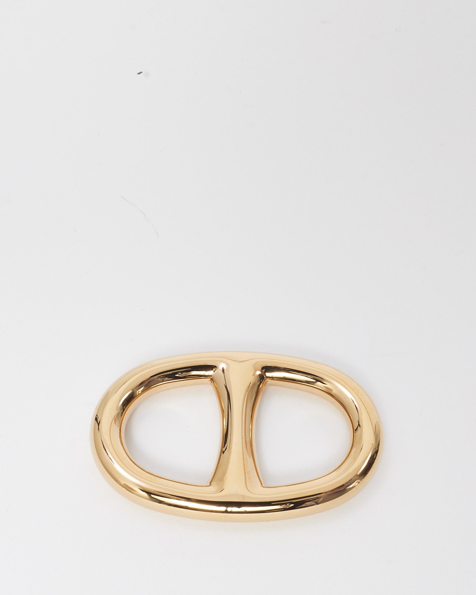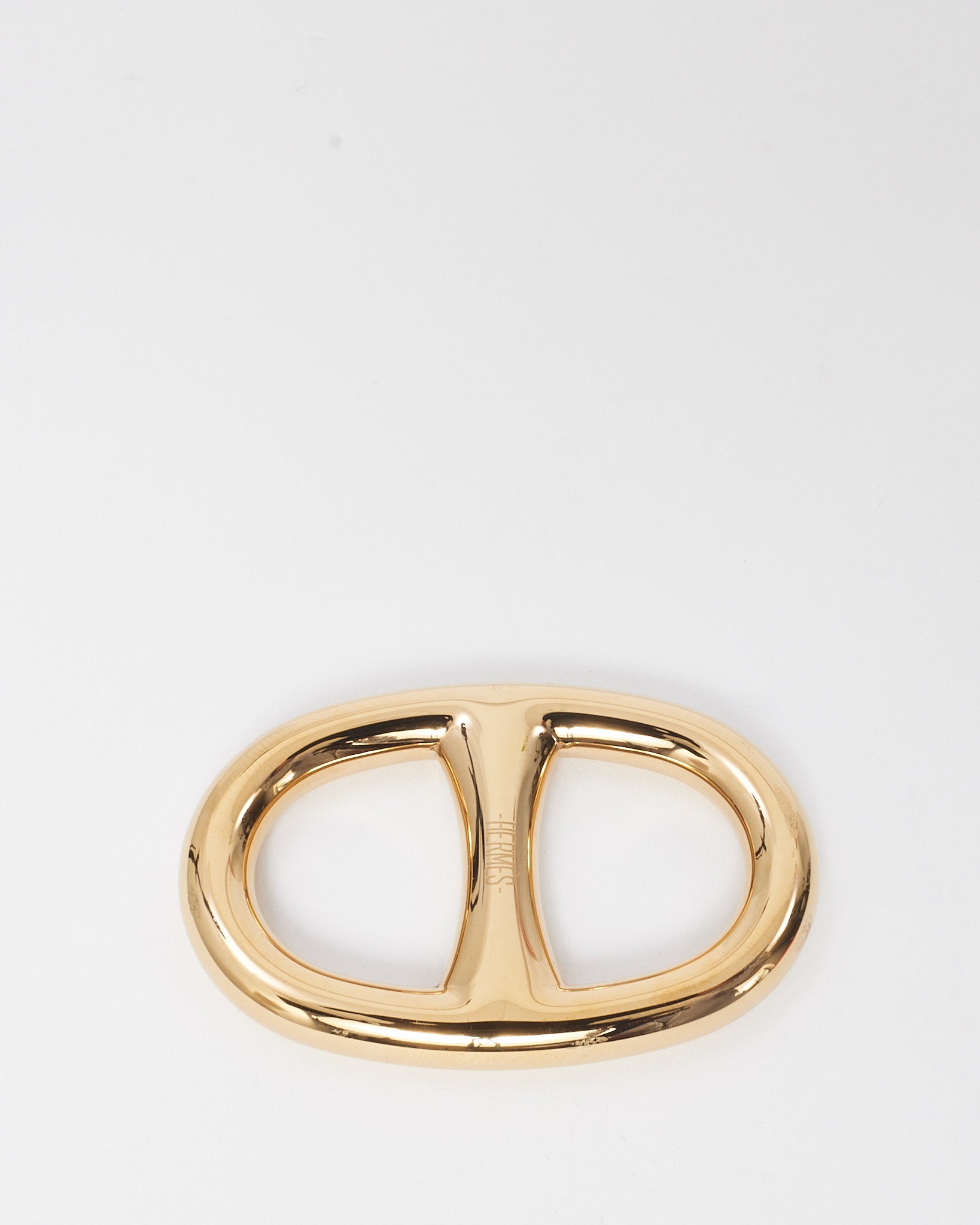 An elegant finishing touch for any silk scarf look, this pre-loved authentic Hermès Chaine d’Ancre scarf ring offers timeless Parisian sophistication. Crafted in polished gold-tone metal, the classic anchor chain motif nods to the house’s nautical heritage. Designed to pair effortlessly with 90cm carré scarves, it secures and styles your silk with understated luxury. Whether looped, knotted, or draped, this piece adds refined functionality and iconic Hermès flair to every ensemble.