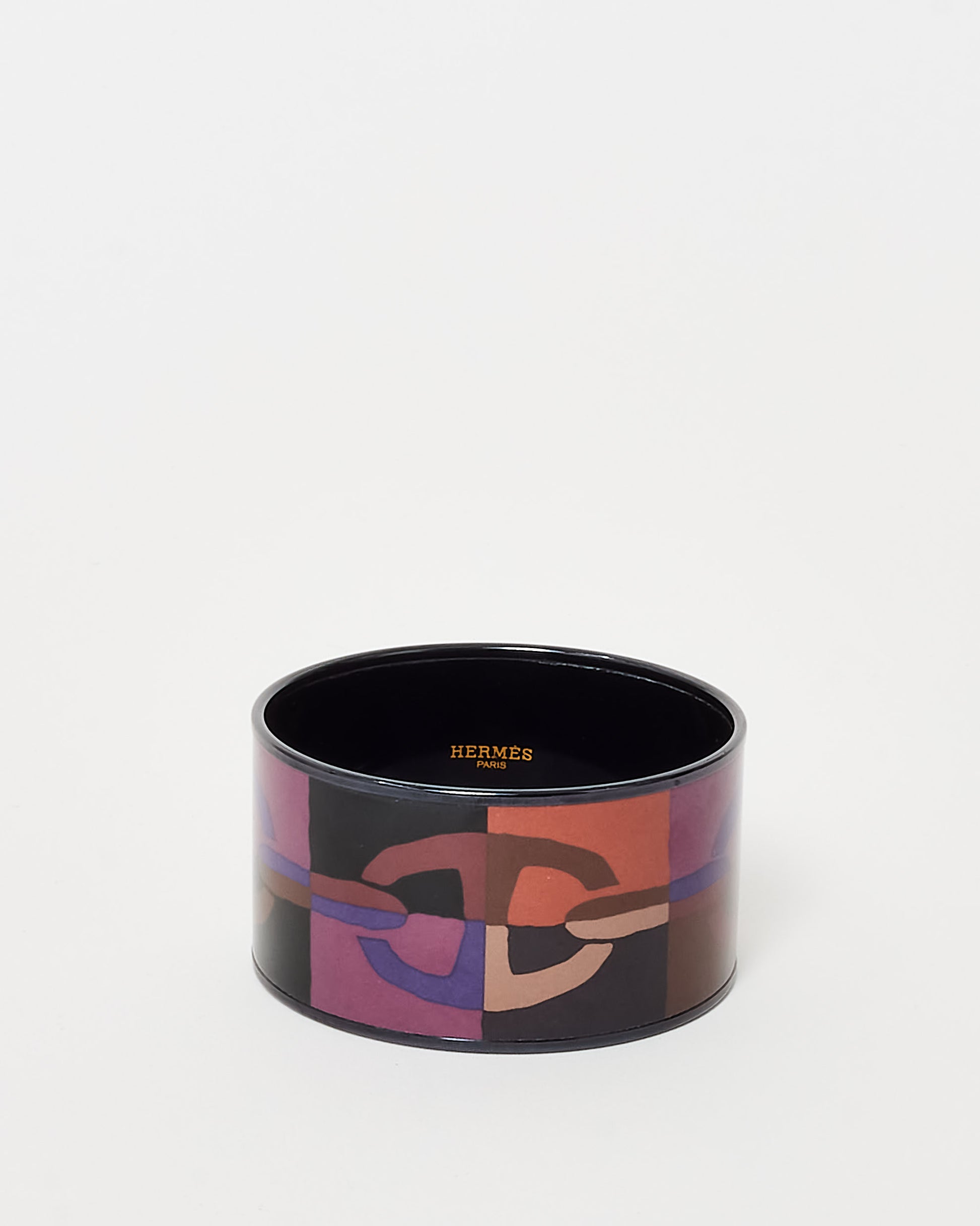 Make a bold style statement with this authentic pre-owned Hermès Purple and Brown Optique Chaine D’Ancre PVC Extra Wide Bangle, a modern take on the brand’s iconic Chaine d’Ancre motif. This striking accessory features a vibrant purple and brown optical design, creating a captivating visual effect that effortlessly catches the eye.
