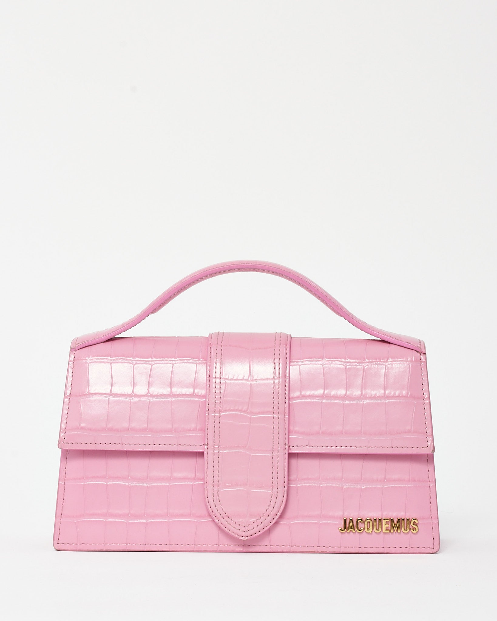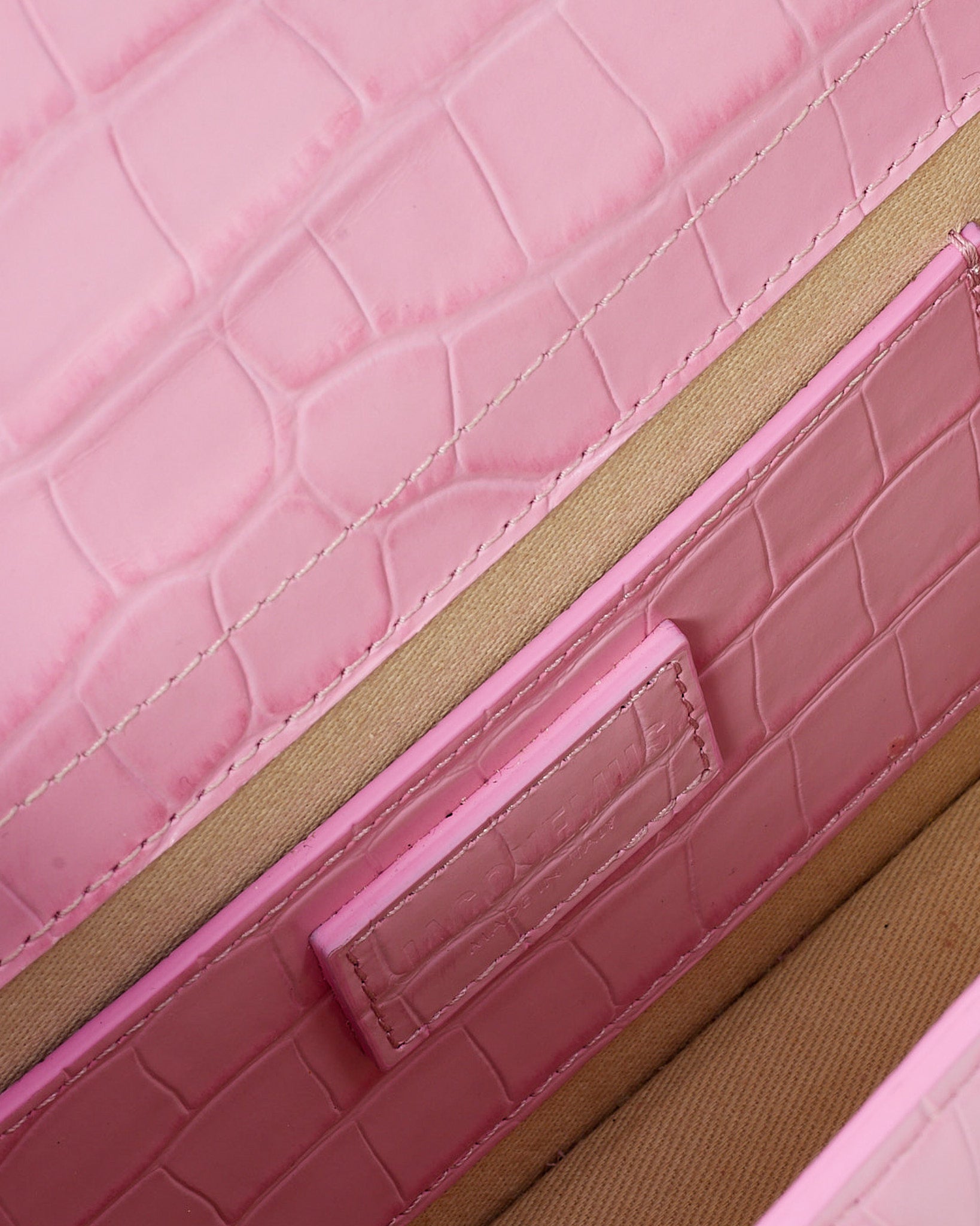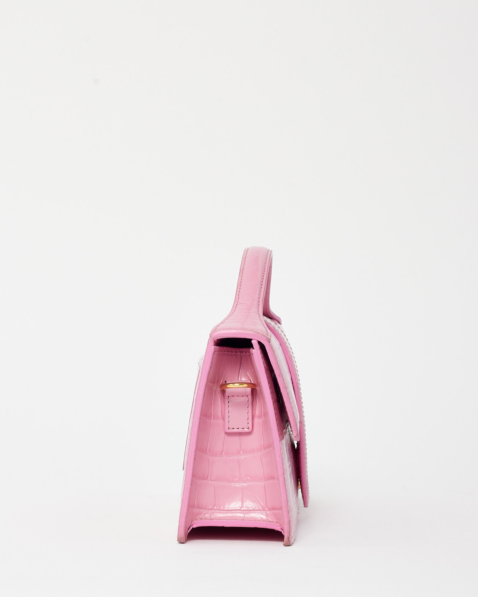 Make a playful yet polished statement with this pre-loved authentic Jacquemus Pink Croc Embossed Leather Le Grand Bambino Bag with Strap. Crafted from glossy pink croc-embossed leather, this structured silhouette features the brand’s signature flap front, sleek top handle, and a detachable strap for crossbody or shoulder wear. The gold-tone logo plaque and compact interior add a luxe finish to this fashion-forward piece. Bold and feminine, it’s the perfect pop of color to elevate your day-to-night wardrobe.