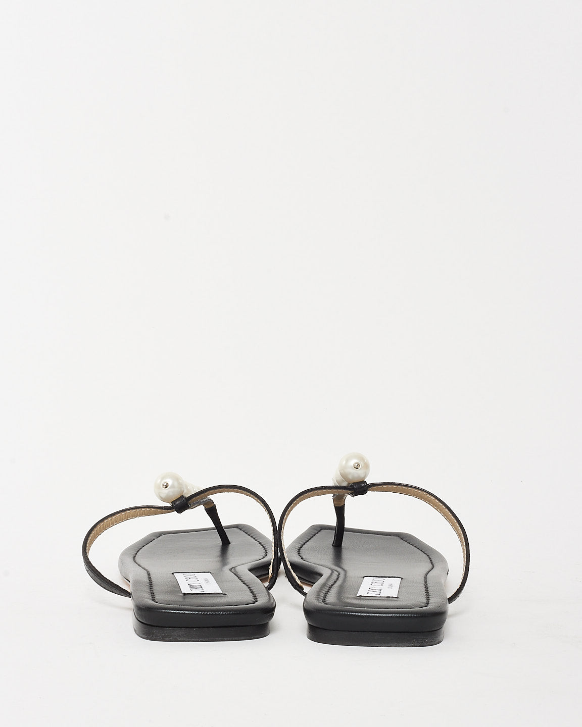 A glamorous take on a modern classic, these authentic pre-owned Jimmy Choo Black Leather Pearl Alaina Sandals in size 38.5 are a statement in sophistication. Crafted from sleek black leather, the strappy silhouette is adorned with luminous pearl accents that lend a touch of refined drama.