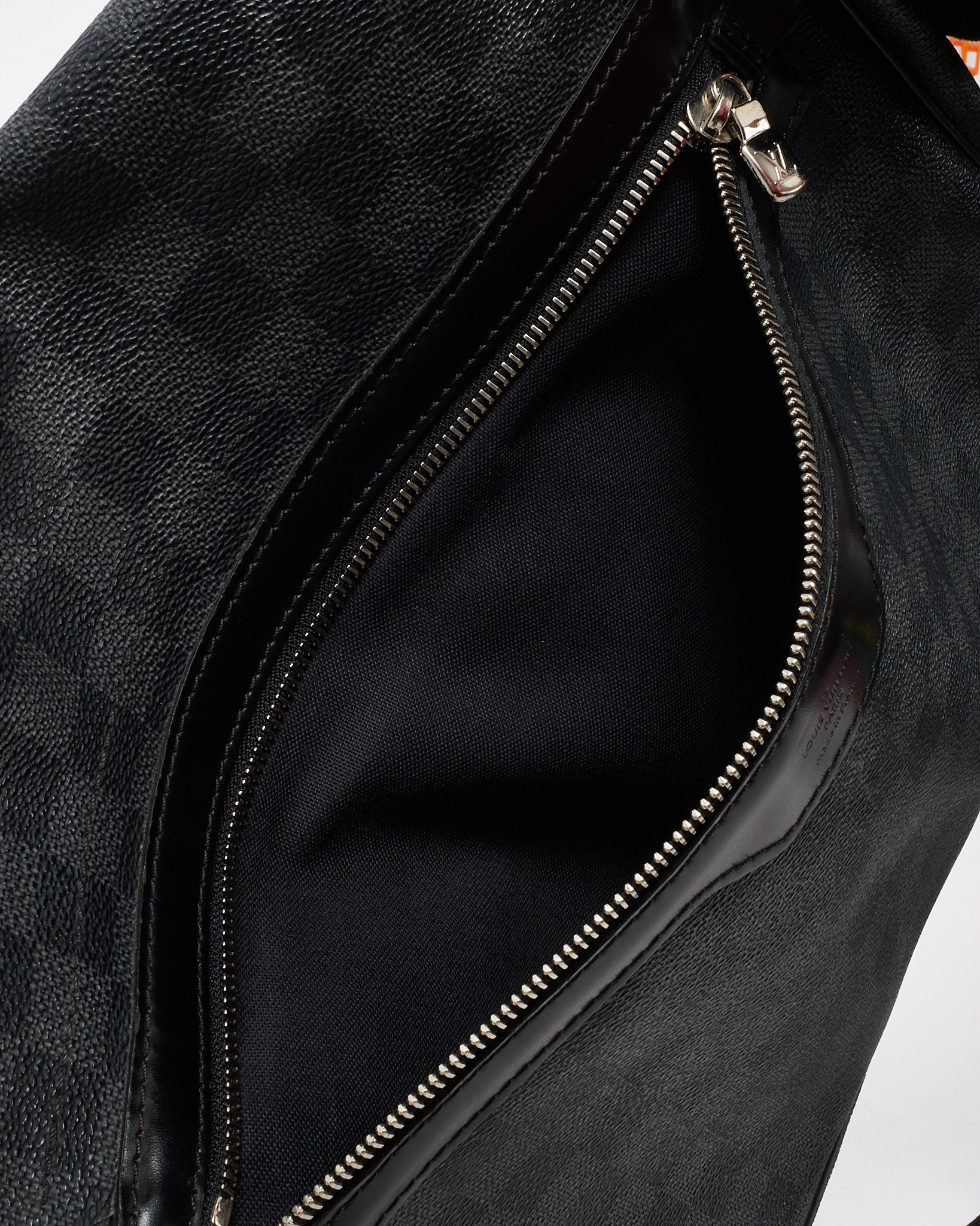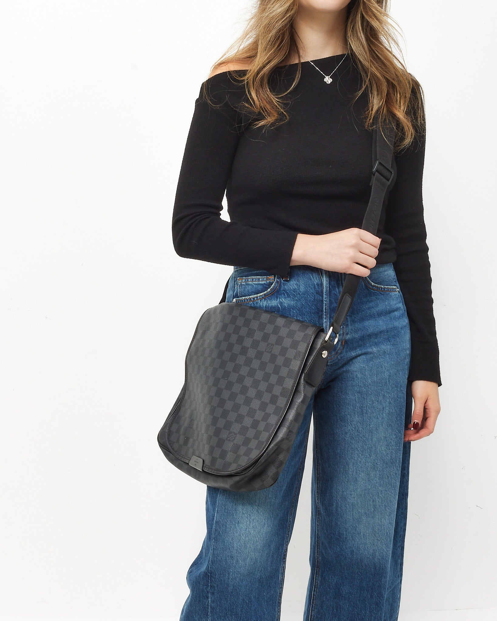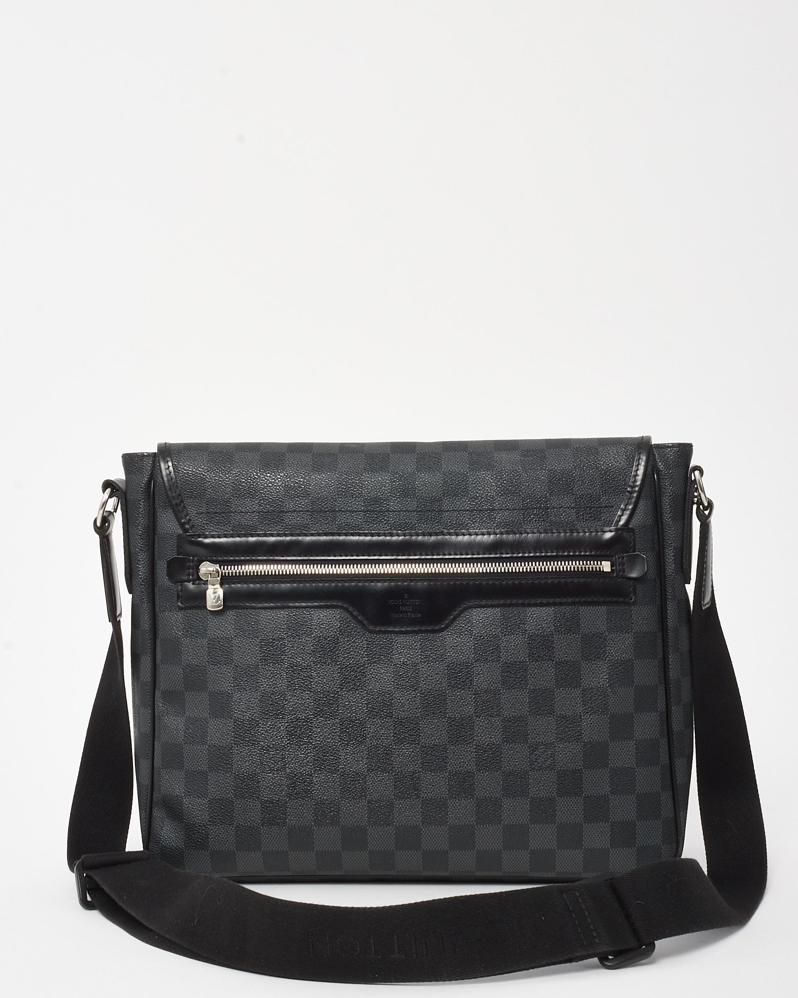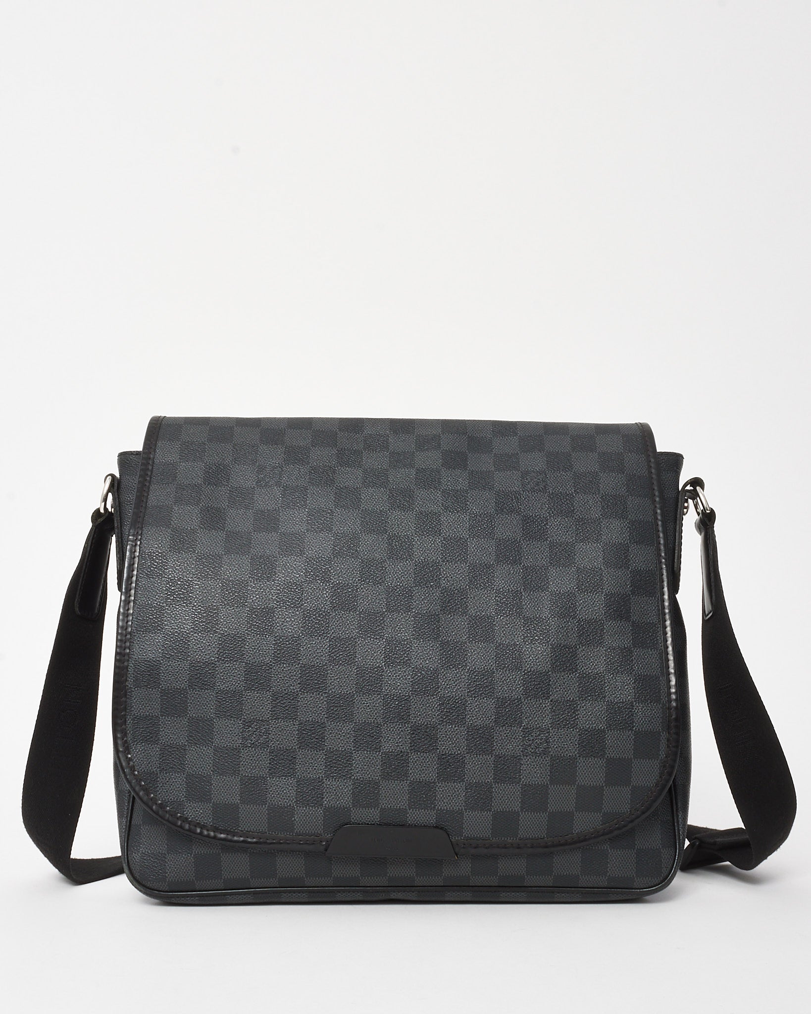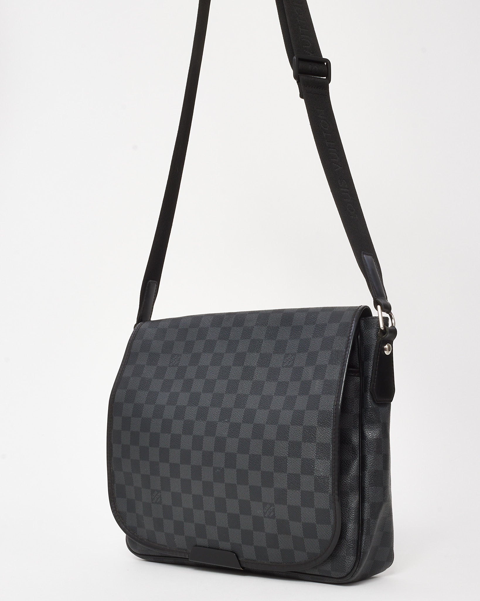 Modern and refined, this pre-owned authentic Louis Vuitton Daniel MM Messenger Bag is crafted from black Damier Graphite coated canvas with smooth leather trim and sleek silver-tone hardware. The structured yet lightweight silhouette features an adjustable shoulder strap, back zip pocket, and a spacious textile-lined interior with organized compartments.