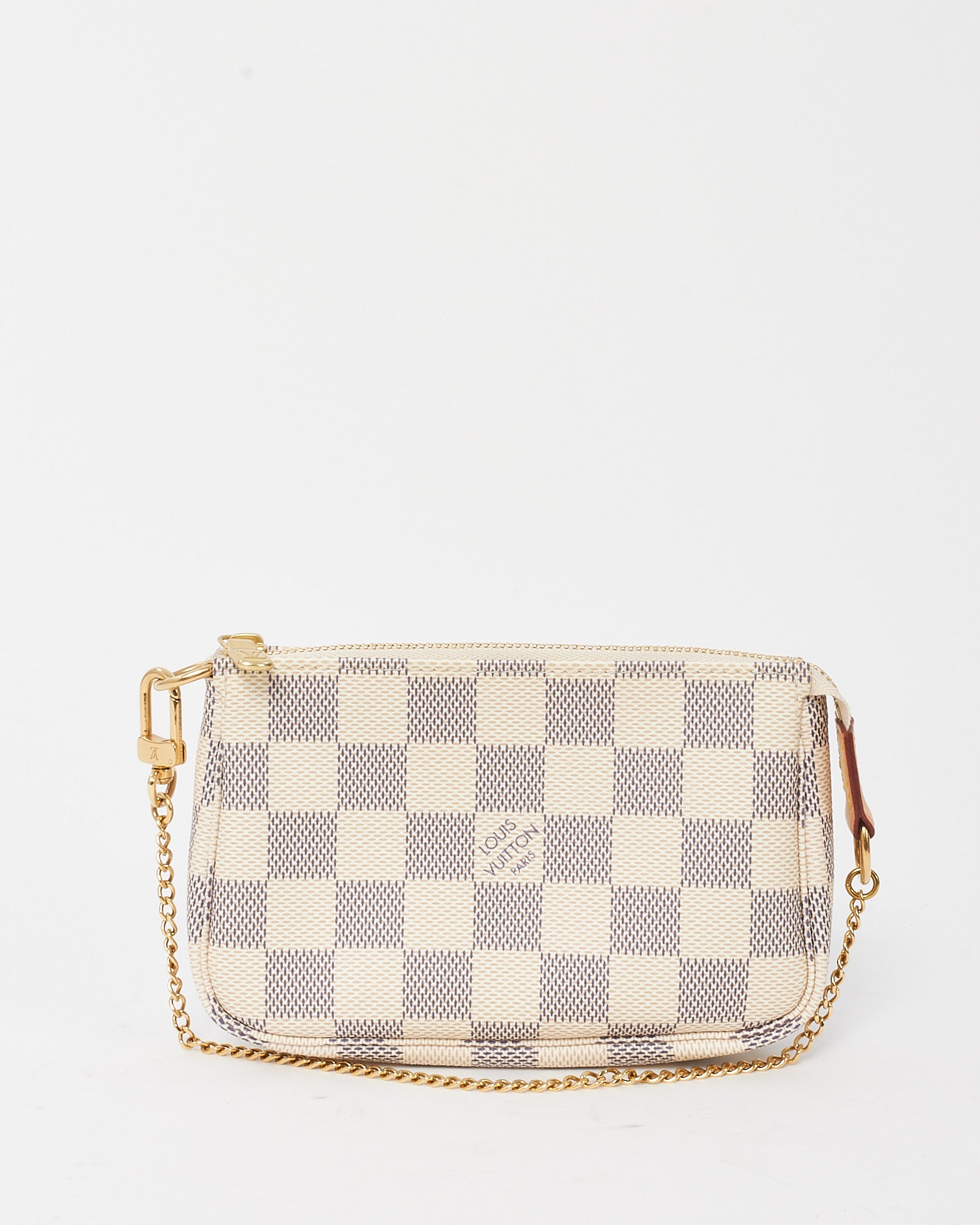 A compact icon of effortless sophistication, this pre-loved authentic Louis Vuitton Mini Pochette Accessoires is crafted in signature Damier Azur coated canvas with natural cowhide leather trim. Accented with gold-tone hardware and a top zip closure, this versatile pouch opens to a sleek textile-lined interior perfect for holding daily essentials or small valuables. Finished with a short chain strap, it can be worn as a mini clutch, slipped into a larger bag, or attached to a D-ring for added functionality. A timeless and chic addition to any designer collection.