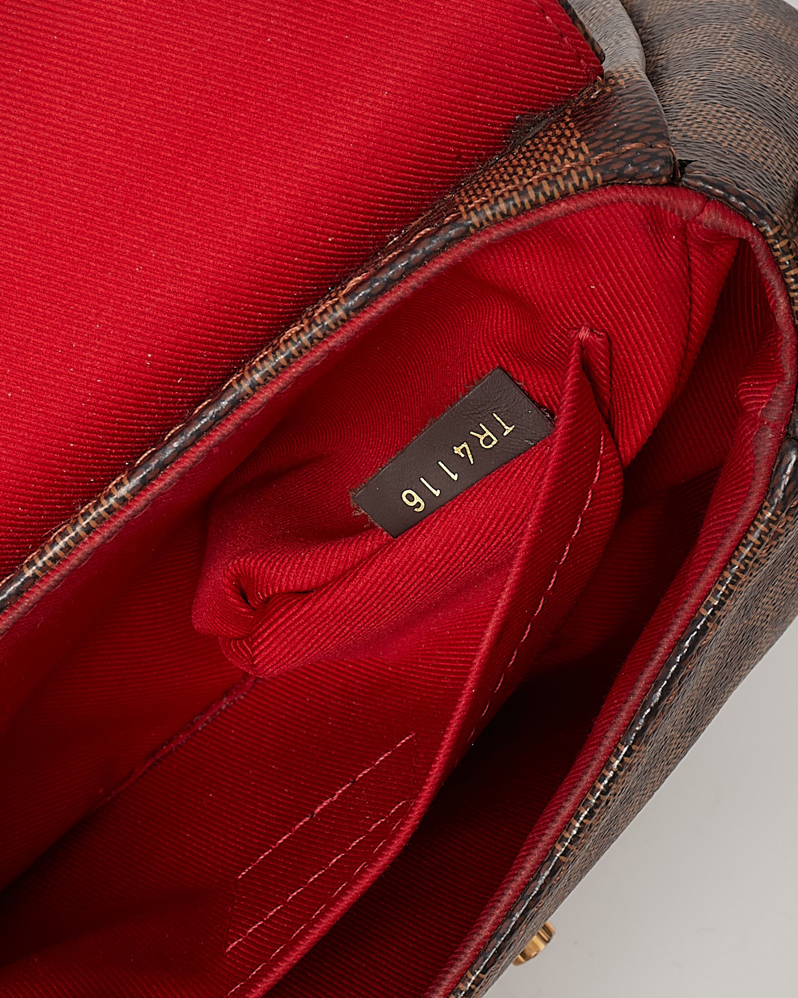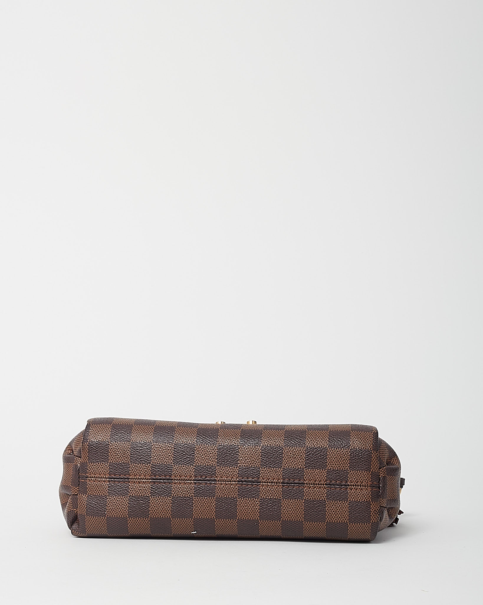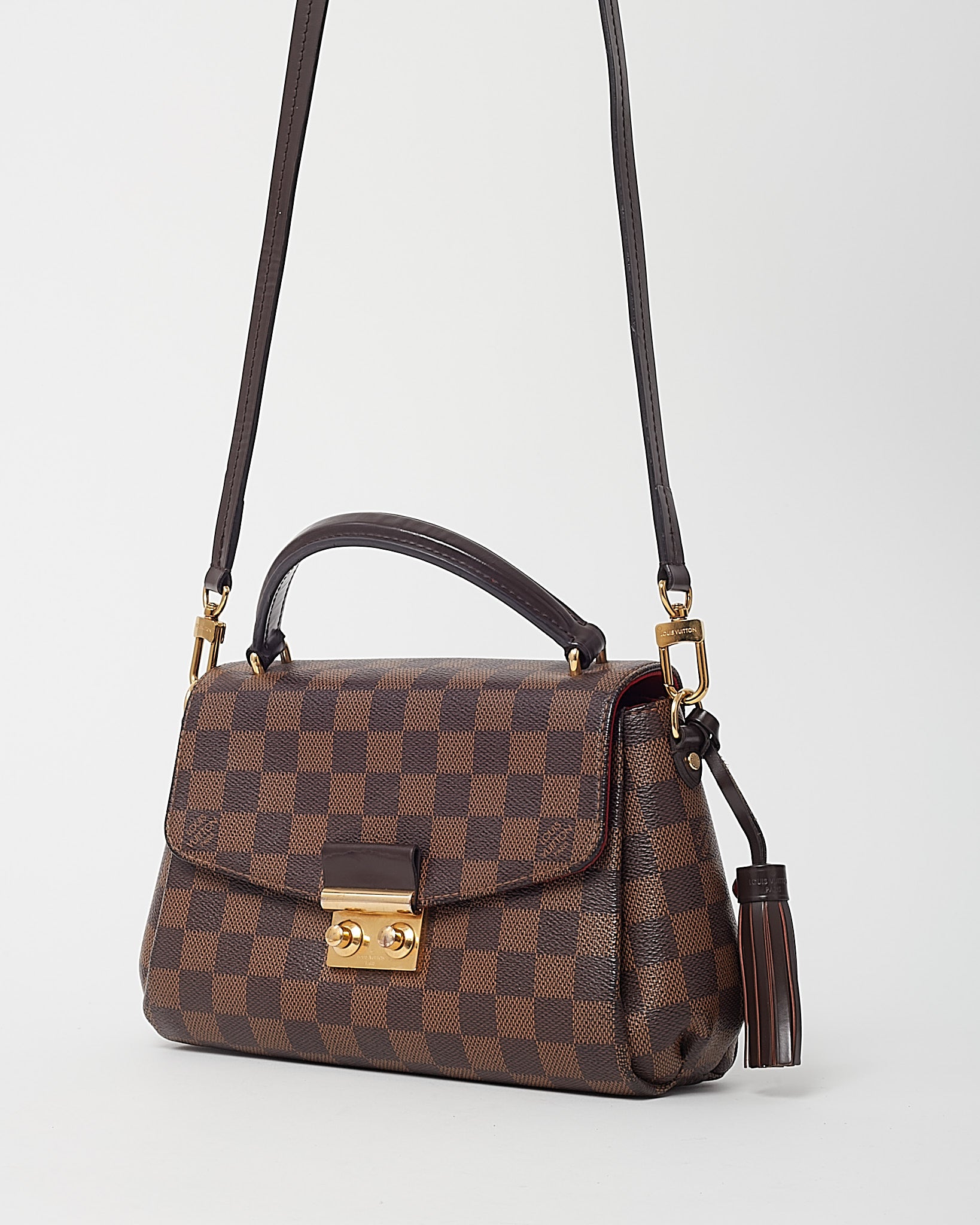 Add effortless sophistication to your everyday rotation with this pre-loved authentic Louis Vuitton Damier Ebene Canvas Croisette Bag with Strap, crafted in the house’s iconic Damier Ebene coated canvas with rich leather trim. The structured silhouette is accented with a signature S-lock closure and finished with polished gold-tone hardware for a refined touch. Designed with a top handle and detachable strap for versatile crossbody or handheld wear, this Louis Vuitton bag offers both style and practicality. A timeless LV piece that blends classic checkerboard patterning with modern functionality and elegant design.