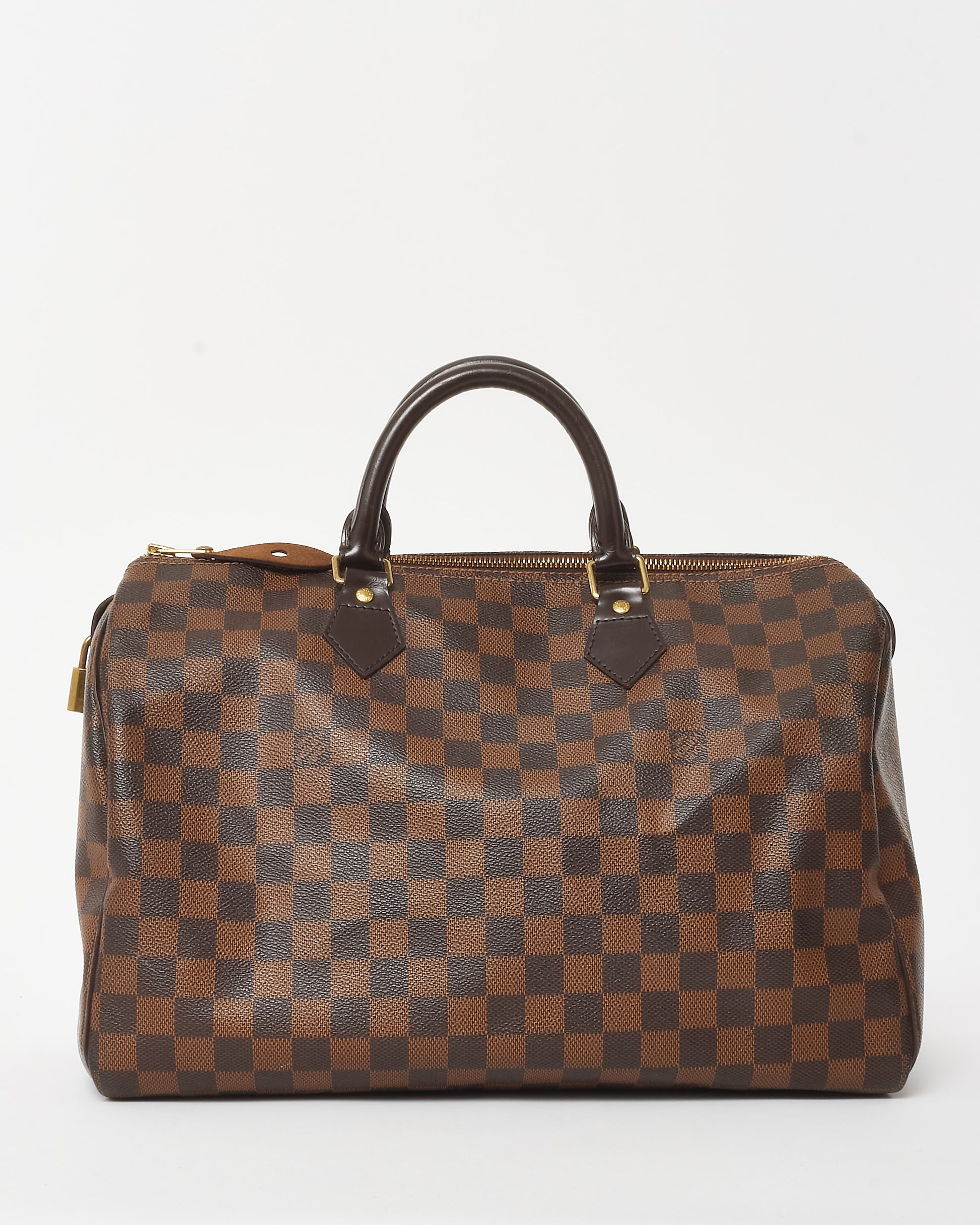 An enduring icon of luxury, this authentic pre-owned Louis Vuitton Damier Ebene Speedy 35 Bag is the epitome of timeless elegance and everyday practicality. Crafted from the house’s signature coated canvas with smooth chocolate brown leather trim, this spacious silhouette is perfect for life on the go.