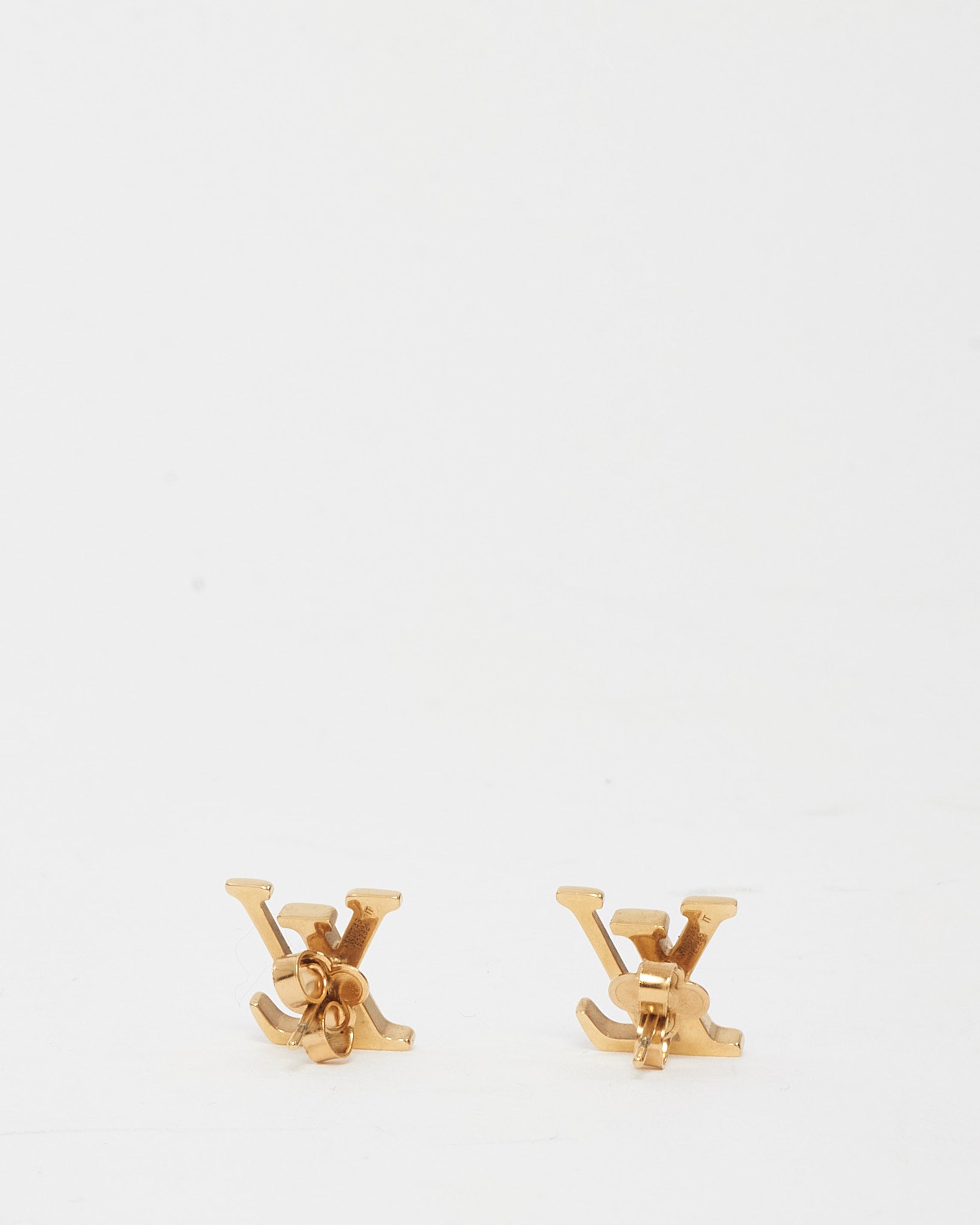 Make an effortless statement with these pre-loved authentic Louis Vuitton Gold Metal LV Logo Iconic Earrings. Crafted from polished gold-tone metal, this bold pair showcases the instantly recognizable LV initials in a sleek, sculptural design. Lightweight yet impactful, they offer a refined way to incorporate iconic branding into your everyday wardrobe. Whether styled with casual denim or evening ensembles, these earrings bring a touch of Parisian luxury and timeless elegance to any look.