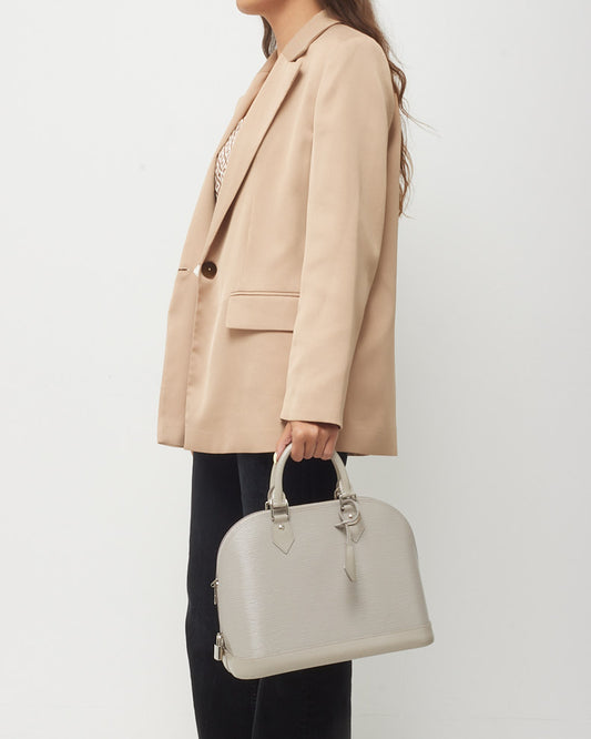Structured, sophisticated, and endlessly versatile, this pre-loved authentic Louis Vuitton Alma PM is crafted from textured grey Epi leather and finished with silver-tone hardware. The timeless dome silhouette is enhanced with a detachable shoulder strap for hands-free wear, and dual top handles for classic carry.