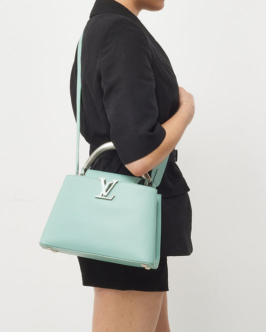 Understated elegance with a contemporary twist, this pre-loved authentic Louis Vuitton Capucines BB is crafted from supple light blue Taurillon leather and elevated by a sculptural matte brushed metal top handle. The compact yet structured silhouette features the iconic LV initials, a flap closure that can be styled two ways, and a removable shoulder strap for versatile wear.