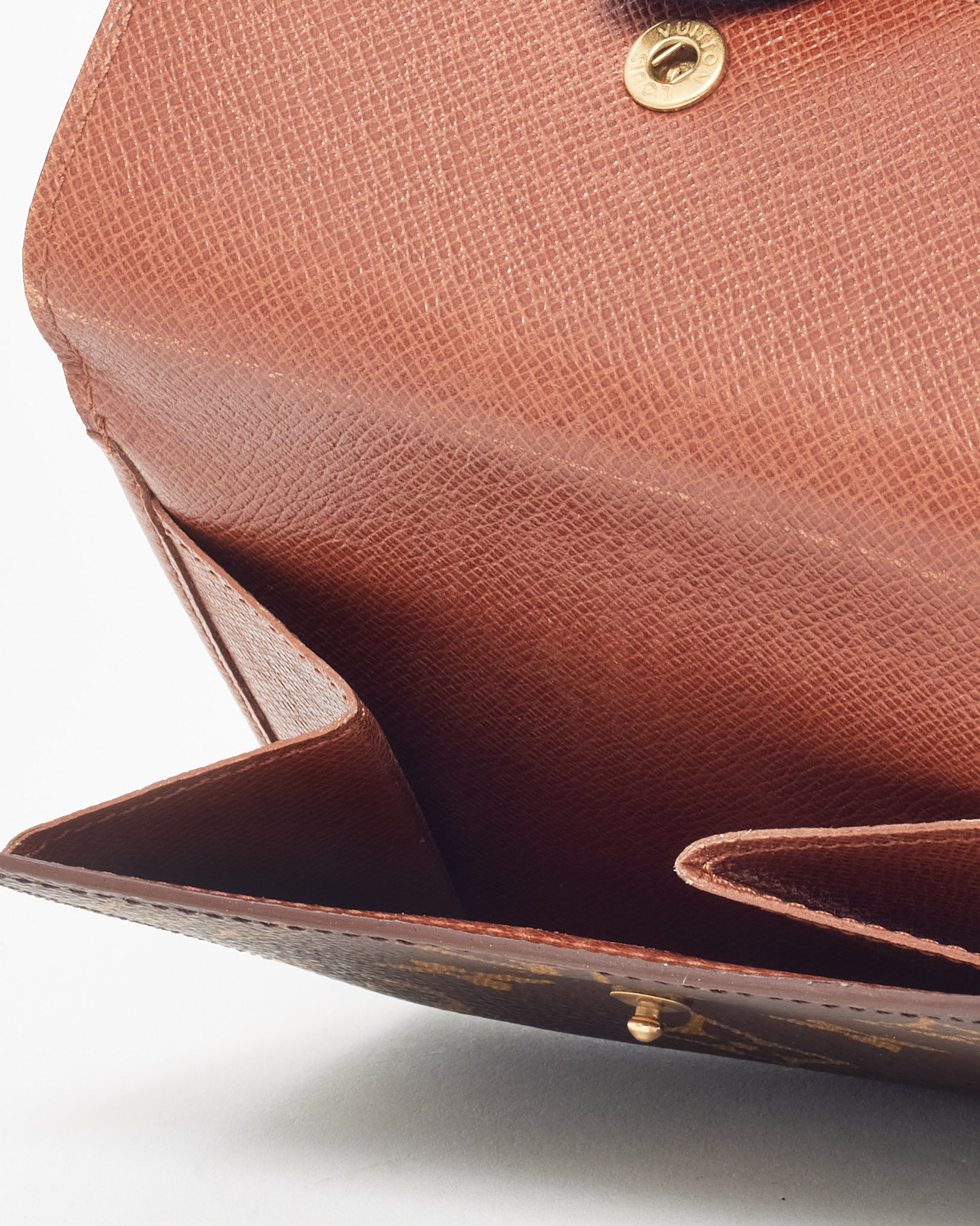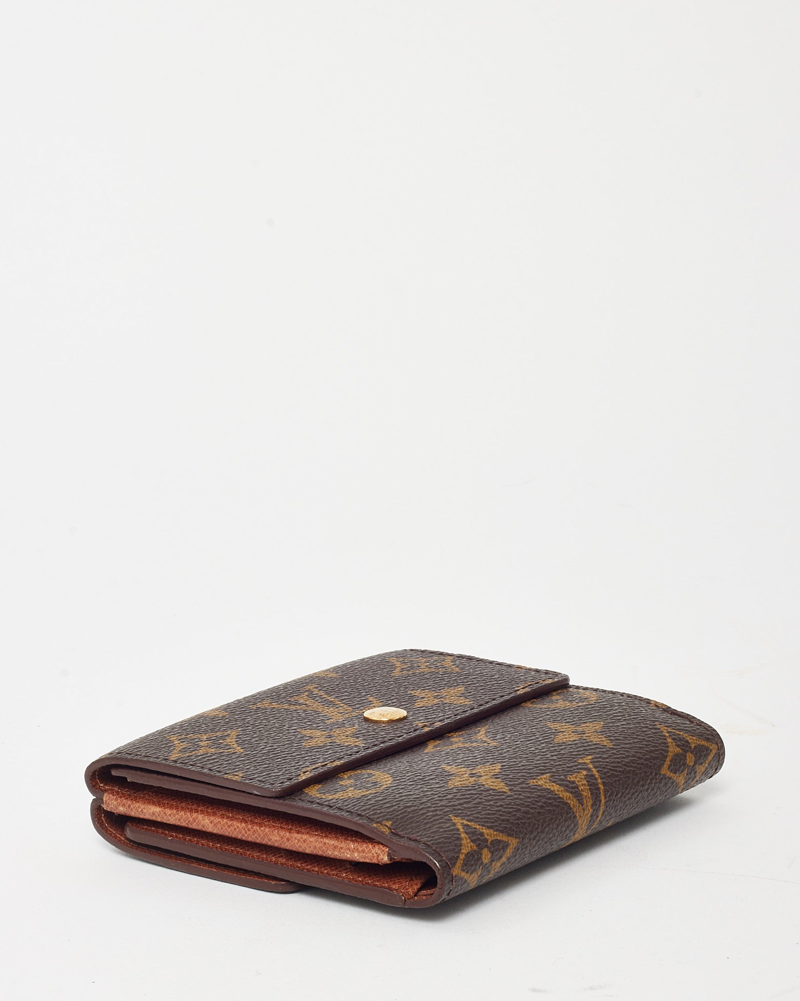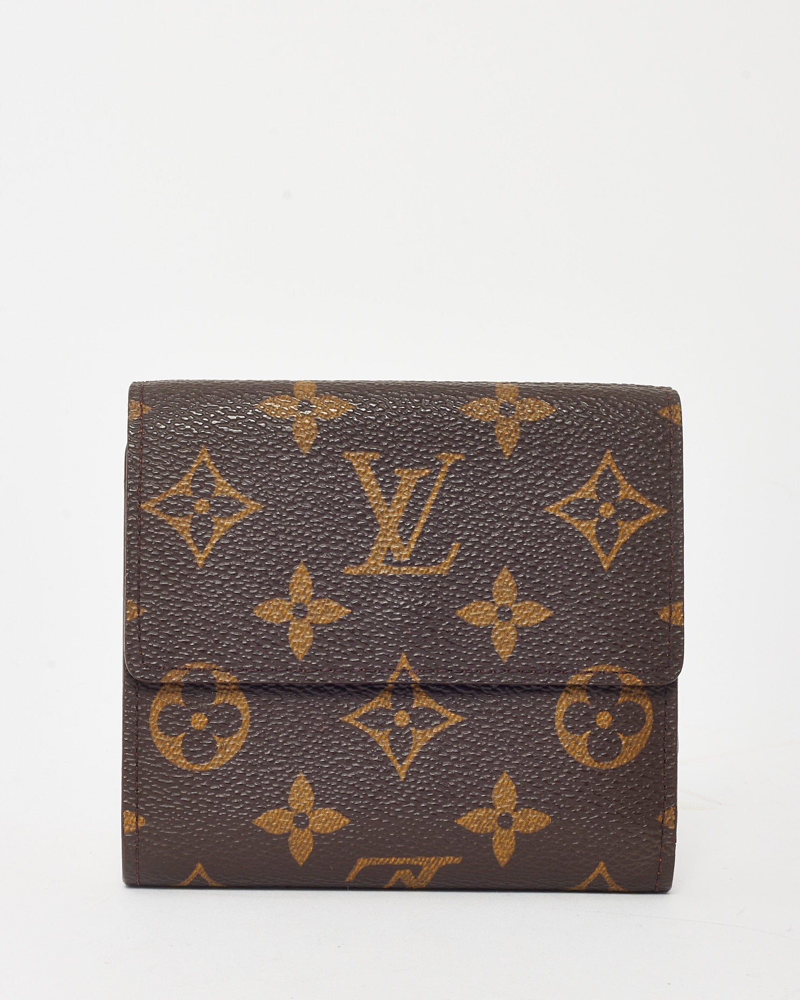 Streamline your essentials with this pre-loved authentic Louis Vuitton Monogram Canvas Elise Double Hook Compact Wallet. Crafted from classic monogram coated canvas with a smart bifold design, this wallet features two secure snap closures that open to reveal a coin pocket, card slots, and a bill compartment. Its square, compact shape fits easily into smaller bags while still offering practical organization. Durable and timeless, it’s the perfect everyday accessory with iconic Louis Vuitton appeal.