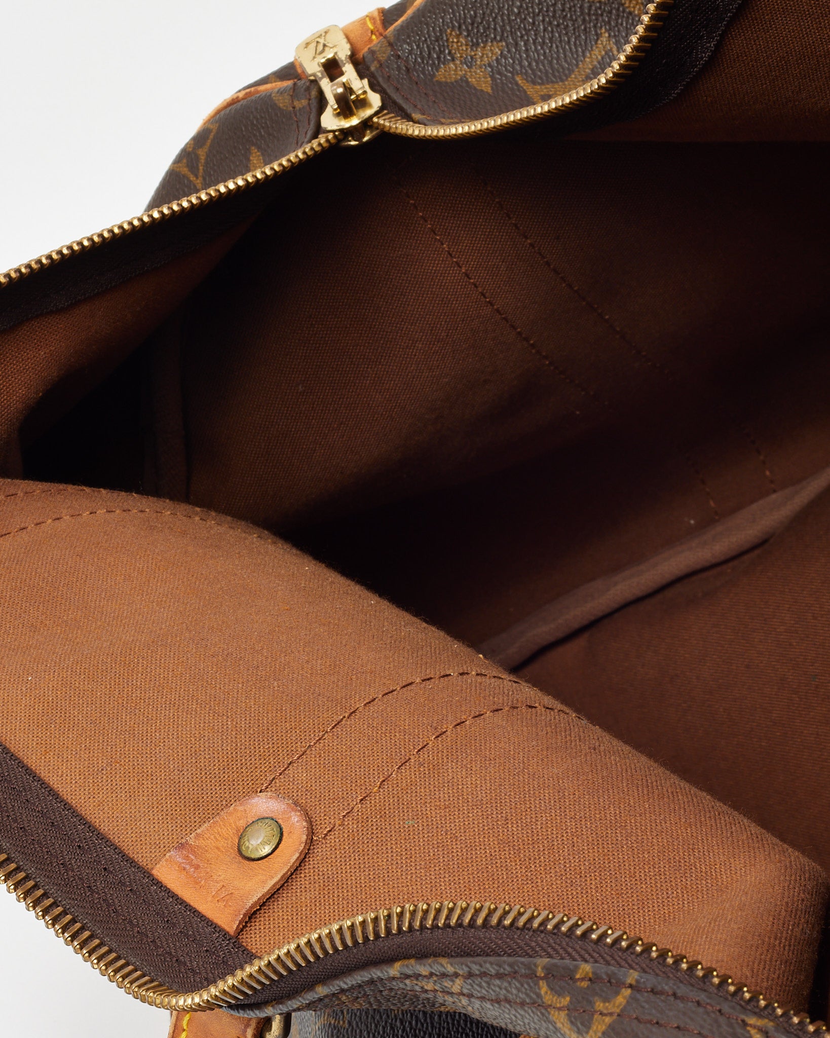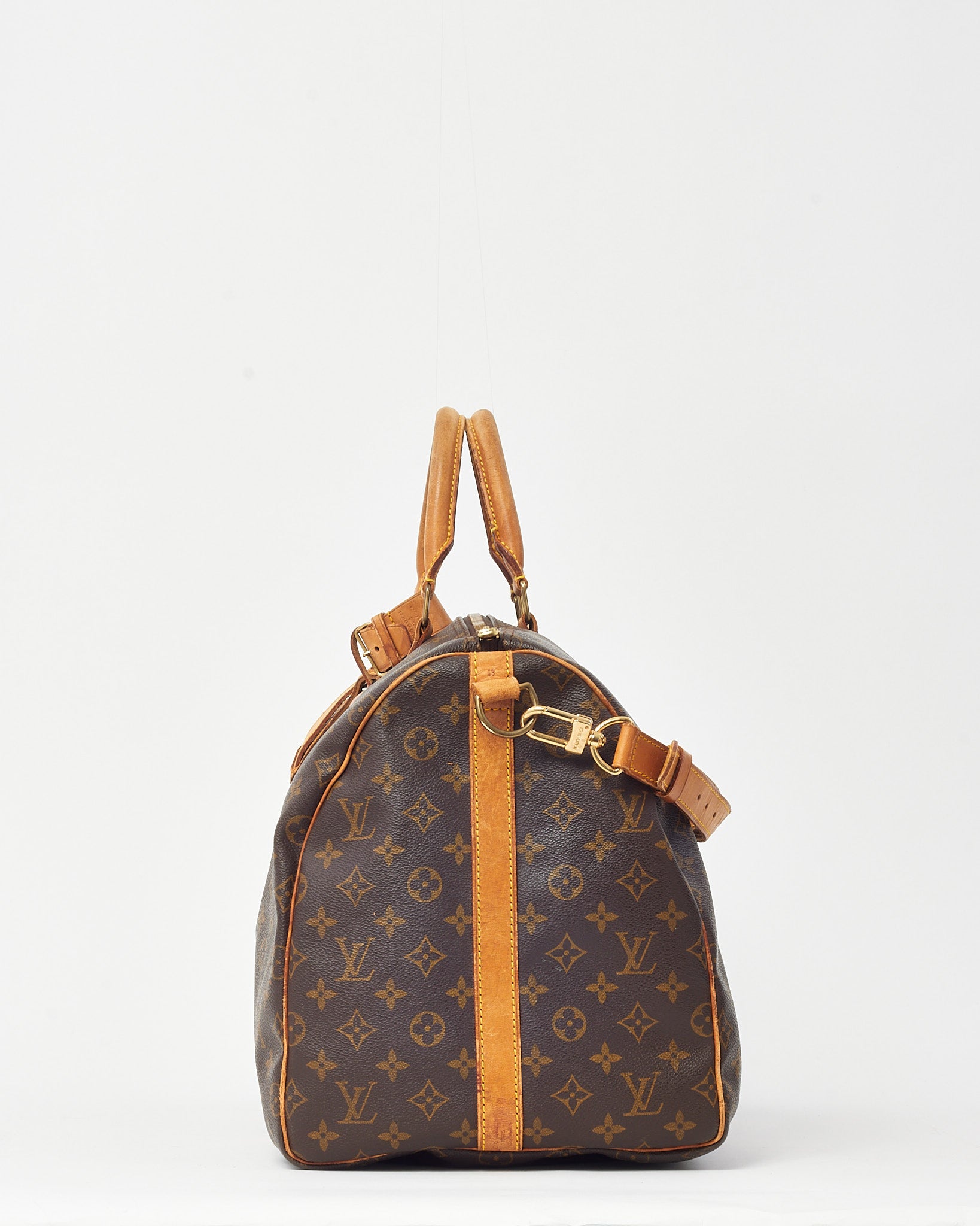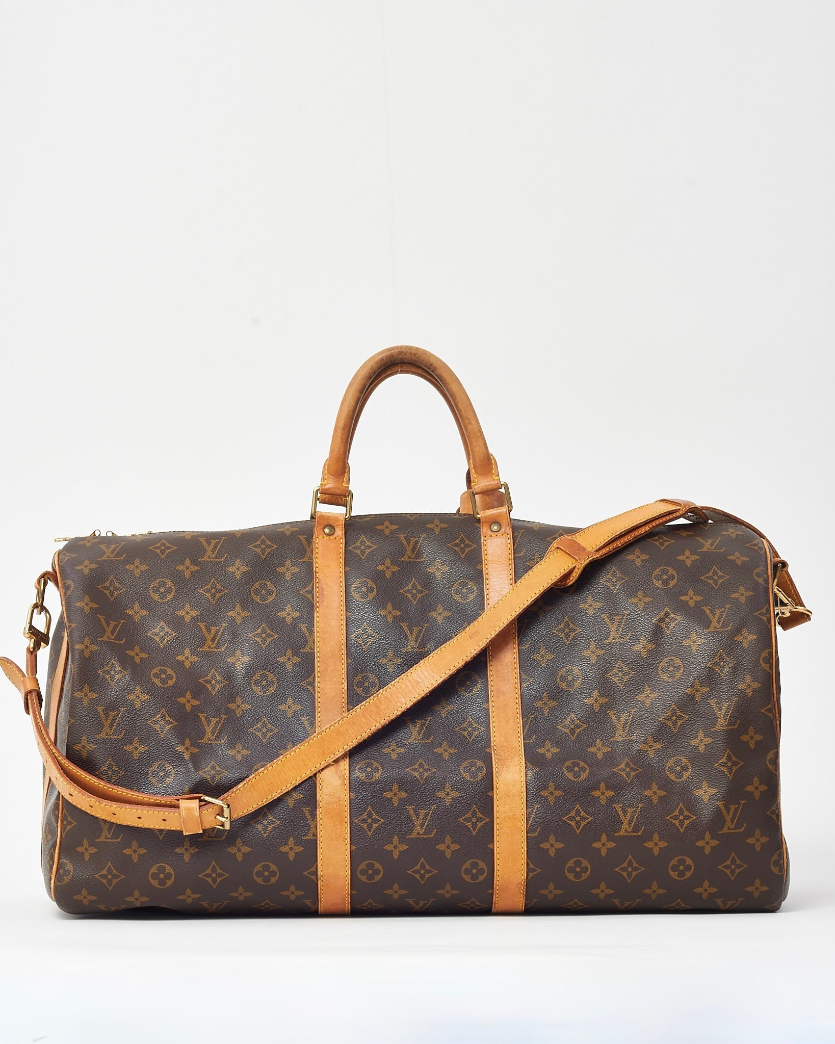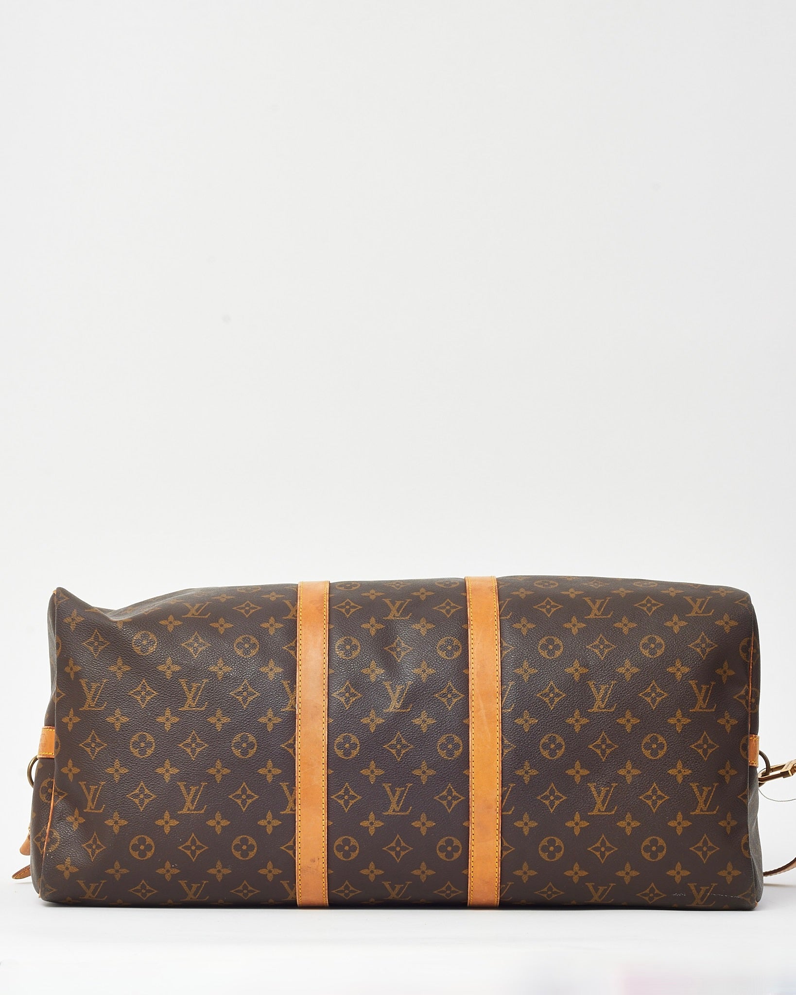 Travel in iconic style with this pre-loved authentic Louis Vuitton Monogram Coated Canvas Keepall Bandoulière 55, crafted in the house’s signature monogram coated canvas with natural leather trim. The spacious 55cm silhouette offers ample room for weekend getaways or carry-on travel, while rolled leather handles and a detachable shoulder strap provide versatile carrying options. Finished with polished hardware and a secure zip-top closure, this Louis Vuitton duffle bag blends timeless heritage with practical functionality. A coveted LV travel staple that delivers enduring craftsmanship, luxury appeal, and effortless sophistication.