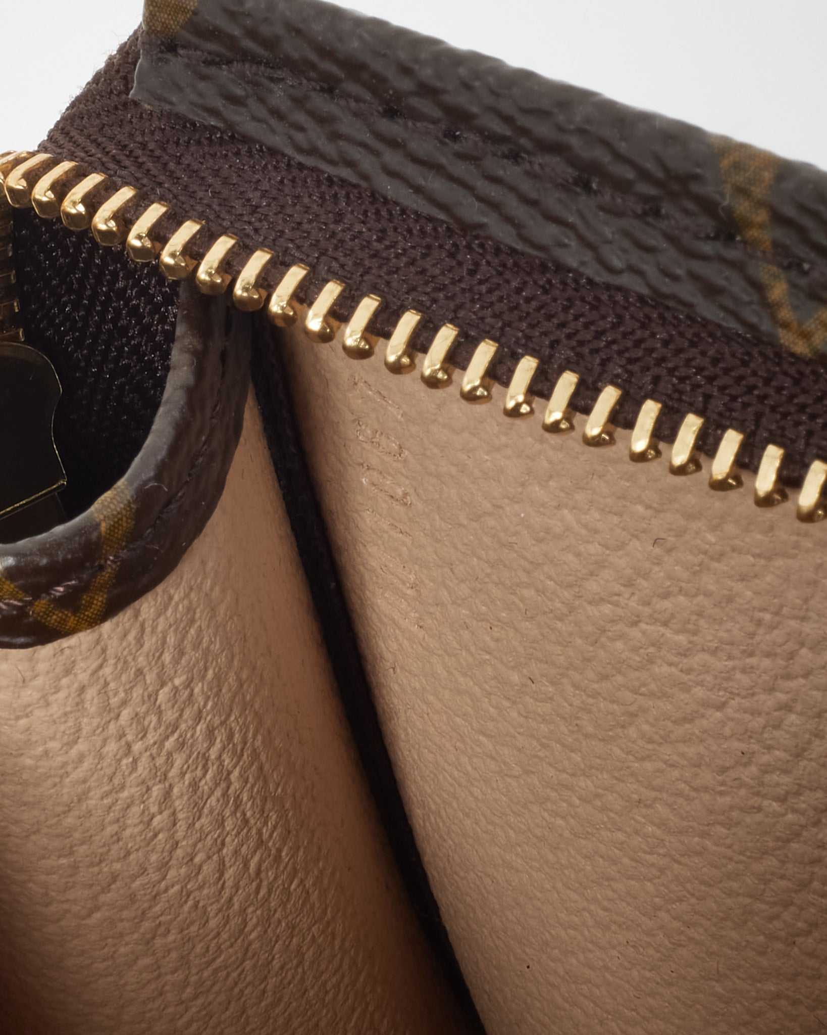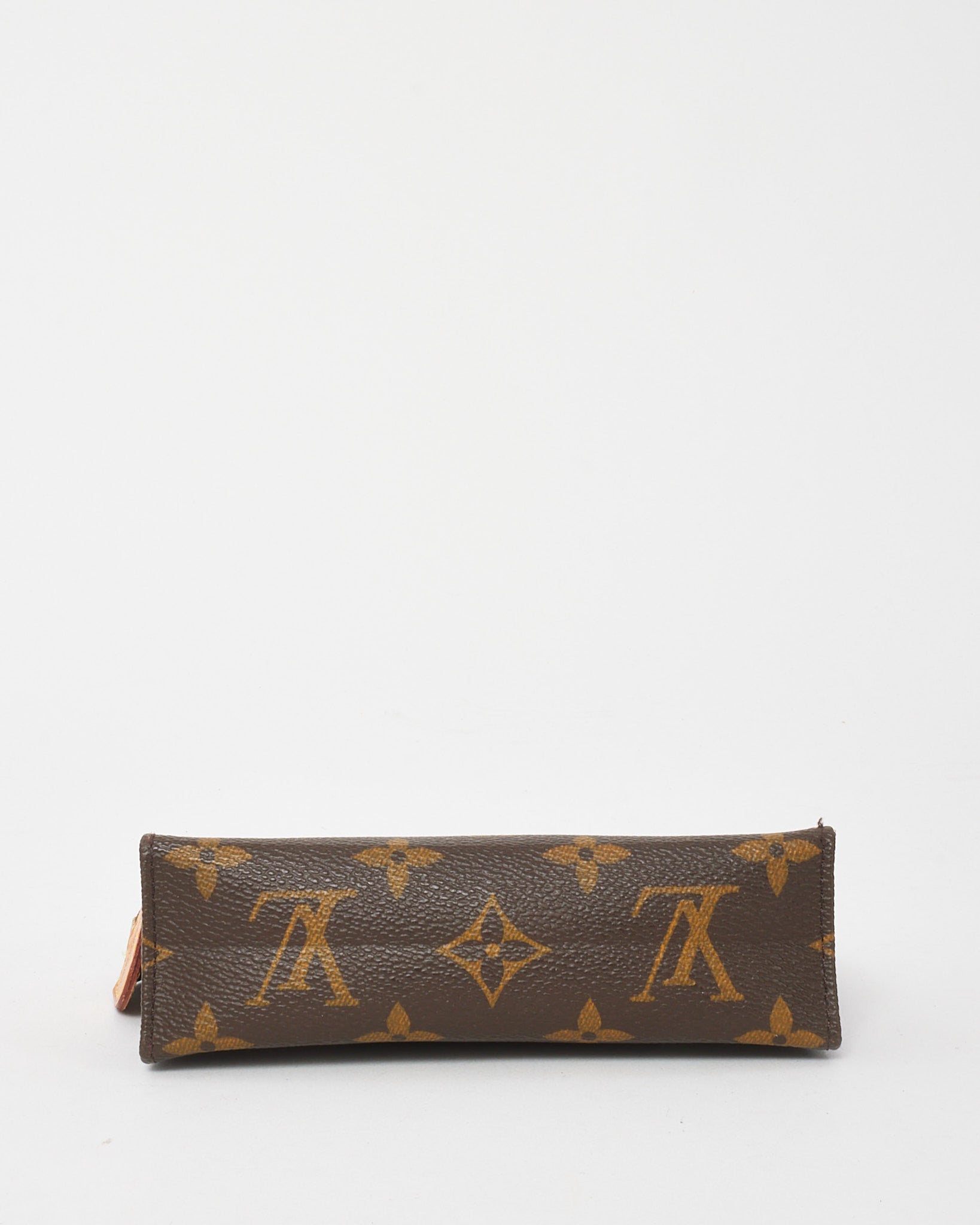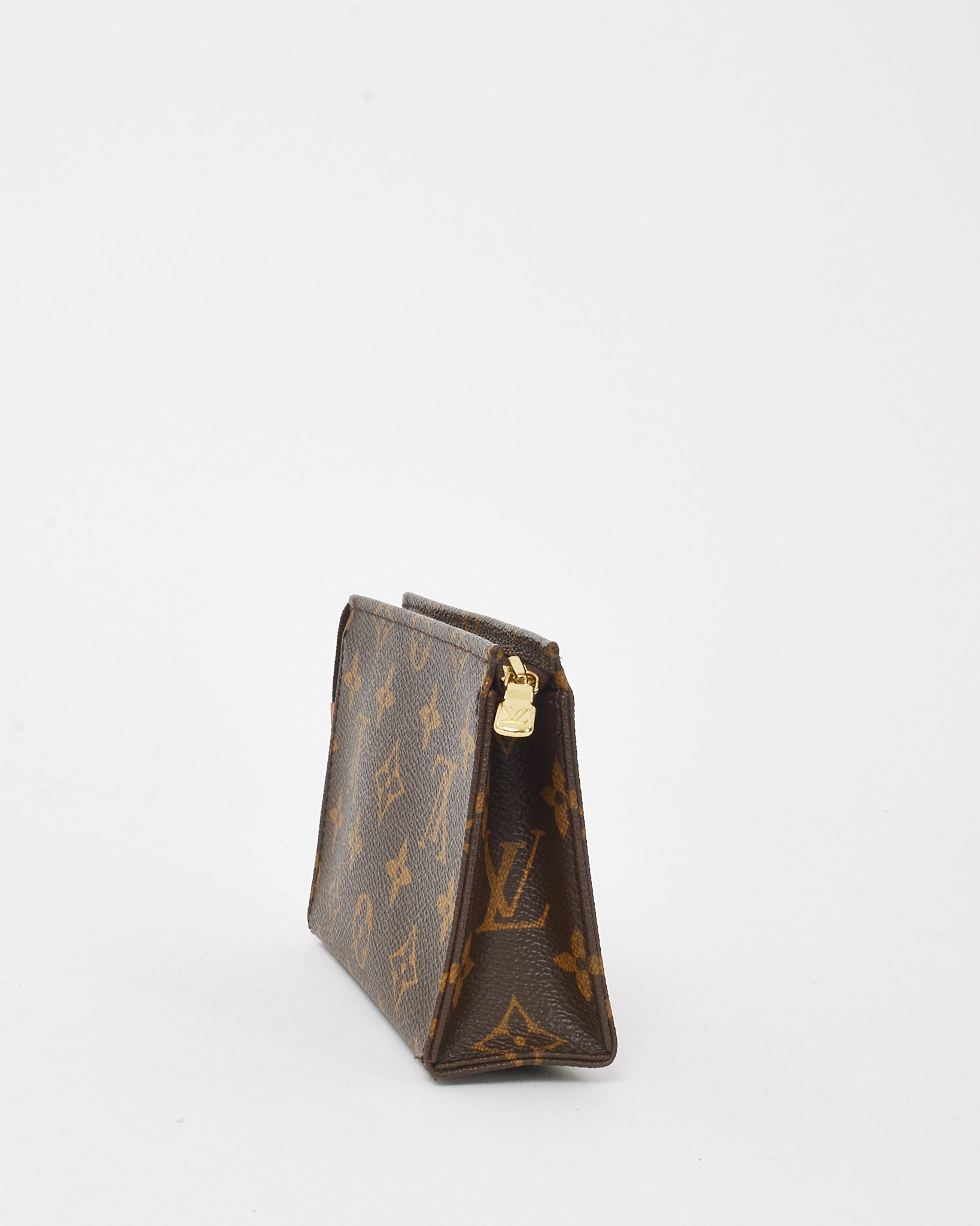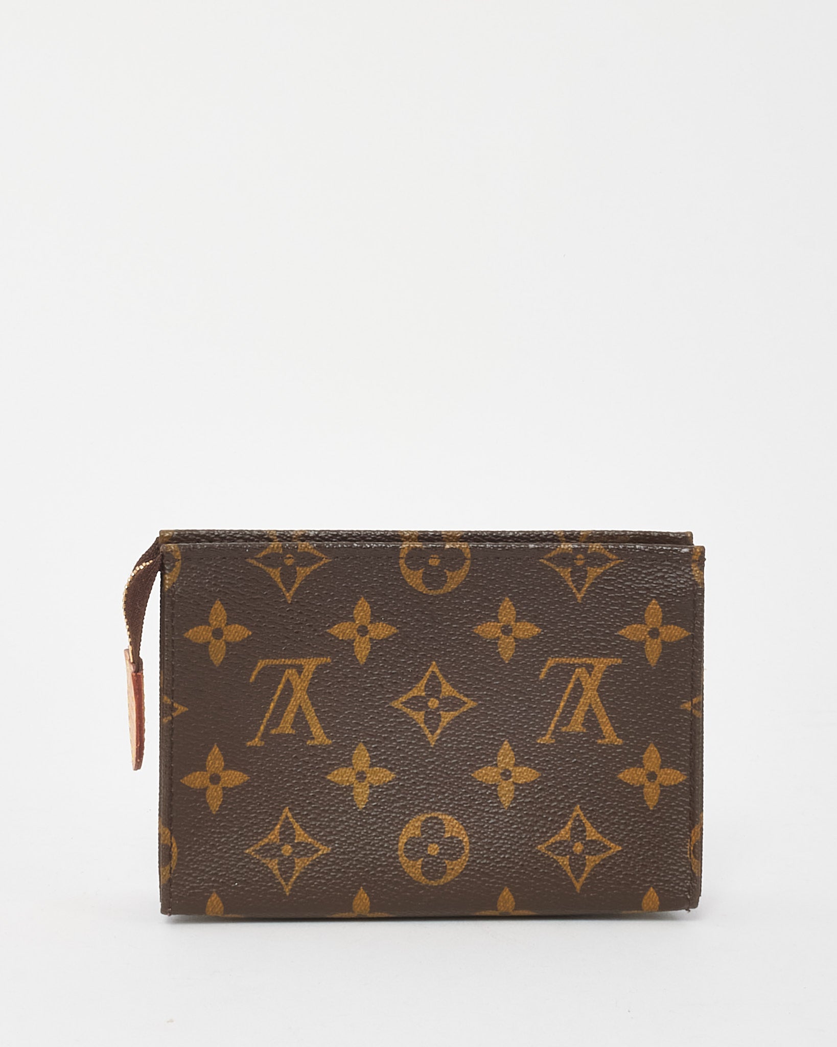 Compact and versatile, this pre-owned authentic Louis Vuitton Toiletry 15 Pouch is crafted from signature Monogram coated canvas with a washable interior lining and gold-tone hardware. Designed for travel or daily organization, its structured silhouette easily slips into larger bags while keeping essentials secure and stylish.