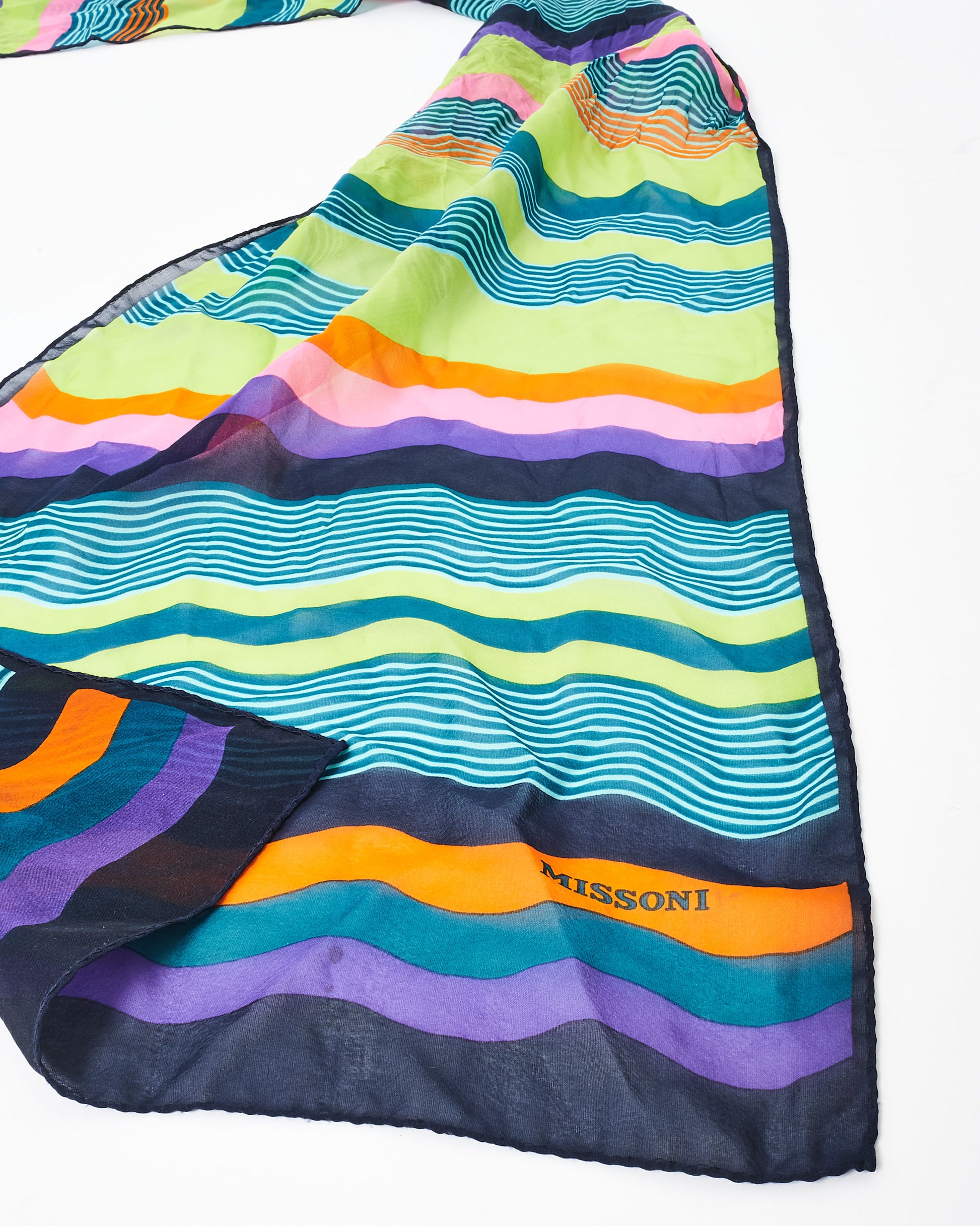 Explore Missoni's exquisite collection of accessories, featuring this certified pre-owned Green Orange & Purple Multi Wave Silk Scarf. Embodying timeless elegance and modern sustainability, each piece, including favorites like this, is authenticated by Retyche. Discover sustainable luxury — shop our current treasures or find inspiration for your next coveted find.