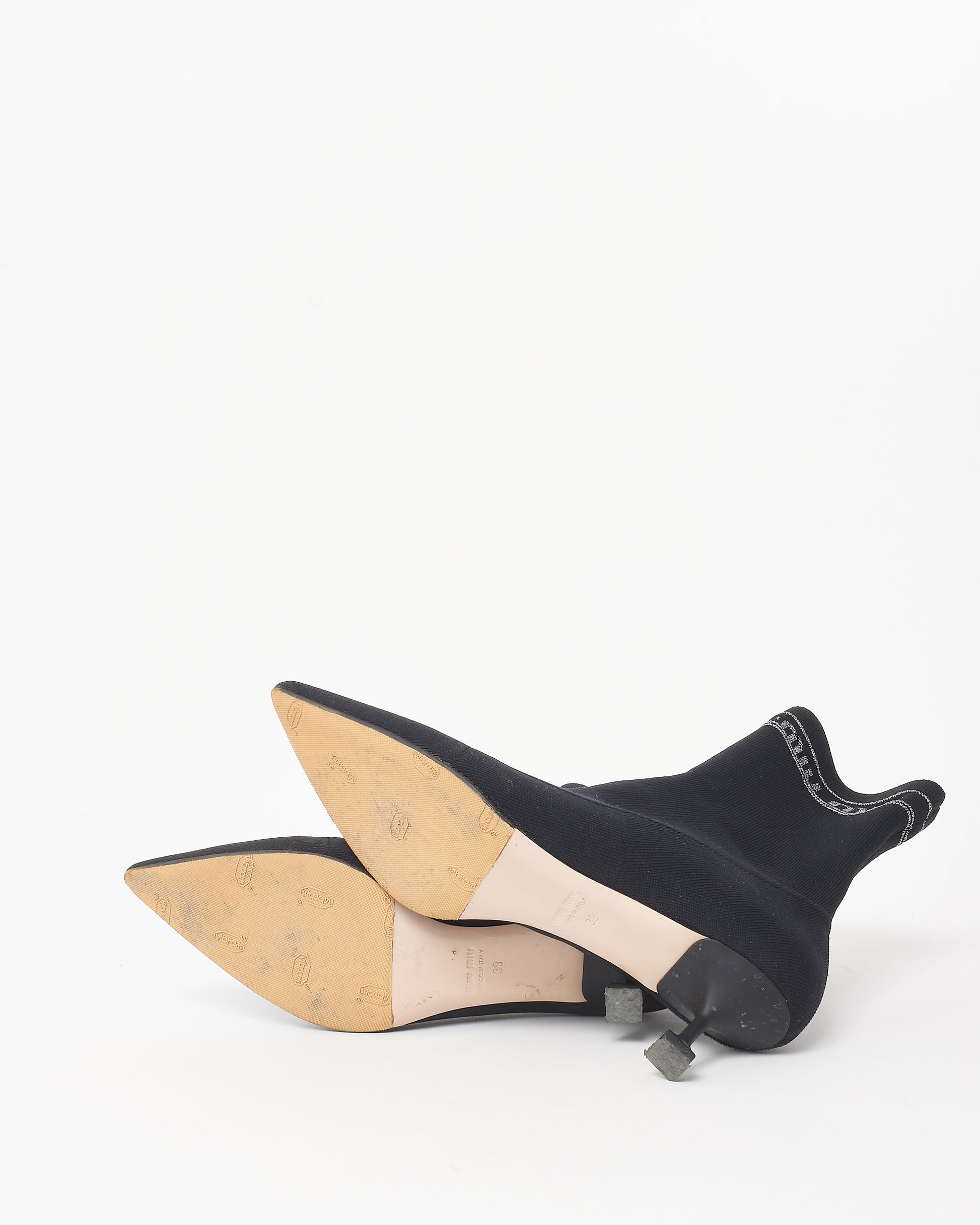 These authentic pre-owned Miu Miu Black Knit & Silver Sparkle Sock Boots are a bold and glamorous footwear choice, combining comfort and style. With their sleek knit construction and dazzling silver logo sparkle detailing, these boots are perfect for making a statement in any outfit, day or night. Shop pre-owned authentic Miu Miu shoes at Retyche.