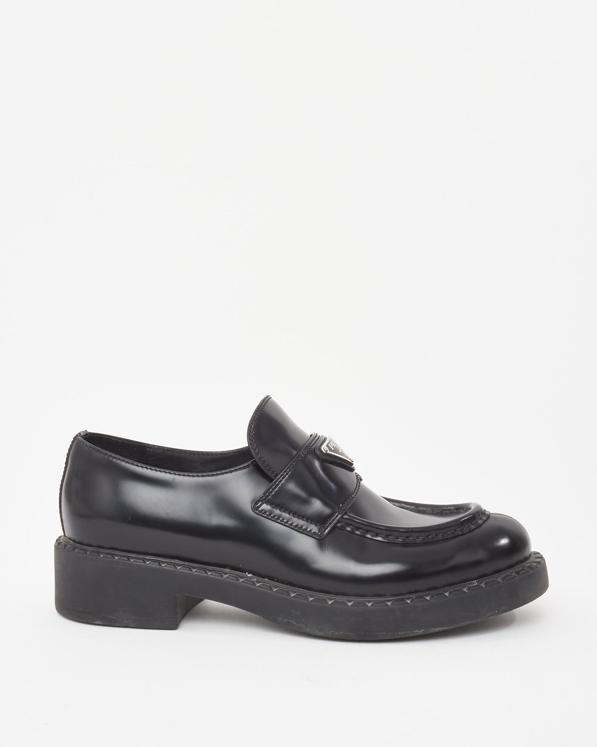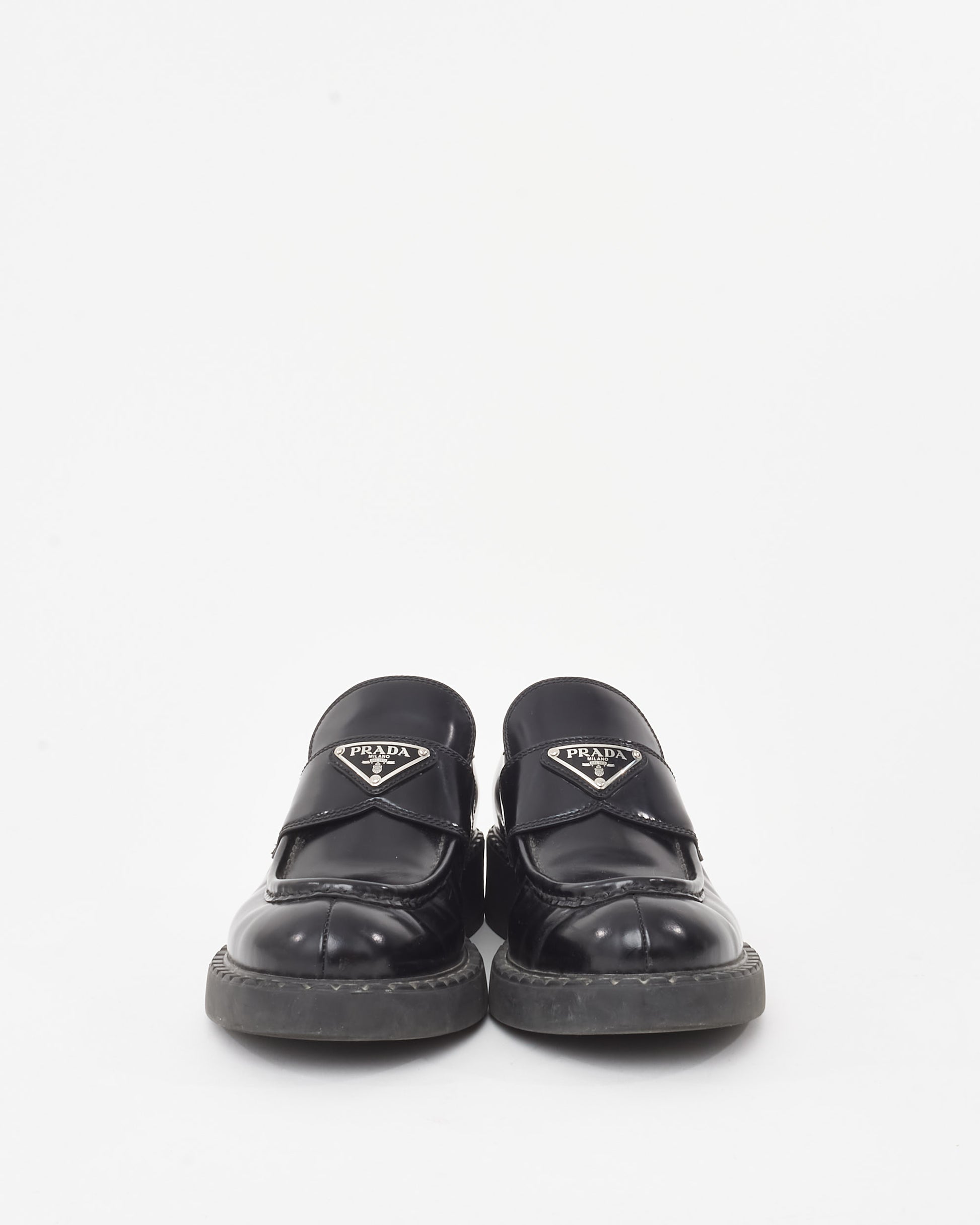 The raised Prada triangle logo plaque on the vamp adds a bold signature touch, while the chunky rubber sole provides both comfort and a subtle lift. Designed for effortless wear, these loafers transition seamlessly from workwear to casual chic styling.
