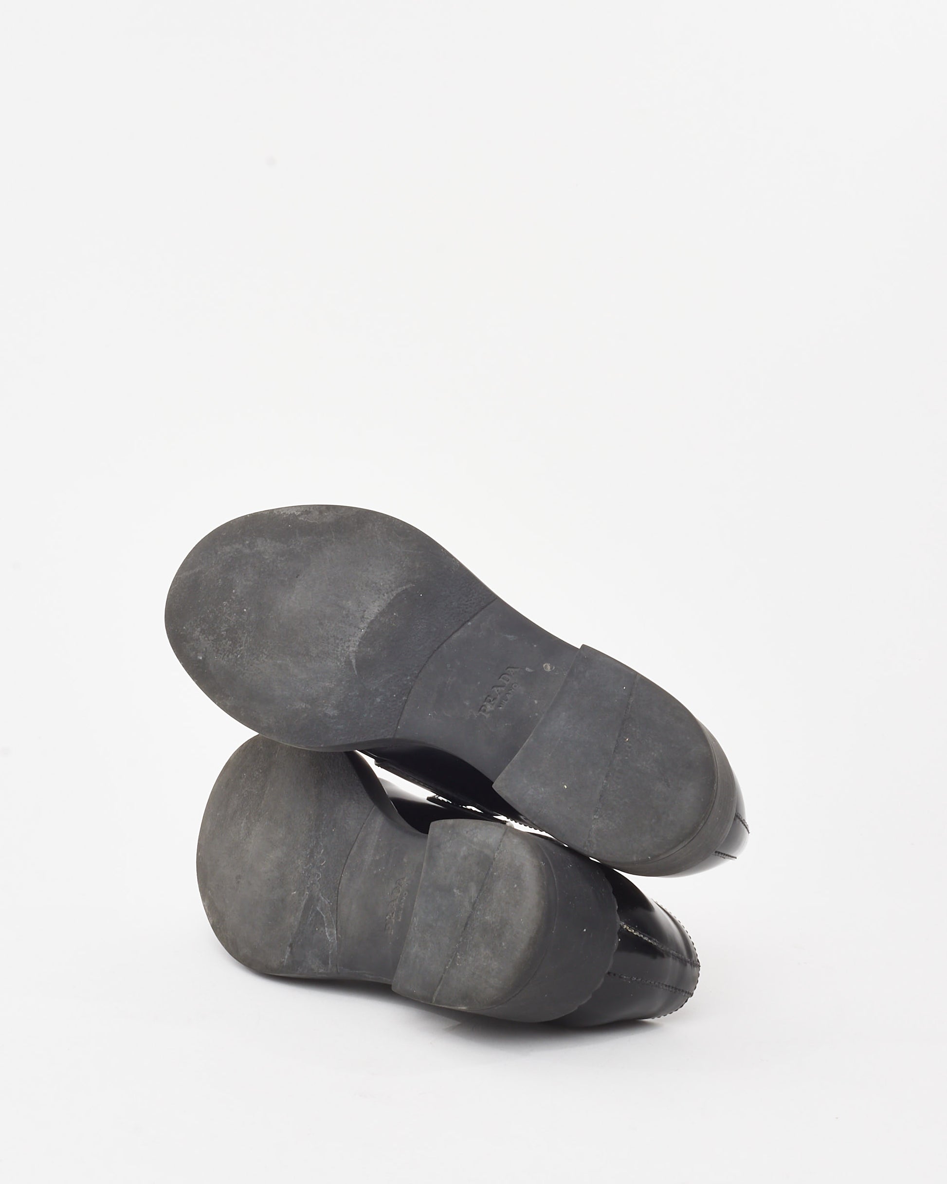 A contemporary take on a timeless classic, the pre-owned authentic Prada Black Brushed Leather Chocolate Logo Loafers blend refined elegance with modern edge. Crafted from smooth black brushed leather, these loafers feature a structured silhouette with a sleek almond toe, offering a polished and versatile look.