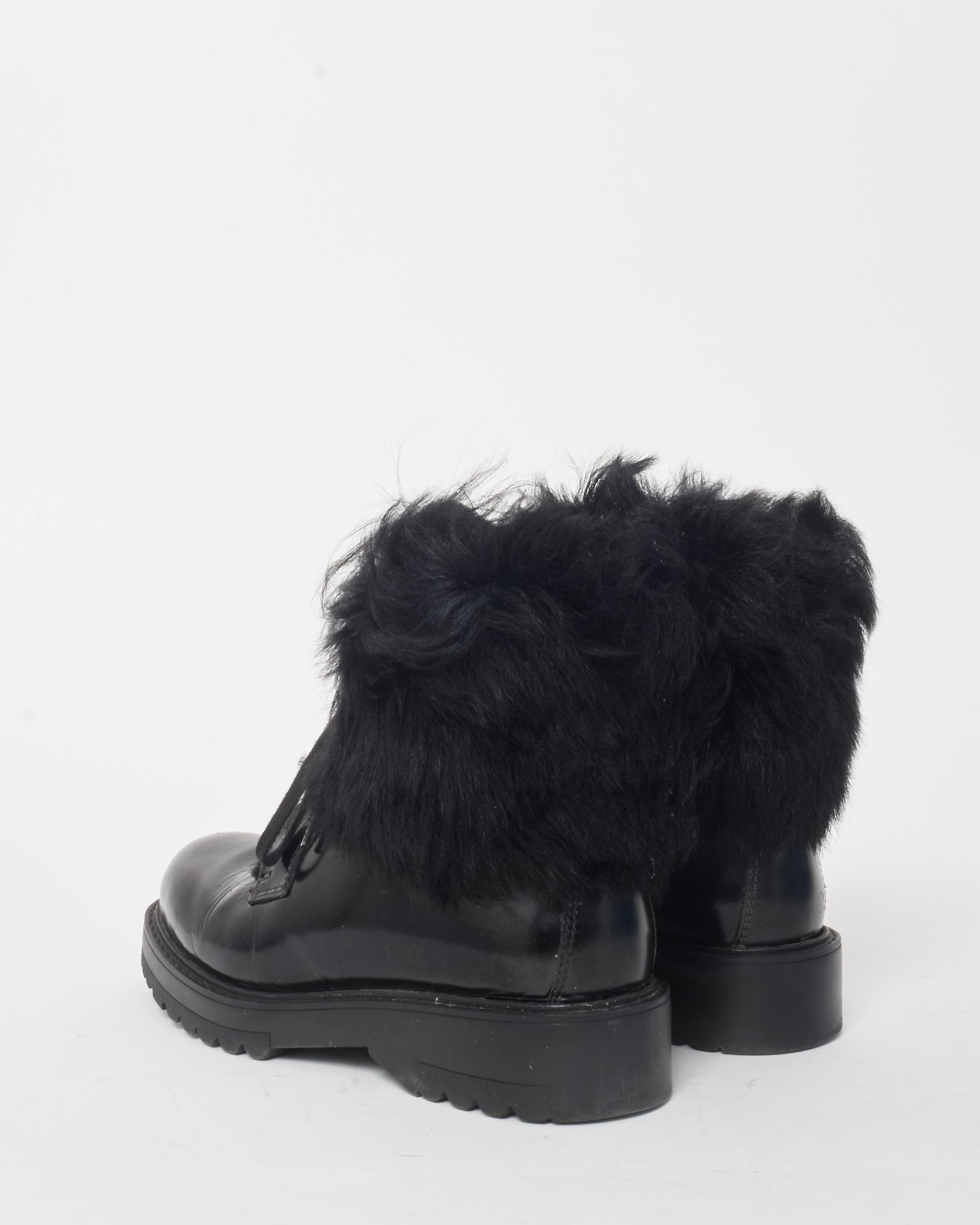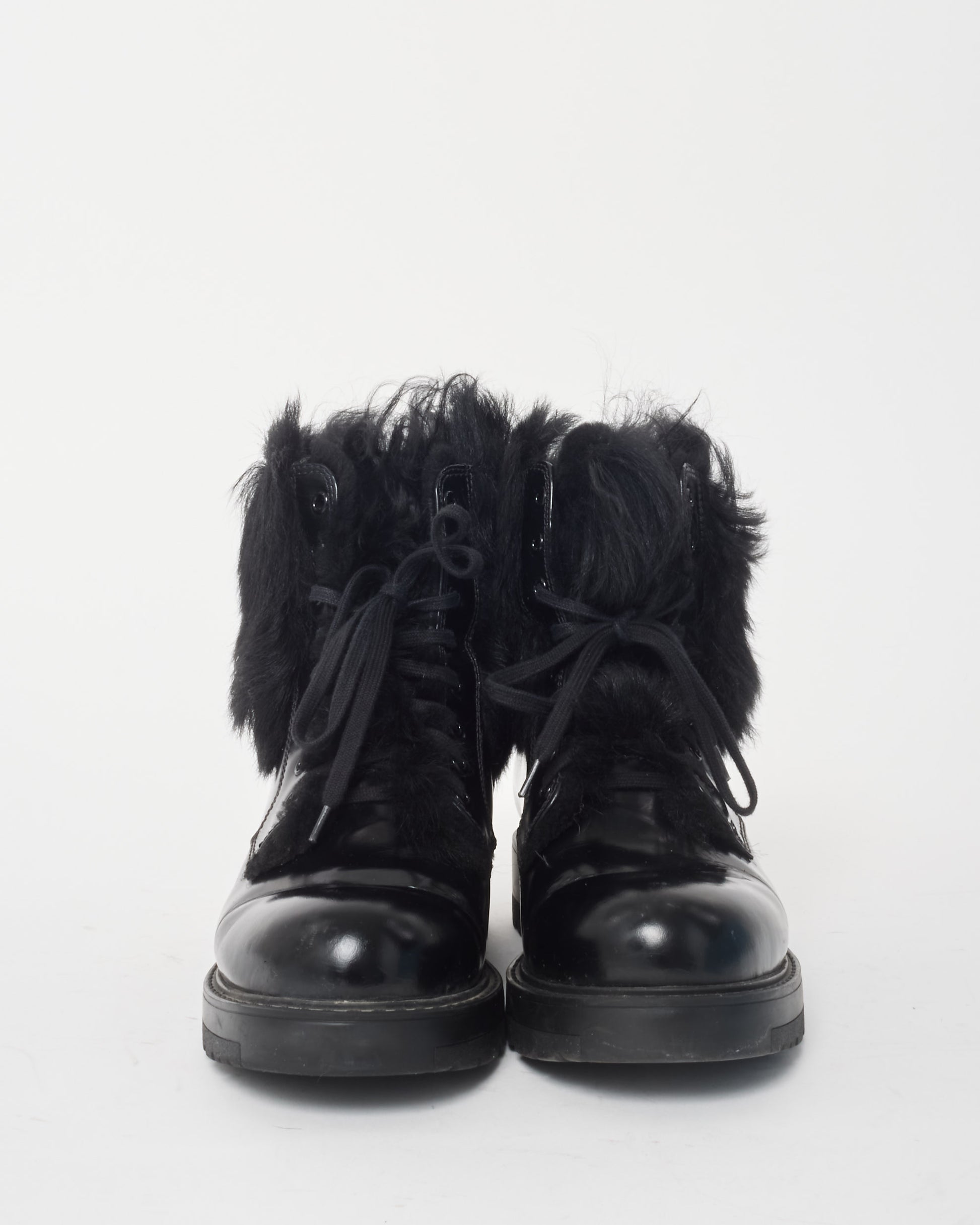 Make a statement with these pre-owned authentic Prada Black Leather & Fur Combat Boots. Combining rugged design with luxurious materials, these boots feature smooth black leather and plush fur detailing, offering both style and comfort. Perfect for cold-weather days or adding edge to your outfit, these boots are a must-have for the fashion-forward. Smooth black leather with fur trim. Lace-up front with metal eyelets and a logo-embossed tongue with a lace-up with side zip for easy wear. Chunky rubber sole. Shop pre-owned authentic Prada shoes at Retyche.