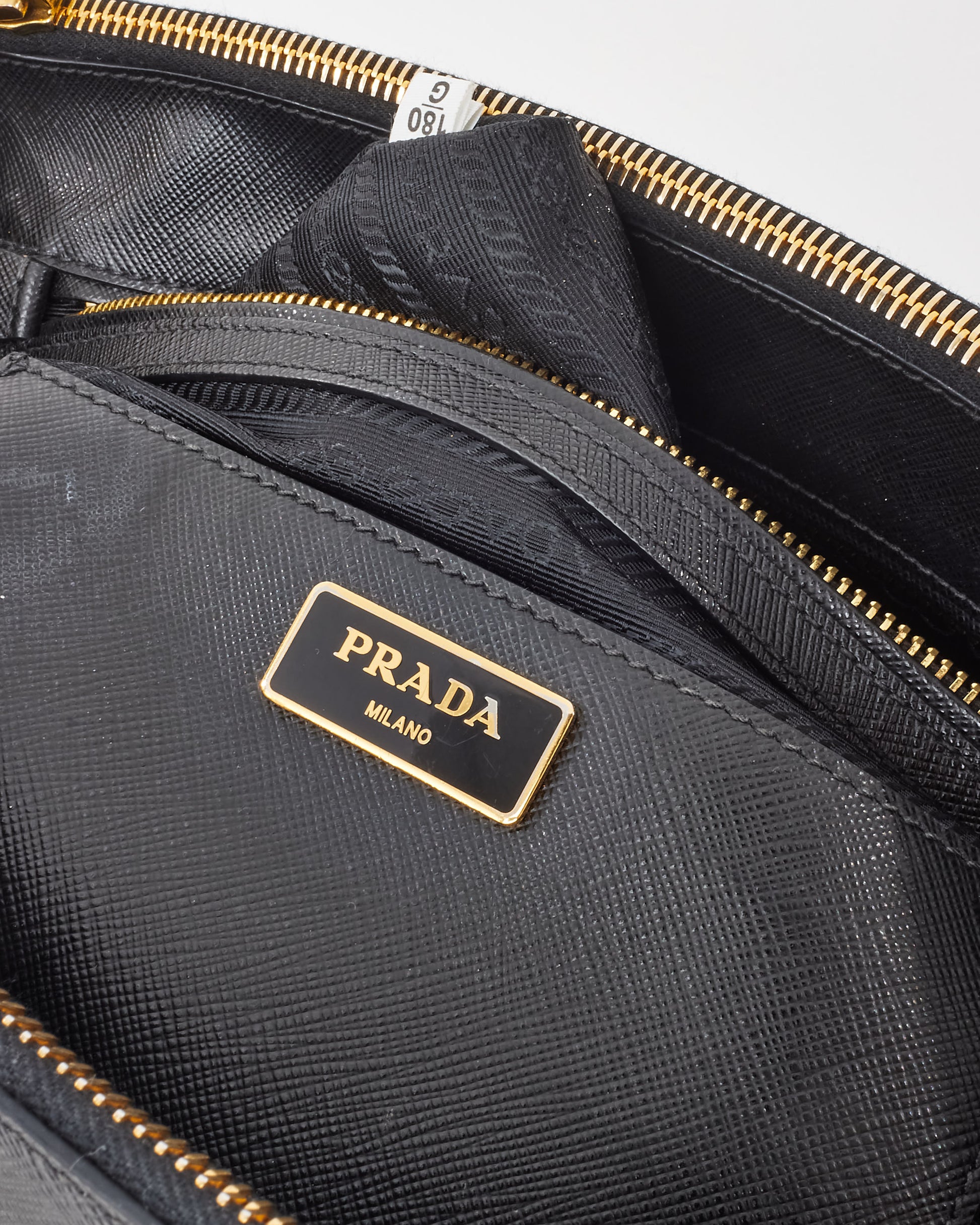 A timeless icon of sophistication, the pre-owned authentic Prada Black Saffiano Lux Leather Double Zip Medium Galleria Tote is a structured and polished essential for everyday elegance. Crafted from durable black Saffiano leather, this tote features a sleek silhouette with refined gold-tone hardware, making it effortlessly versatile for work or casual wear.