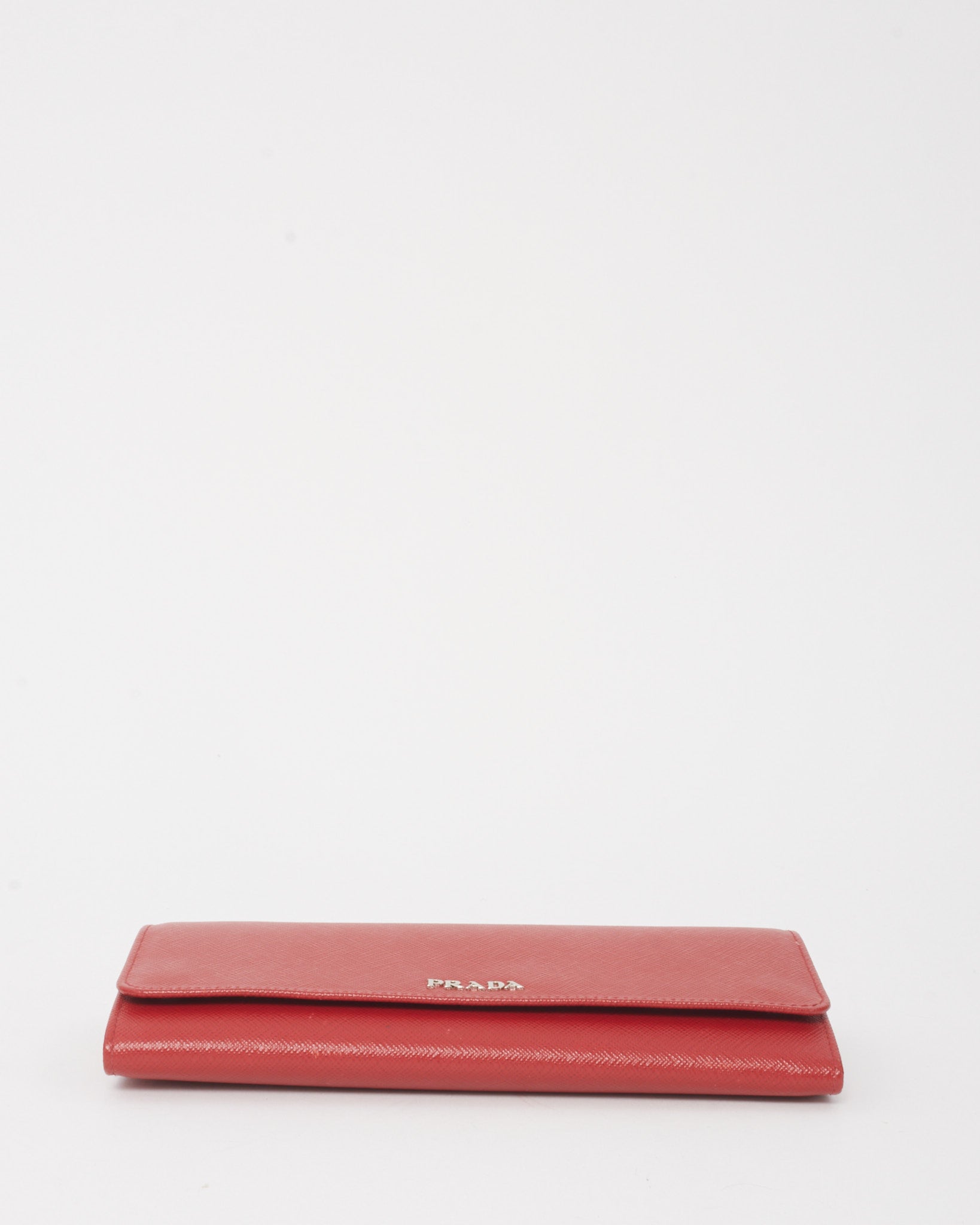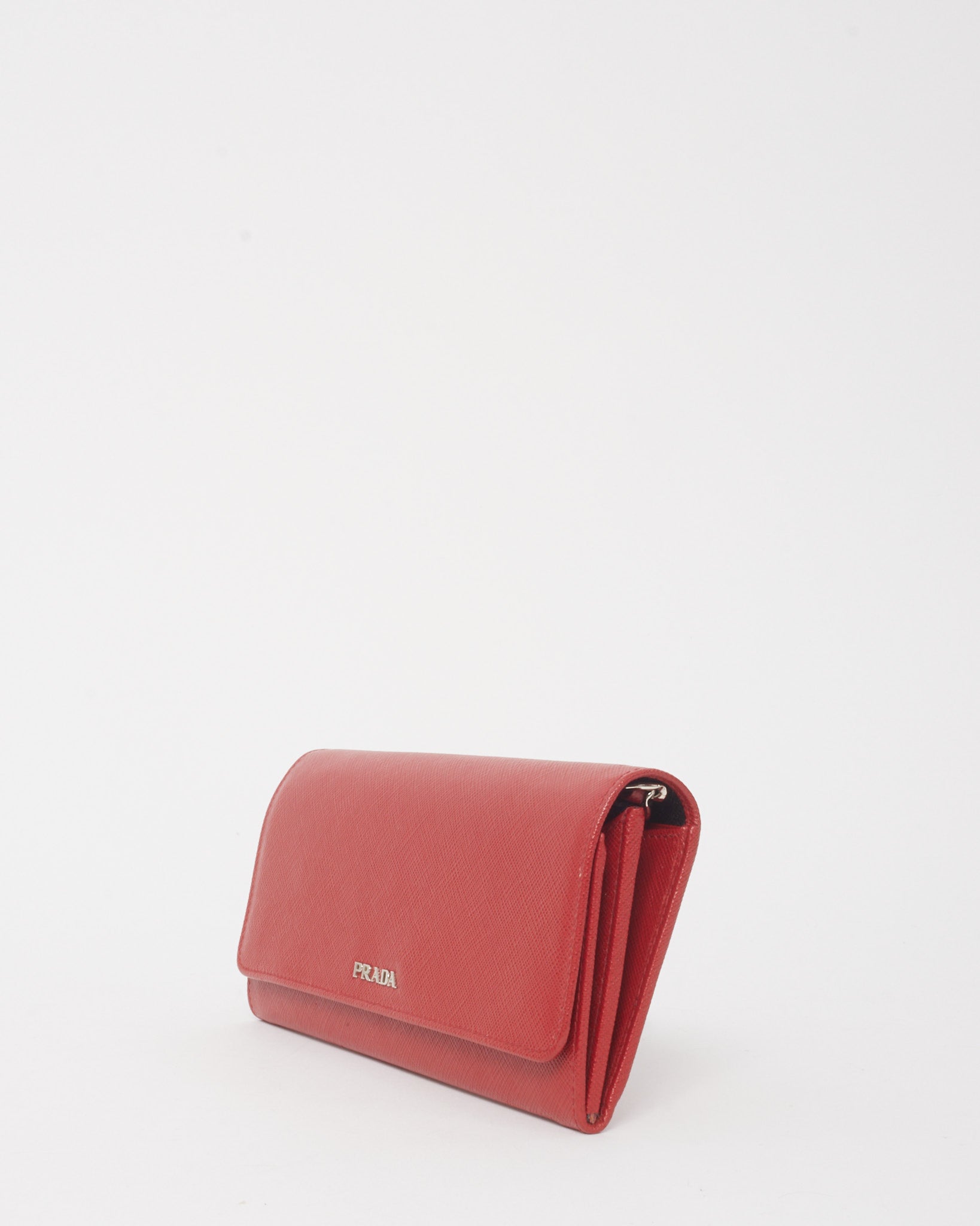 Vibrant and refined, this pre-owned authentic Prada Wallet on Chain is crafted from red Saffiano leather with a contrasting black interior for a bold yet feminine touch. The structured silhouette features a flap closure, organized interior with card slots, and a removable chain strap for versatile styling.