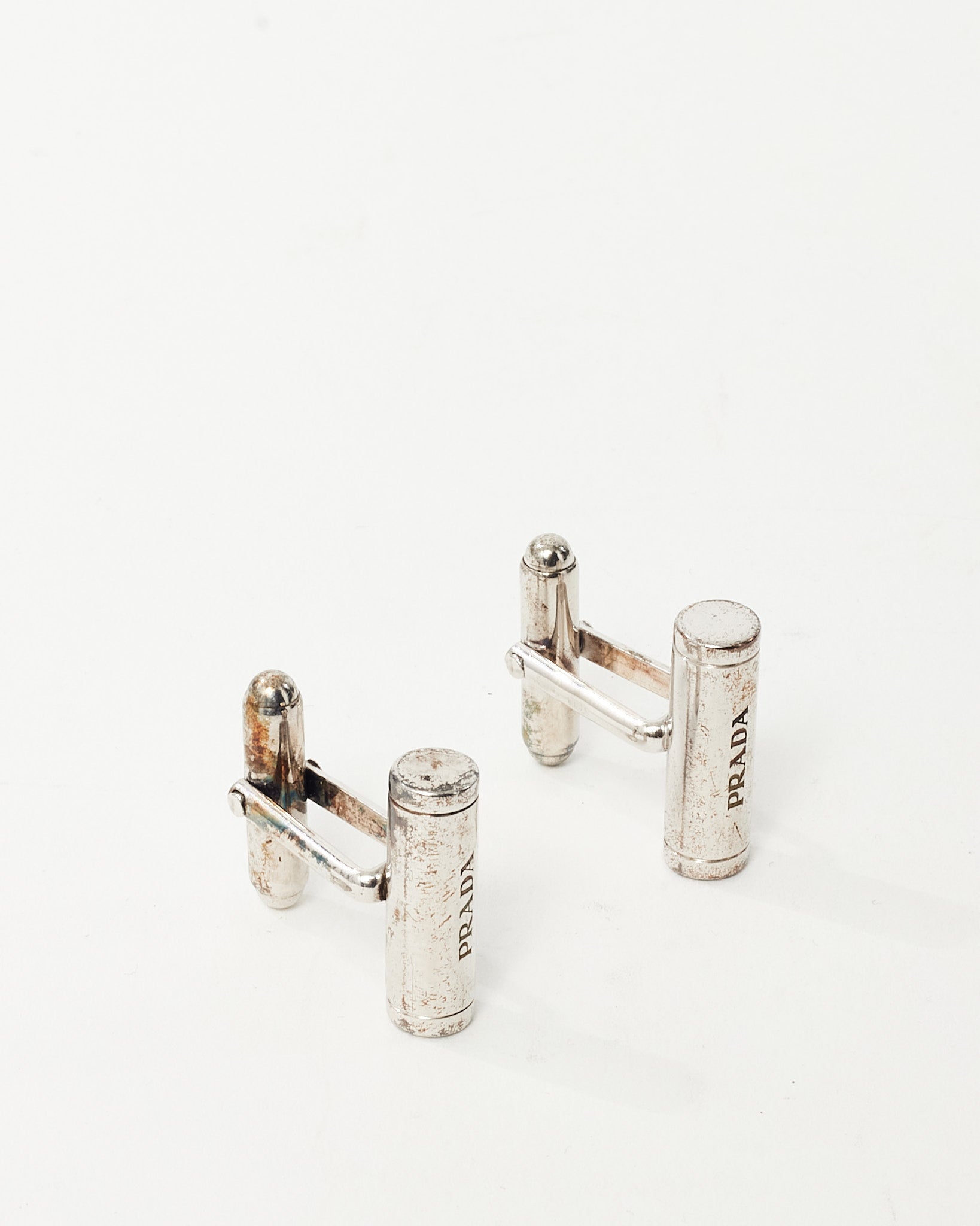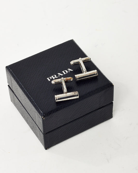 Add a refined finishing touch to your formalwear with this pre-loved authentic Prada Silver Metal Bar Logo Cufflinks with Box, crafted in polished silver-tone metal for a sleek, sophisticated finish. The minimalist bar design is accented with subtle Prada logo detailing, delivering understated yet unmistakable designer appeal. Designed for timeless elegance, these cufflinks pair effortlessly with dress shirts and tailoring. A classic Prada accessory that blends modern simplicity with refined Italian craftsmanship.