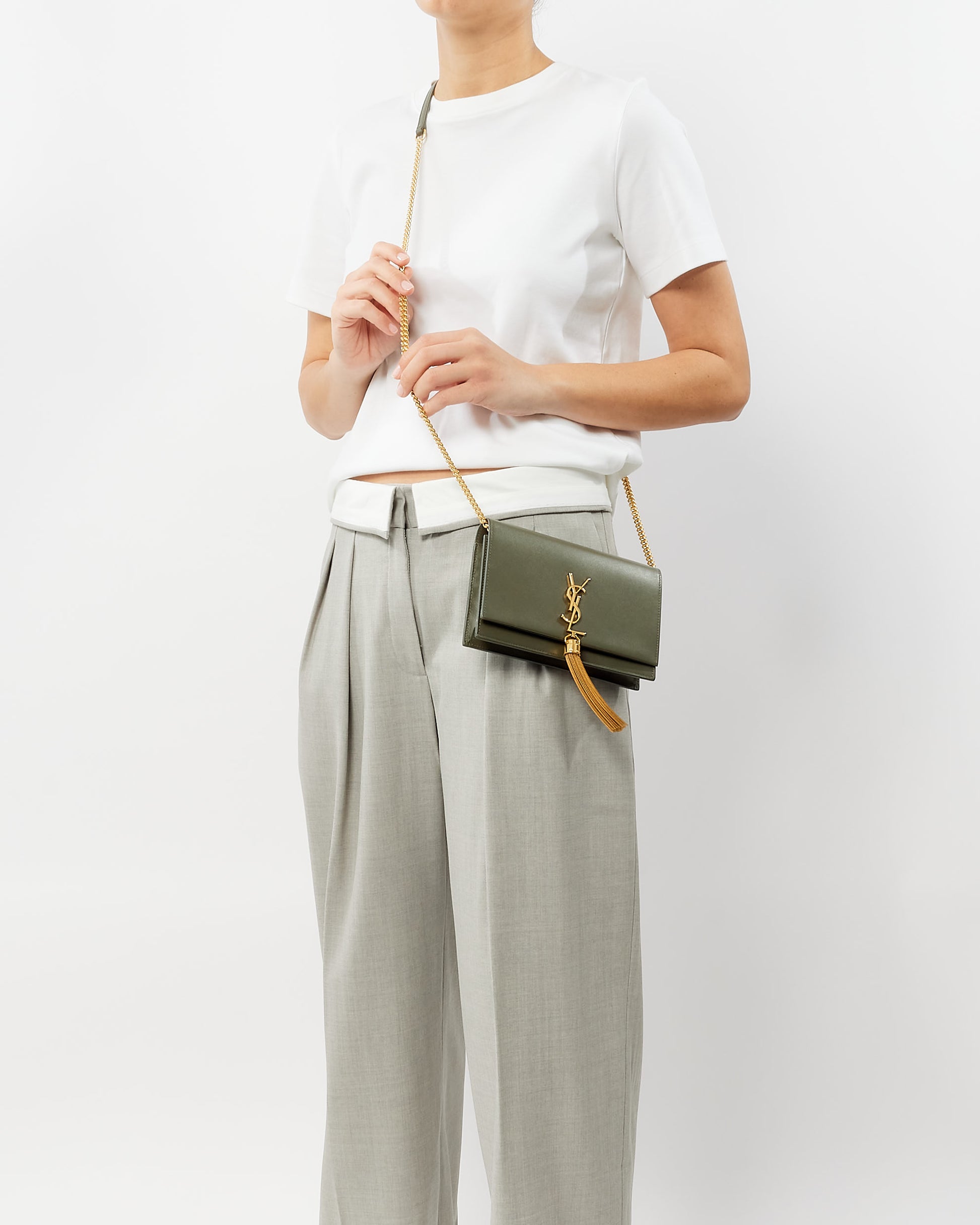 Explore Saint Laurent's exquisite collection of handbags, featuring this certified pre-owned Army Green Leather Kate Chain Tassel Wallet On Chain. Embodying timeless elegance and modern sustainability, each piece, including favorites like this, is authenticated by Retyche. Discover sustainable luxury — shop our current treasures or find inspiration for your next coveted find