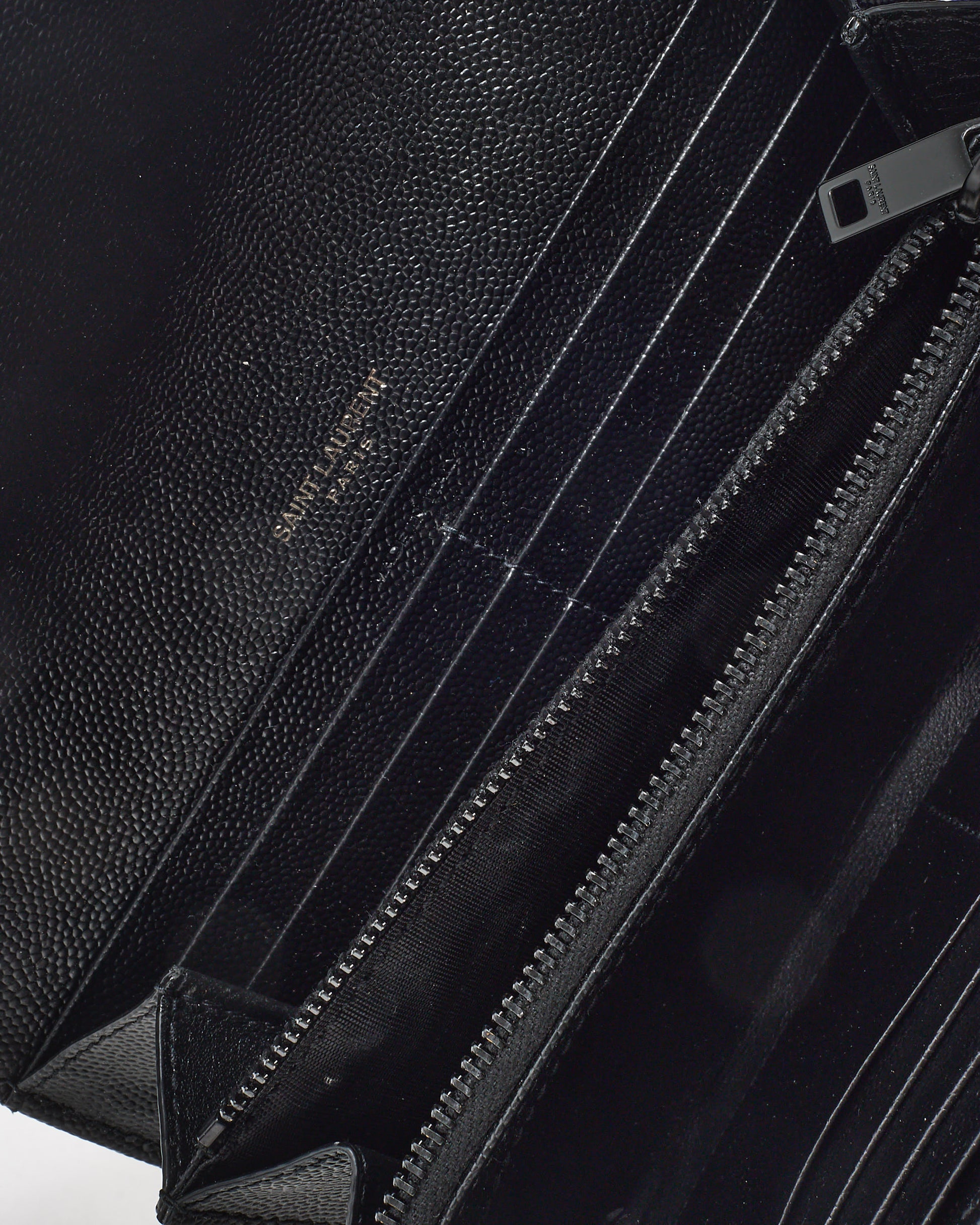 The iconic black-tone YSL Cassandre logo on the flap adds a signature touch of luxury, while the spacious interior offers multiple compartments, card slots, and a zippered coin pocket to keep your essentials organized.