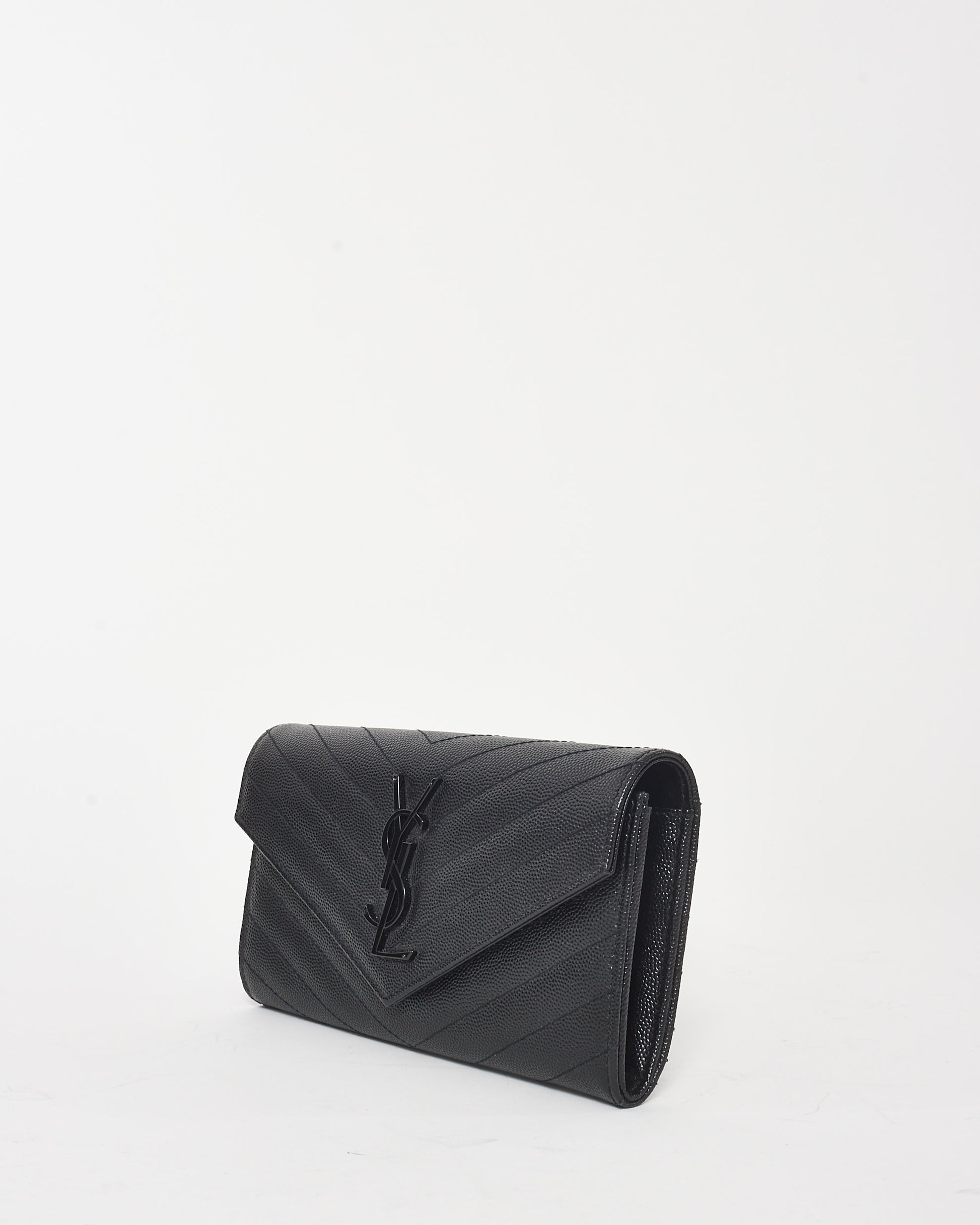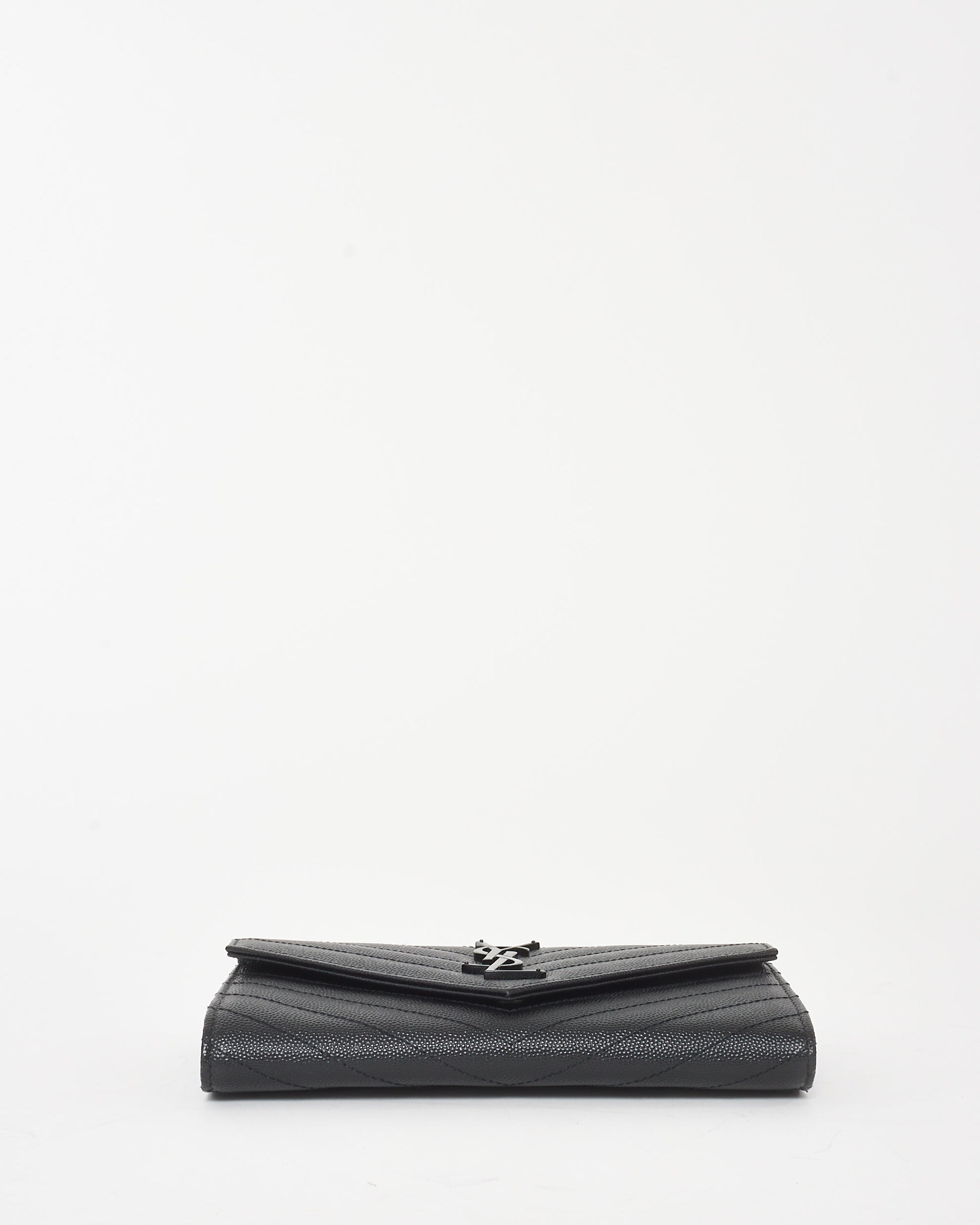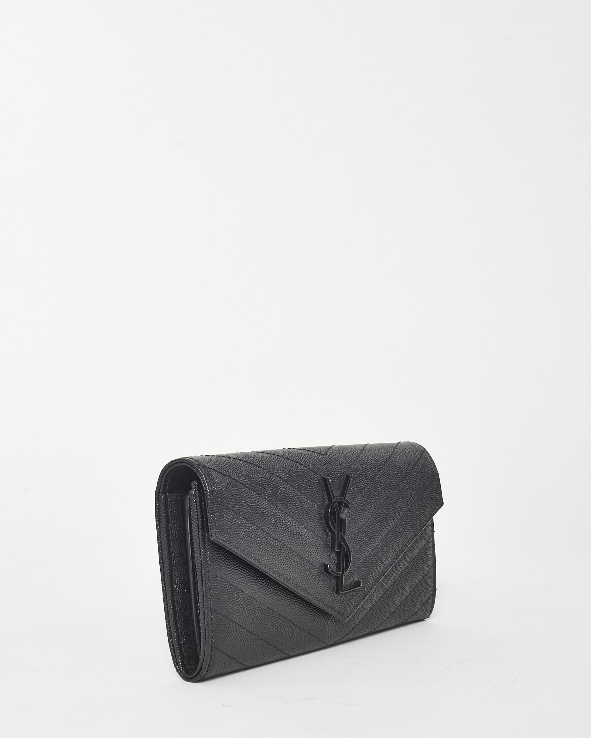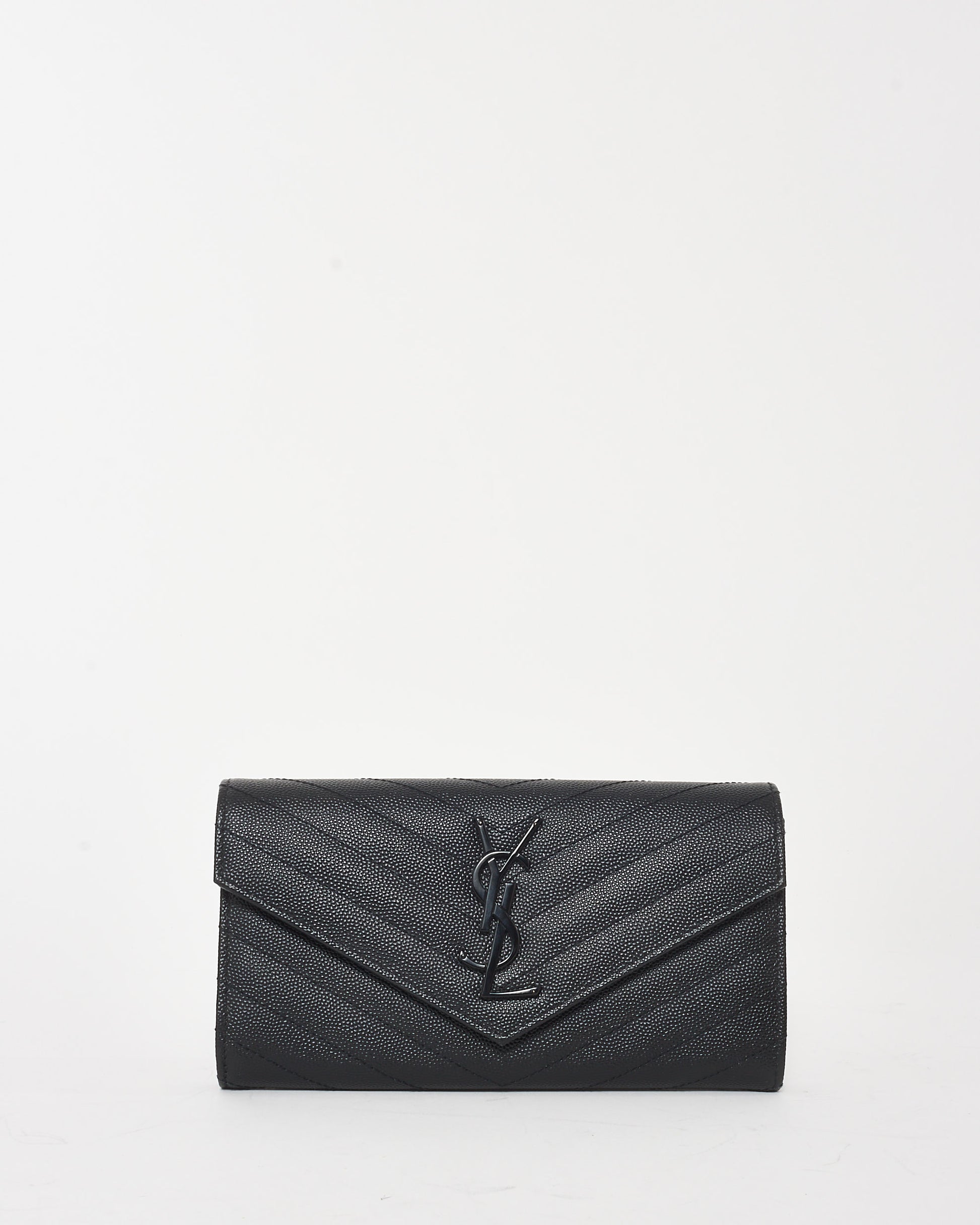 Elevate your everyday essentials with the authentic pre-owned Saint Laurent Black Grain De Poudre Leather Cassandre Large Flap Wallet. Crafted from luxurious grain de poudre leather, this wallet features a sleek and structured design, exuding sophistication and timeless elegance.