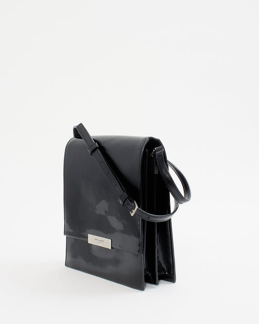 Sac à bandoulière carré en cuir verni noir à rayures en relief