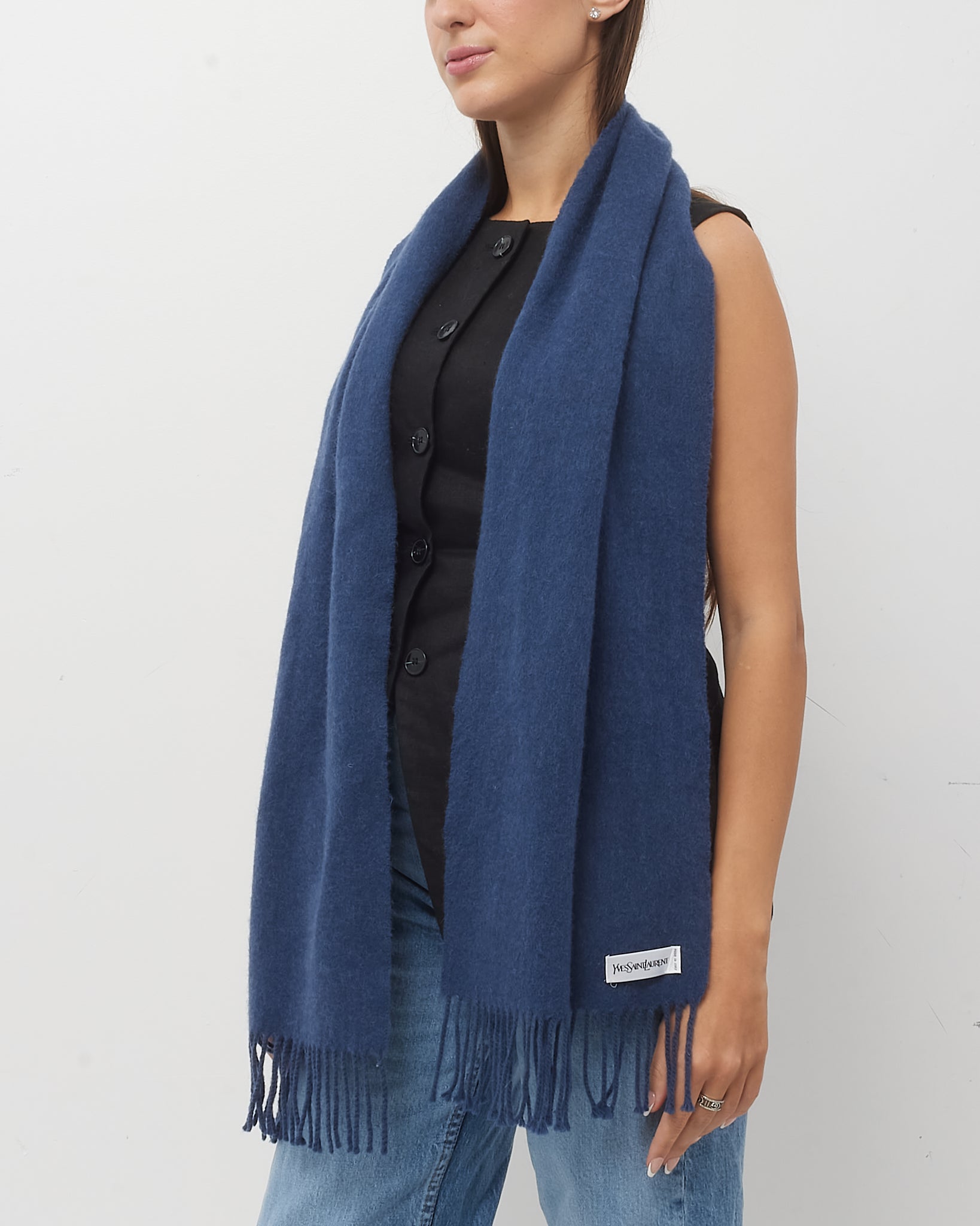 Elevate your cold-weather wardrobe with this pre-loved authentic Saint Laurent blue cashmere jacquard logo fringe signature scarf. Crafted from soft, premium cashmere, this luxurious accessory features a tonal jacquard-woven Saint Laurent signature that adds subtle branding to its rich hue. The lightweight yet insulating fabric makes it ideal for layering, while the classic fringe trim lends a timeless finish. Whether draped over outerwear or wrapped for warmth, this scarf brings understated sophistication and Parisian edge to any look.
