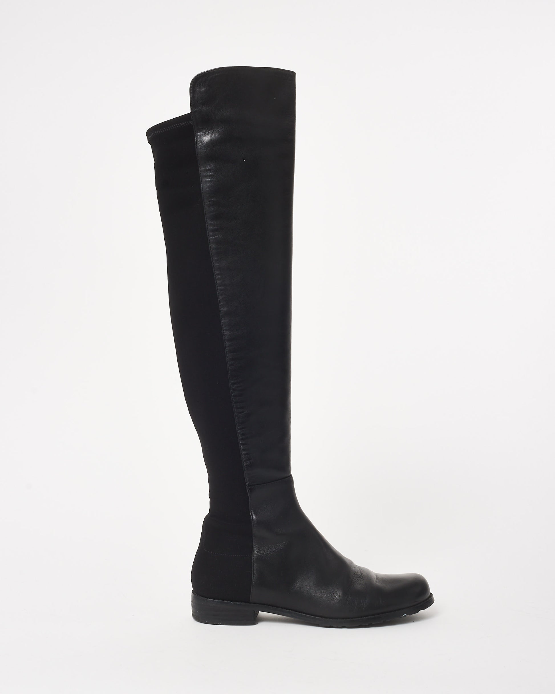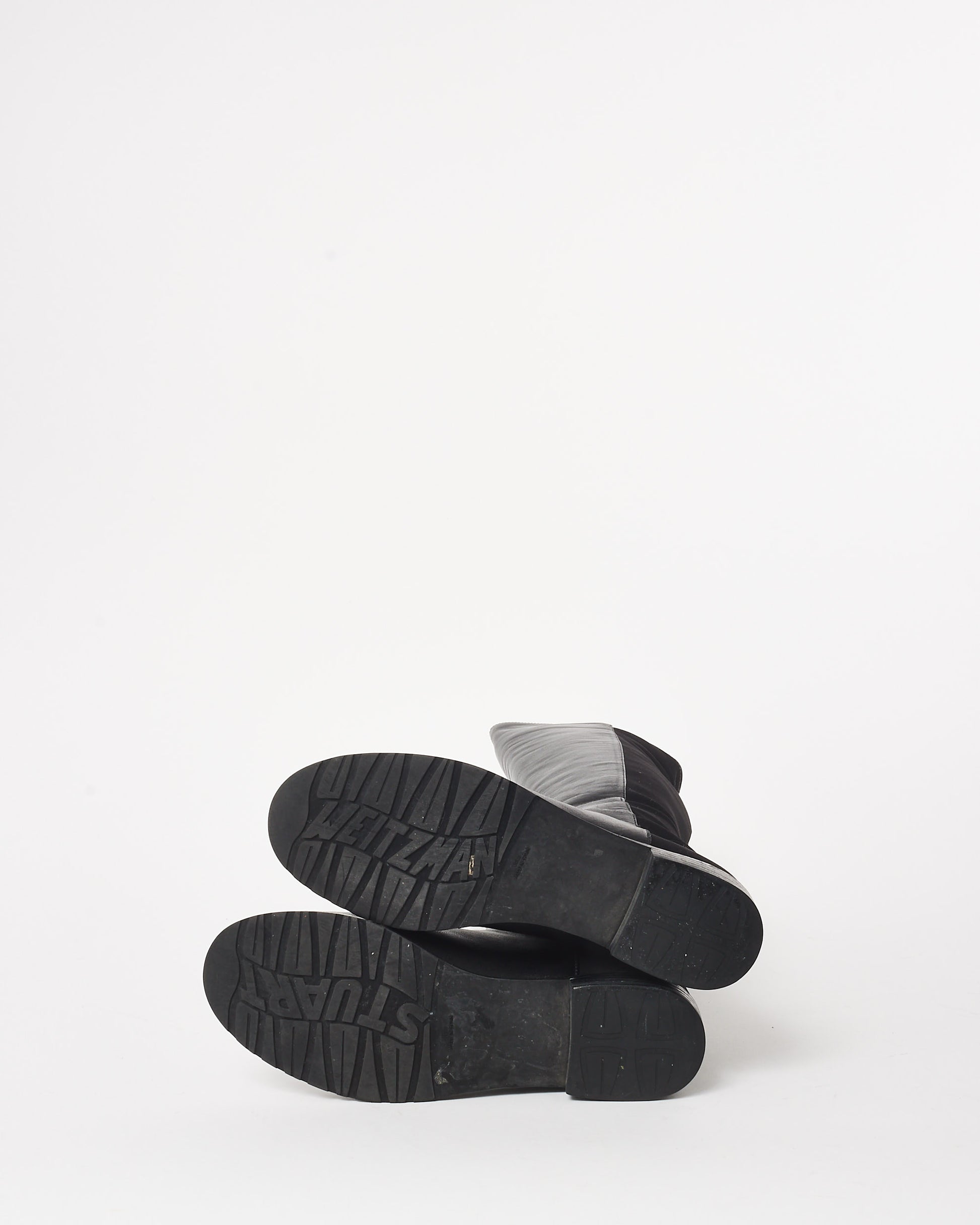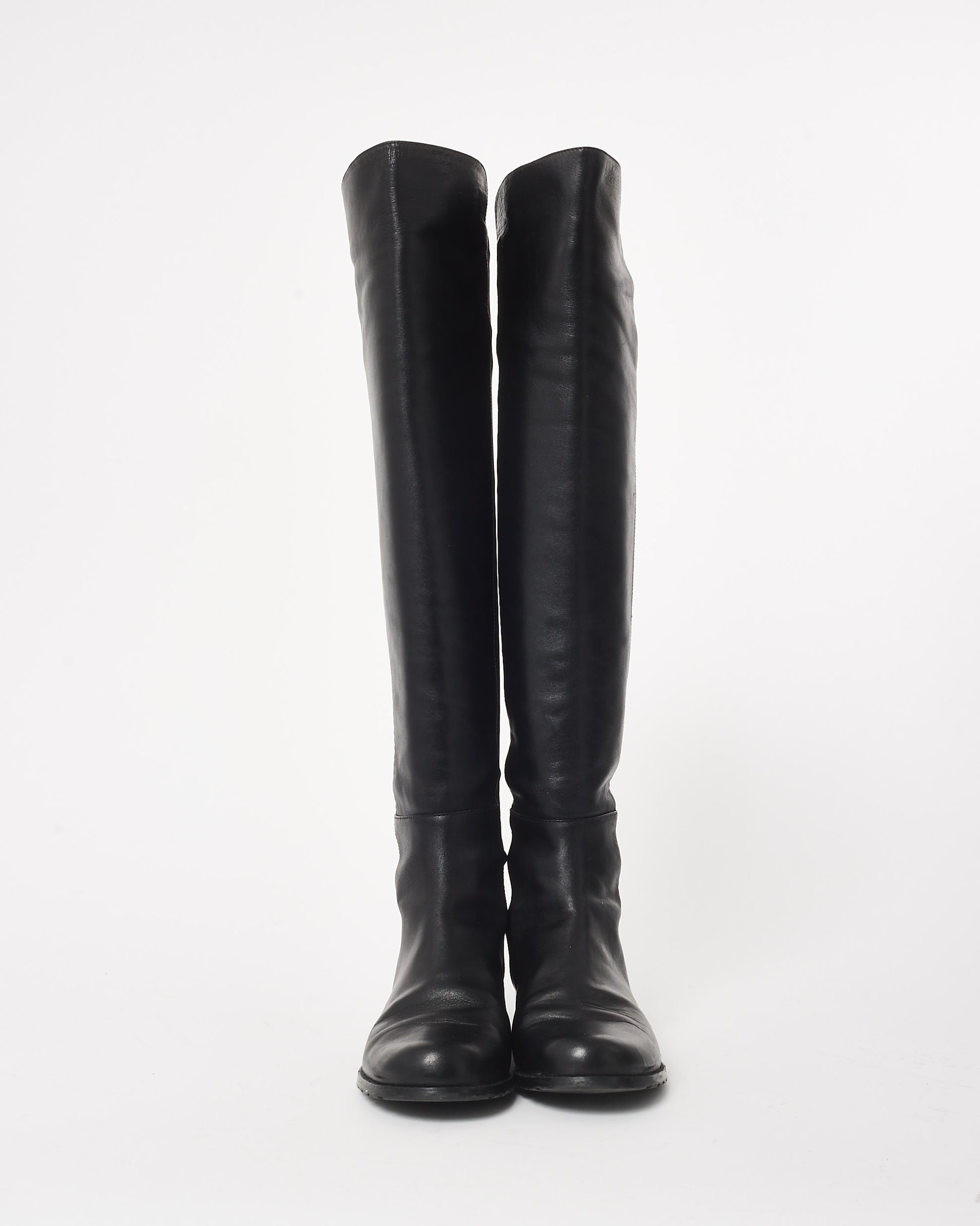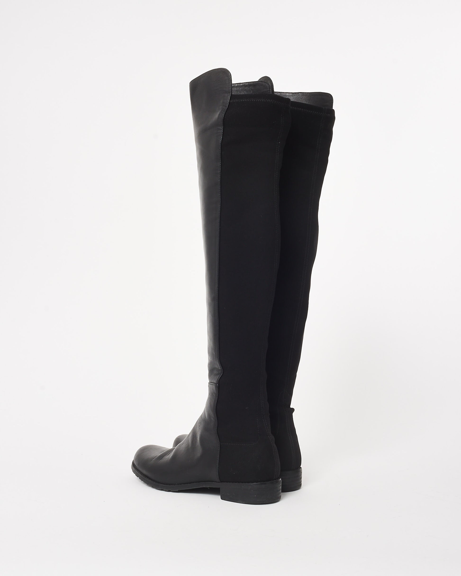 These are authentic pre-owned Stuart Weitzman Black Leather 50/50 Knee Boots are a modern classic, blending sleek design with unmatched comfort. Known for their signature half-leather, half-stretch construction, these knee-high boots are perfect for adding sophistication and versatility to any wardrobe. Smooth black leather at the front for a polished, luxurious look with stretchy elastic panel at the back for a snug, custom fit. Shop pre-owned authentic designer shoes at Retyche.