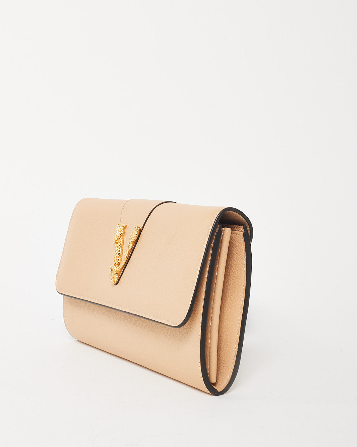 Understated elegance meets bold heritage in the pre-owned authentic Versace Beige Grained Leather Virtus Logo Wallet on Chain Bag. Crafted from luxurious beige grained leather, this compact silhouette is defined by the signature gold-tone ‘V’ Virtus emblem, a nod to the brand’s baroque roots.