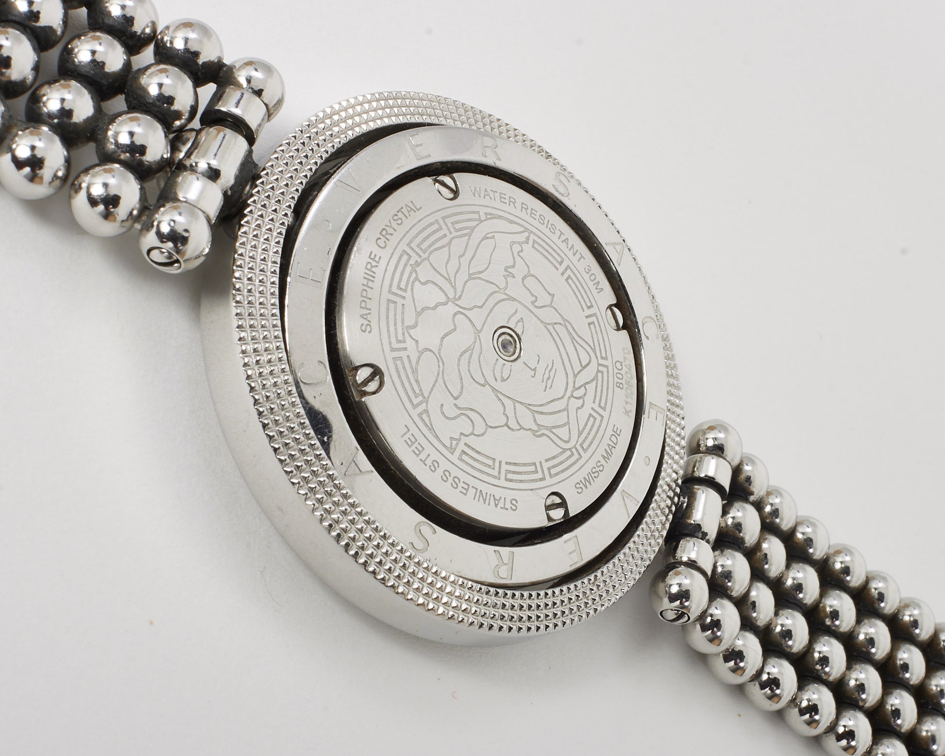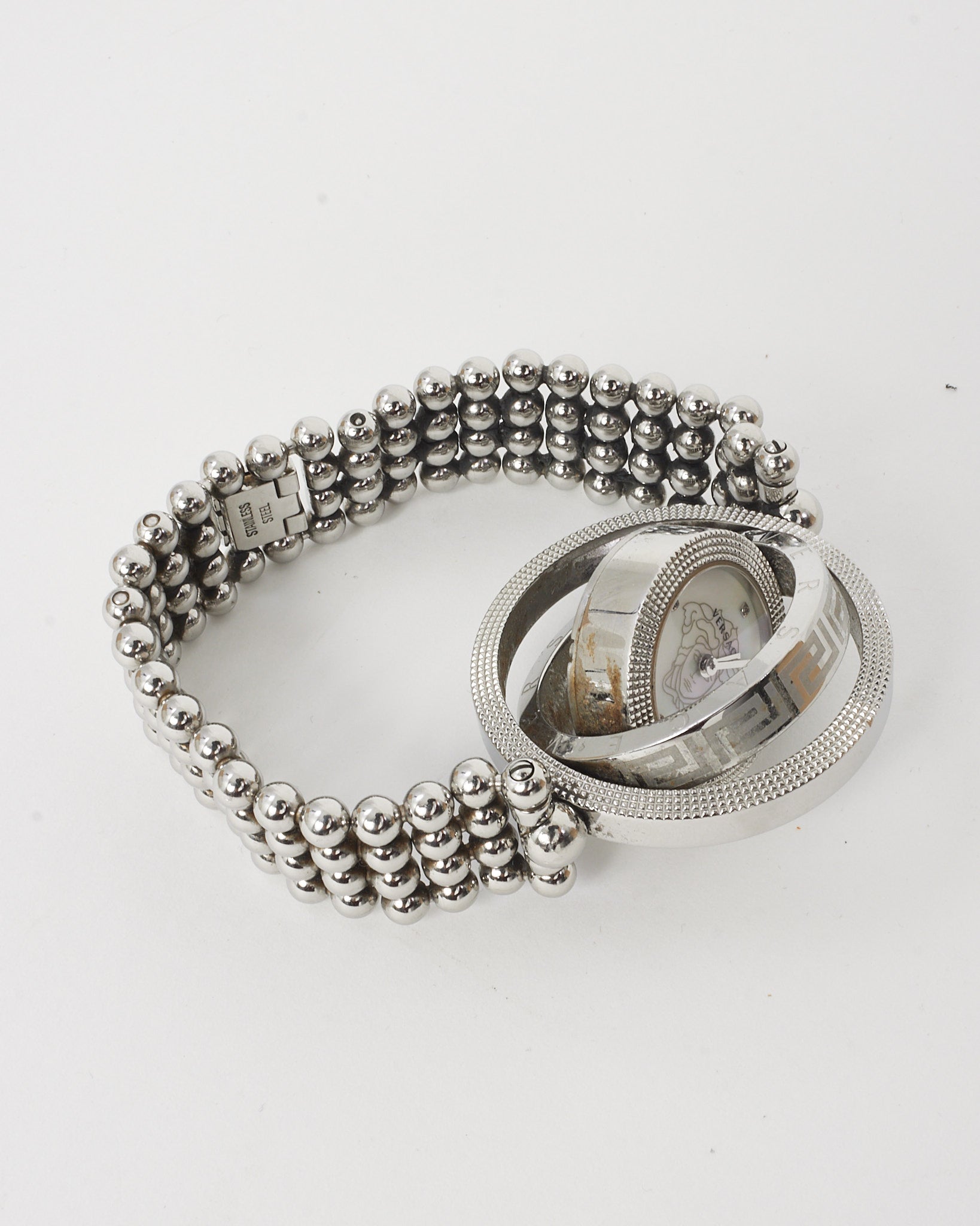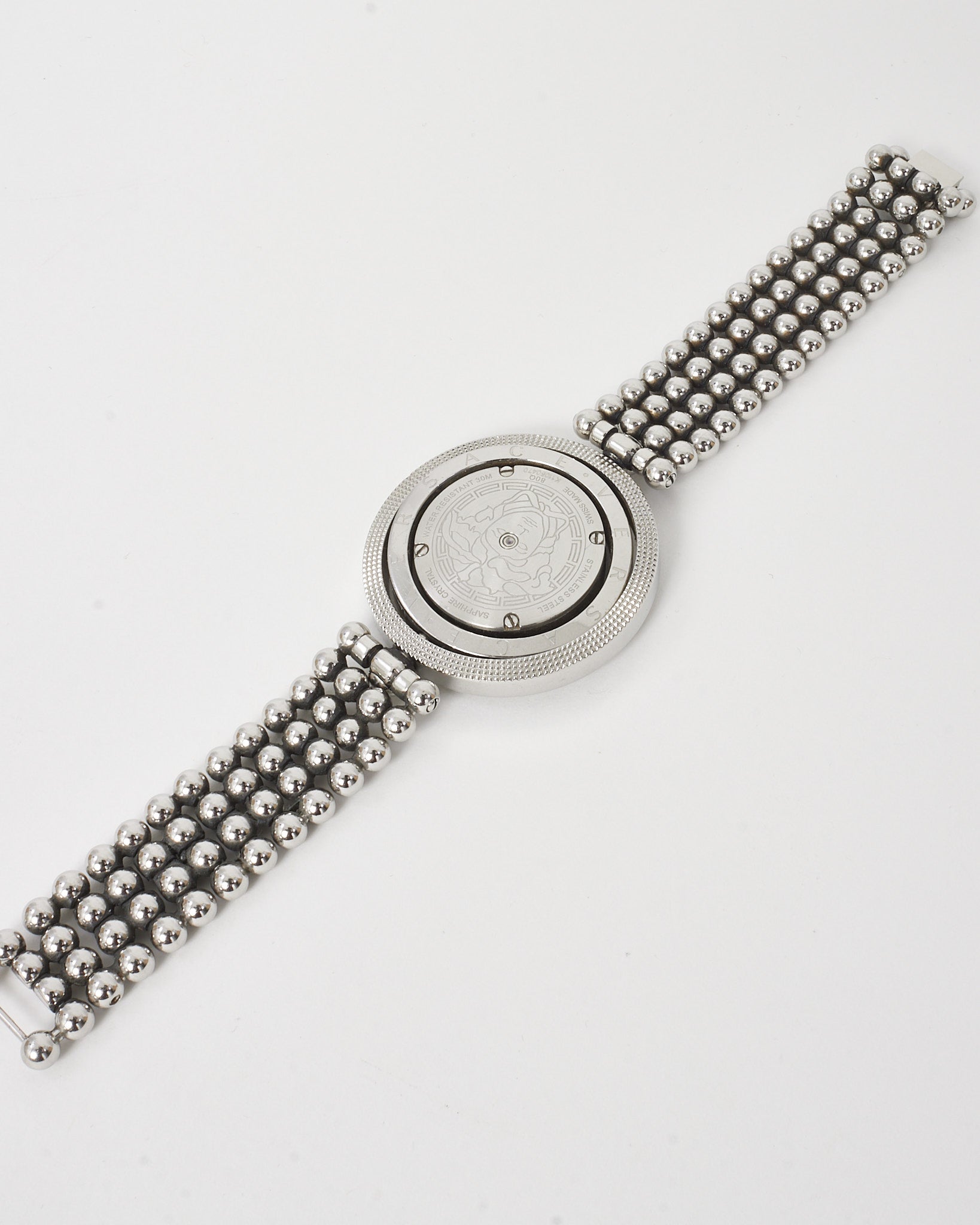 An embodiment of Italian luxury and innovative design, this pre-loved authentic Versace VQT050015 Eon Watch features a polished stainless steel case with a unique rotating ring bezel. Its sleek dial is protected by a scratch-resistant sapphire crystal, while the minimalist face highlights refined hour markers and the iconic Medusa logo at 12 o’clock. Finished with a precision quartz movement and a slim bracelet, this timepiece is both functional and fashion-forward. A bold yet elegant accessory that seamlessly fuses timeless craftsmanship with modern Versace flair.