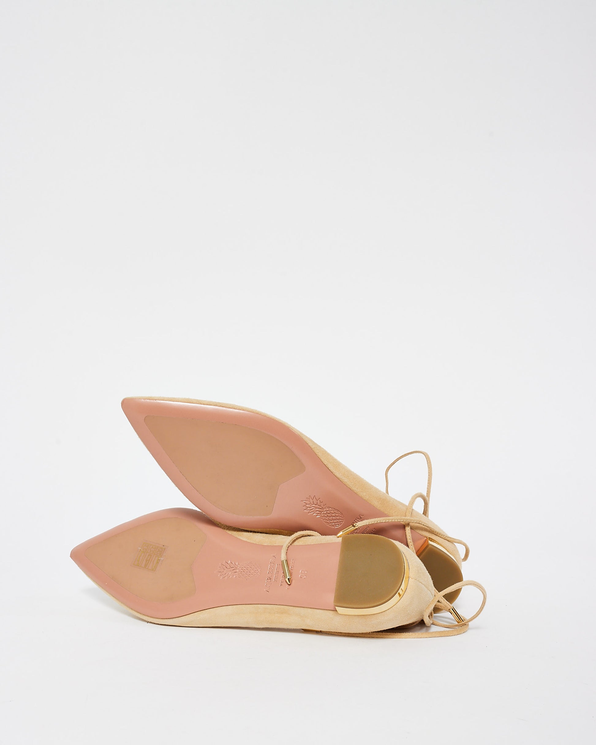 Beige Suede & Mesh Accents Lace Up Pointed Toe Ballet Flats - 38