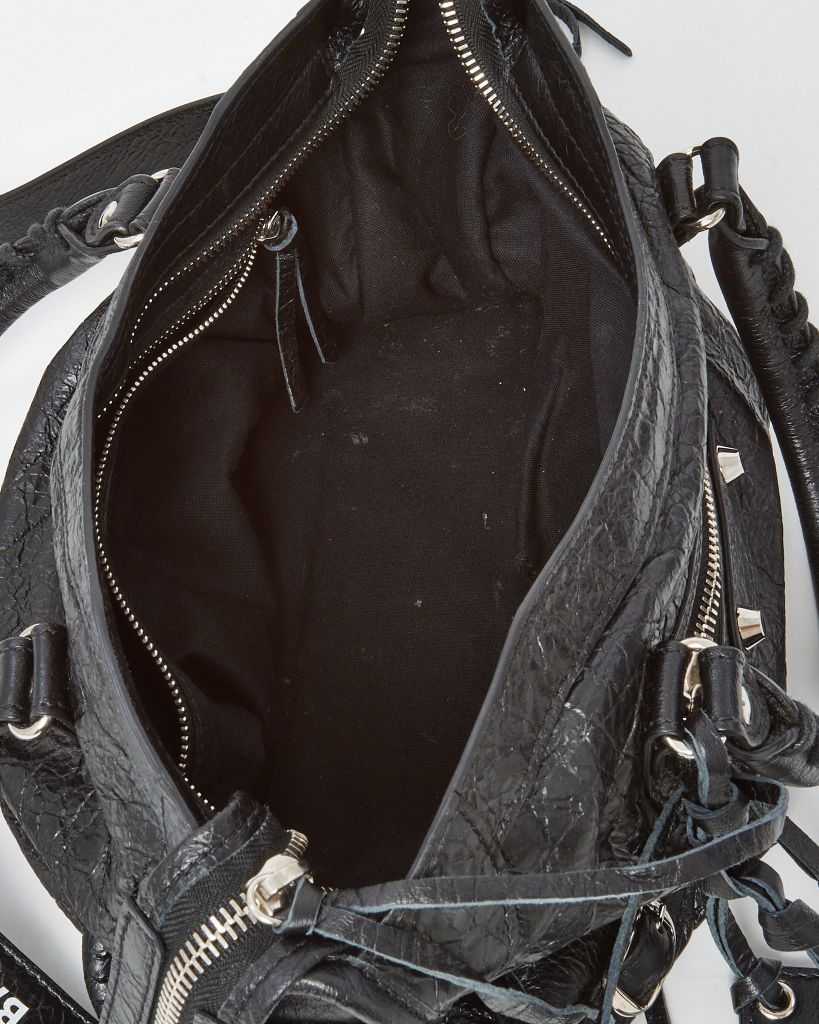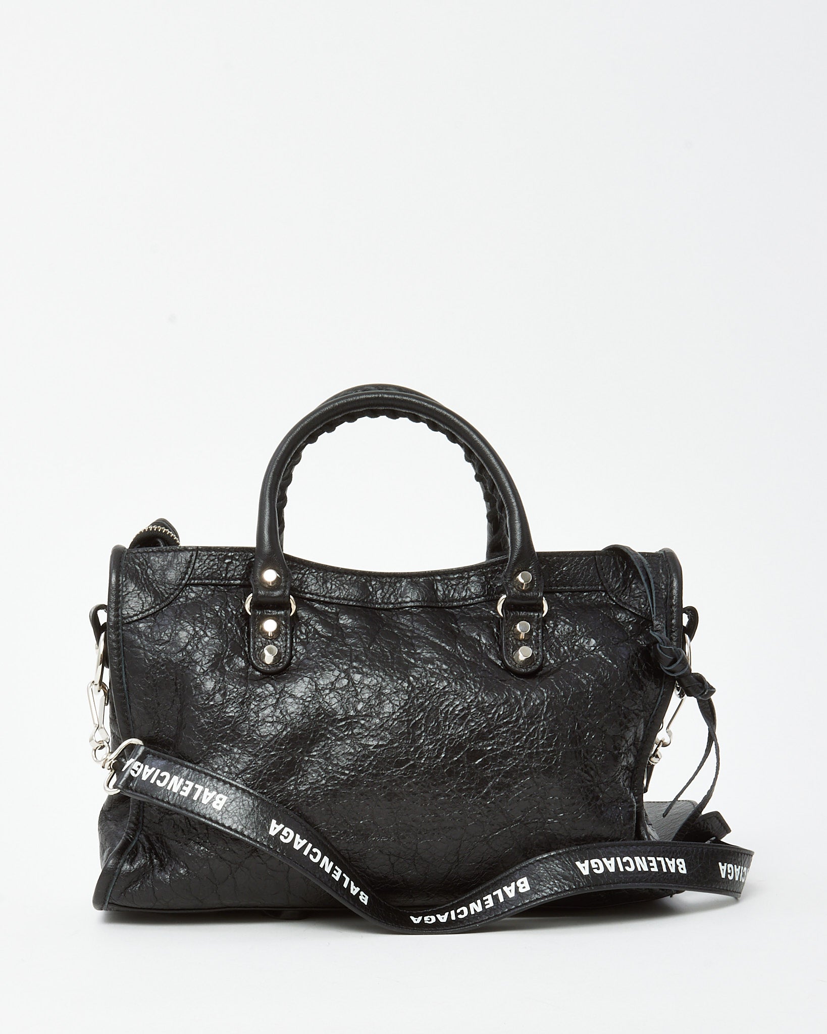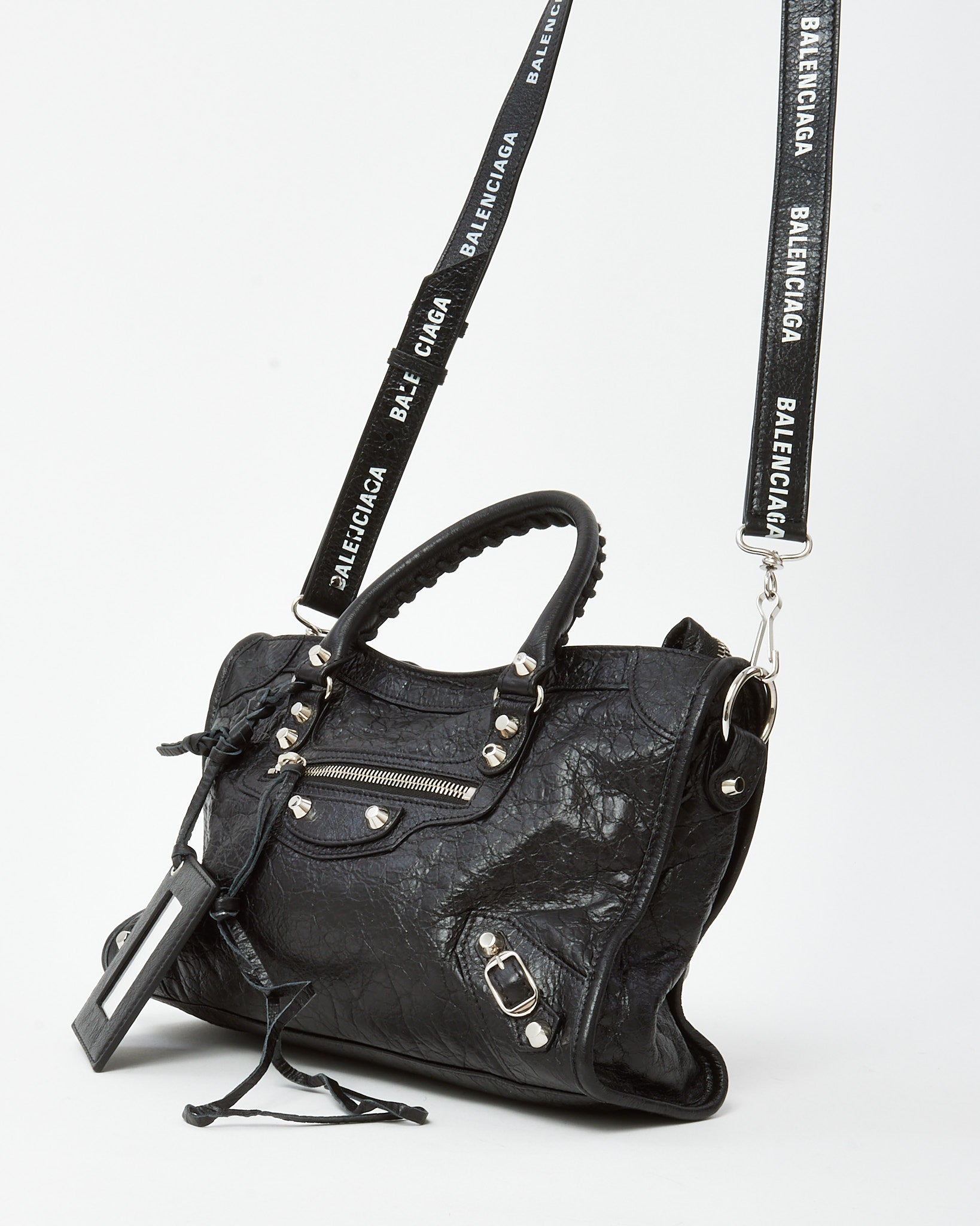 Channel iconic Balenciaga edge with this pre-loved authentic Balenciaga Black Arena Lambskin Leather Small Motorcycle City Bag with Logo Strap, crafted in supple Arena lambskin leather for a soft, lived-in texture. The classic Motorcycle City silhouette features signature stud hardware, zip detailing, and a relaxed structure that defines the house’s cult-favorite design. Updated with a branded logo strap for modern crossbody wear, this compact yet functional bag offers versatility while maintaining its signature attitude. A timeless Balenciaga handbag that blends heritage biker-inspired style with contemporary street-luxury appeal.