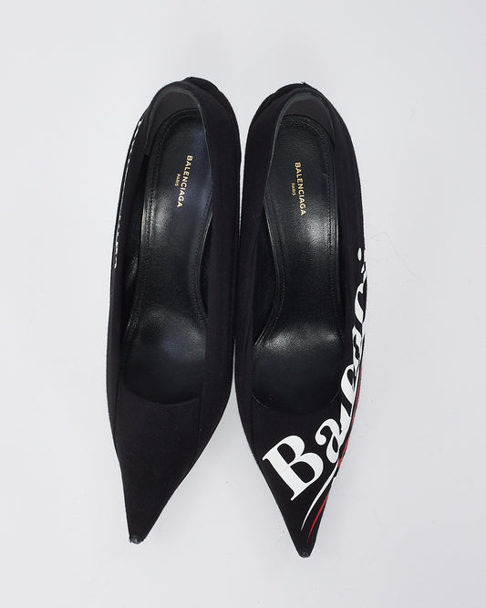 These are authentic pre-owned Balenciaga Black Fabric & Leather Campaign Logo Pumps are a striking example of the brand’s edgy yet sophisticated aesthetic. Combining sleek materials with bold branding, these pumps are perfect for making a modern fashion statement.