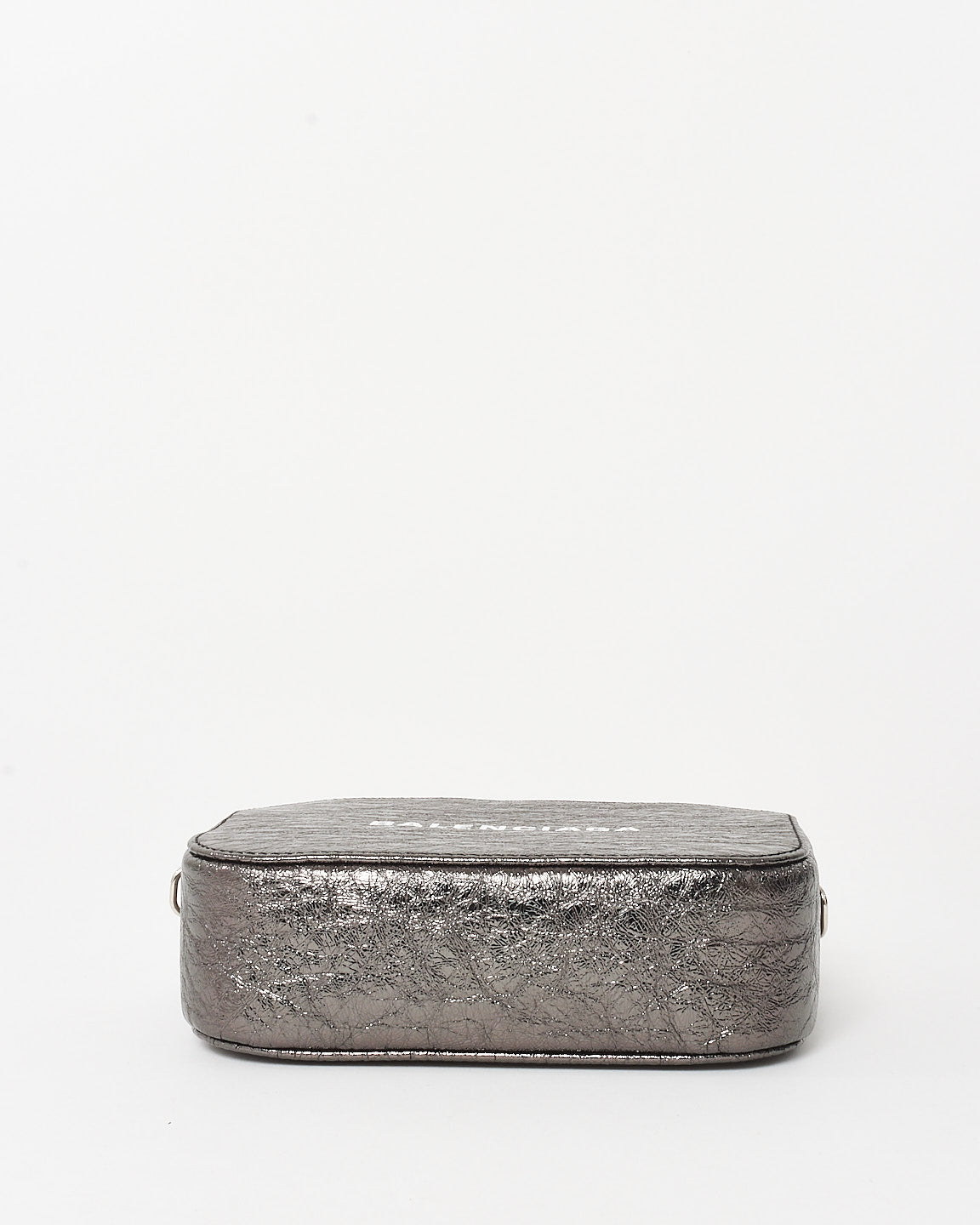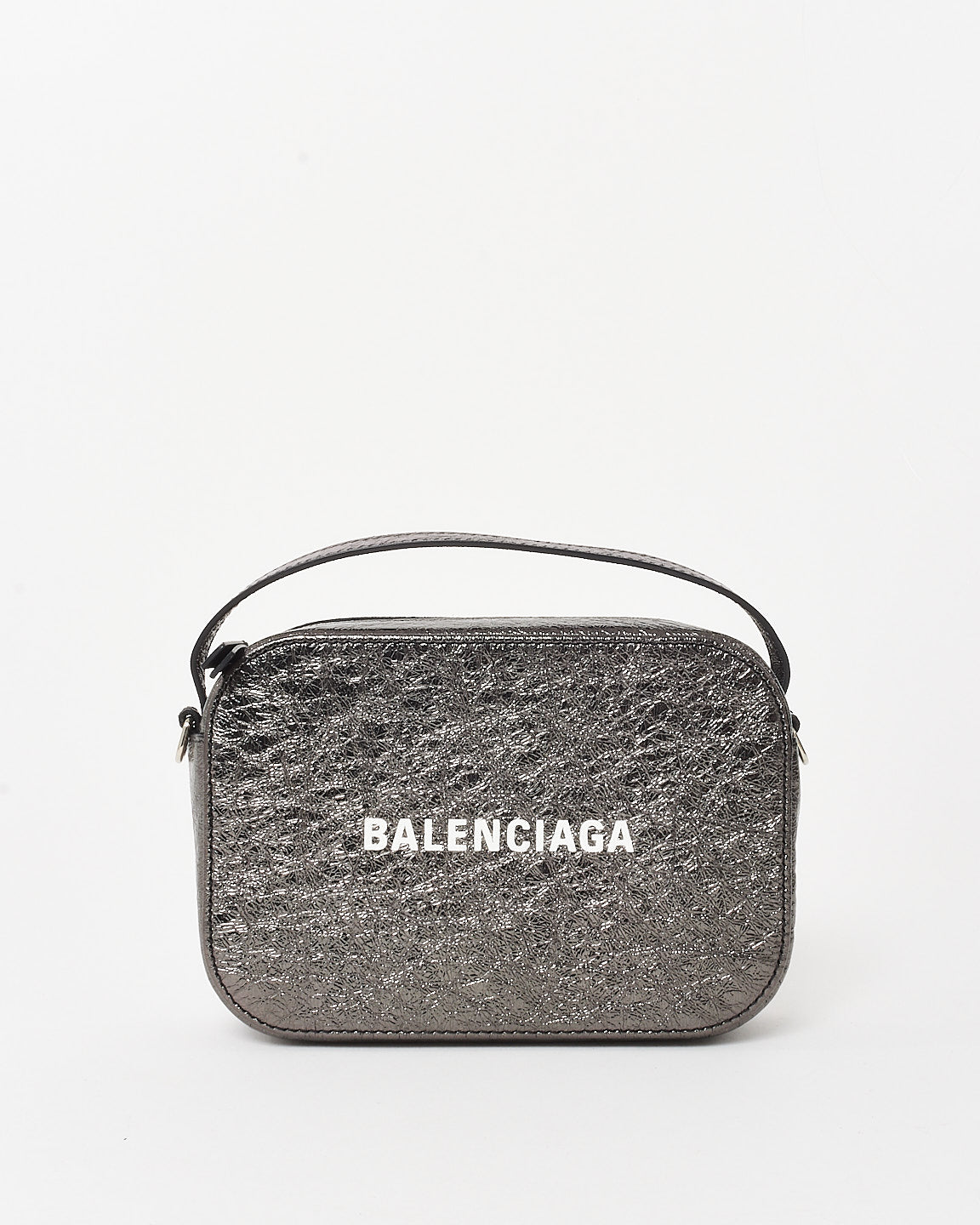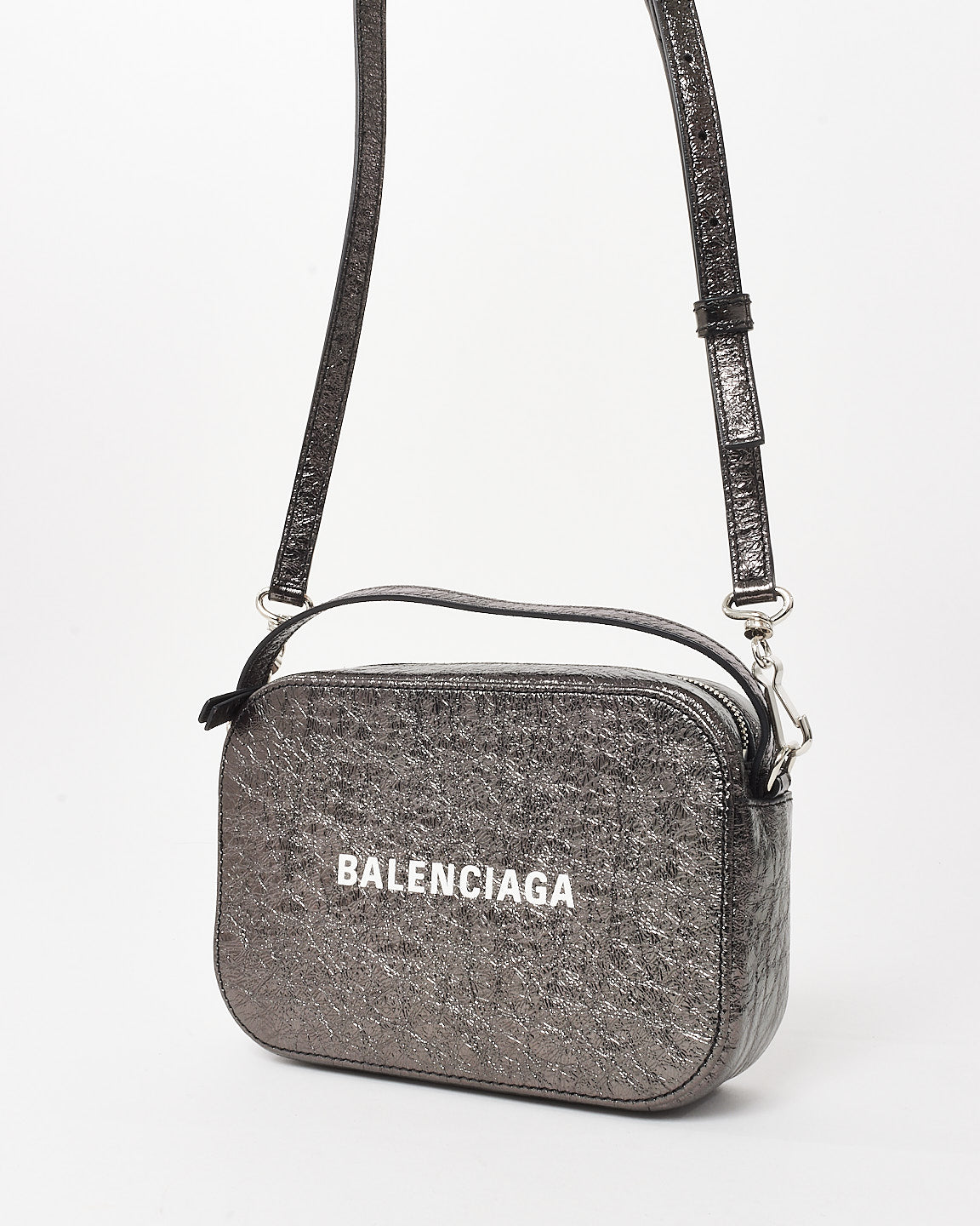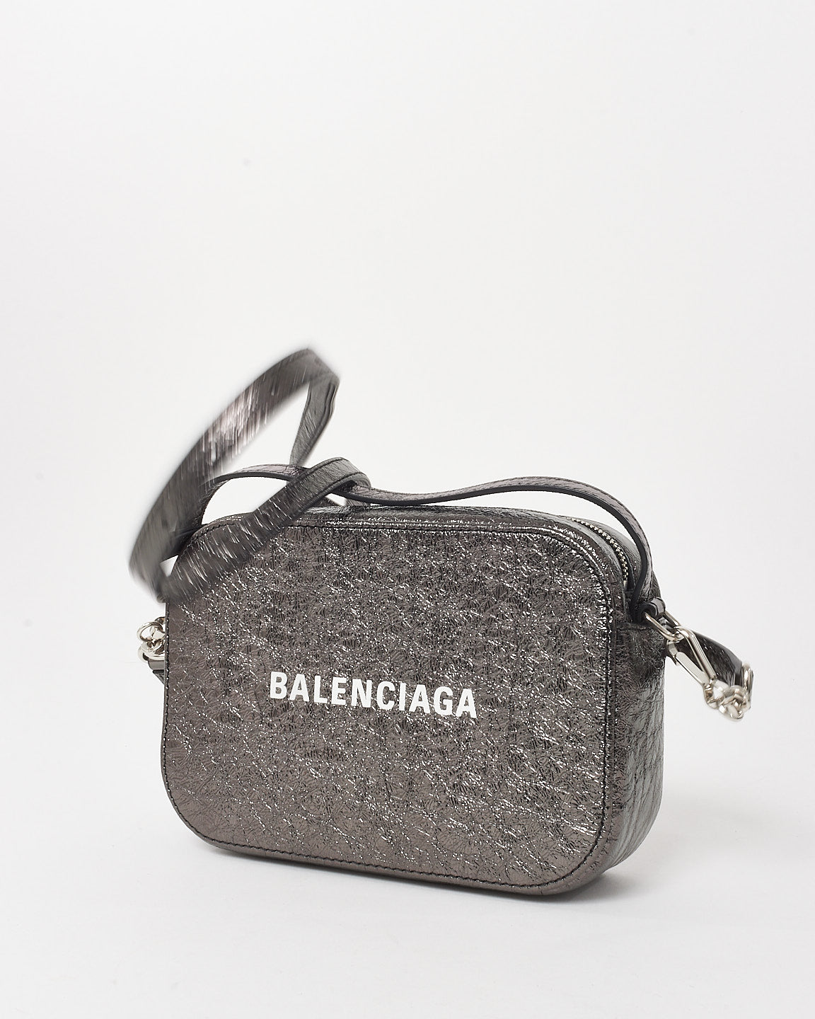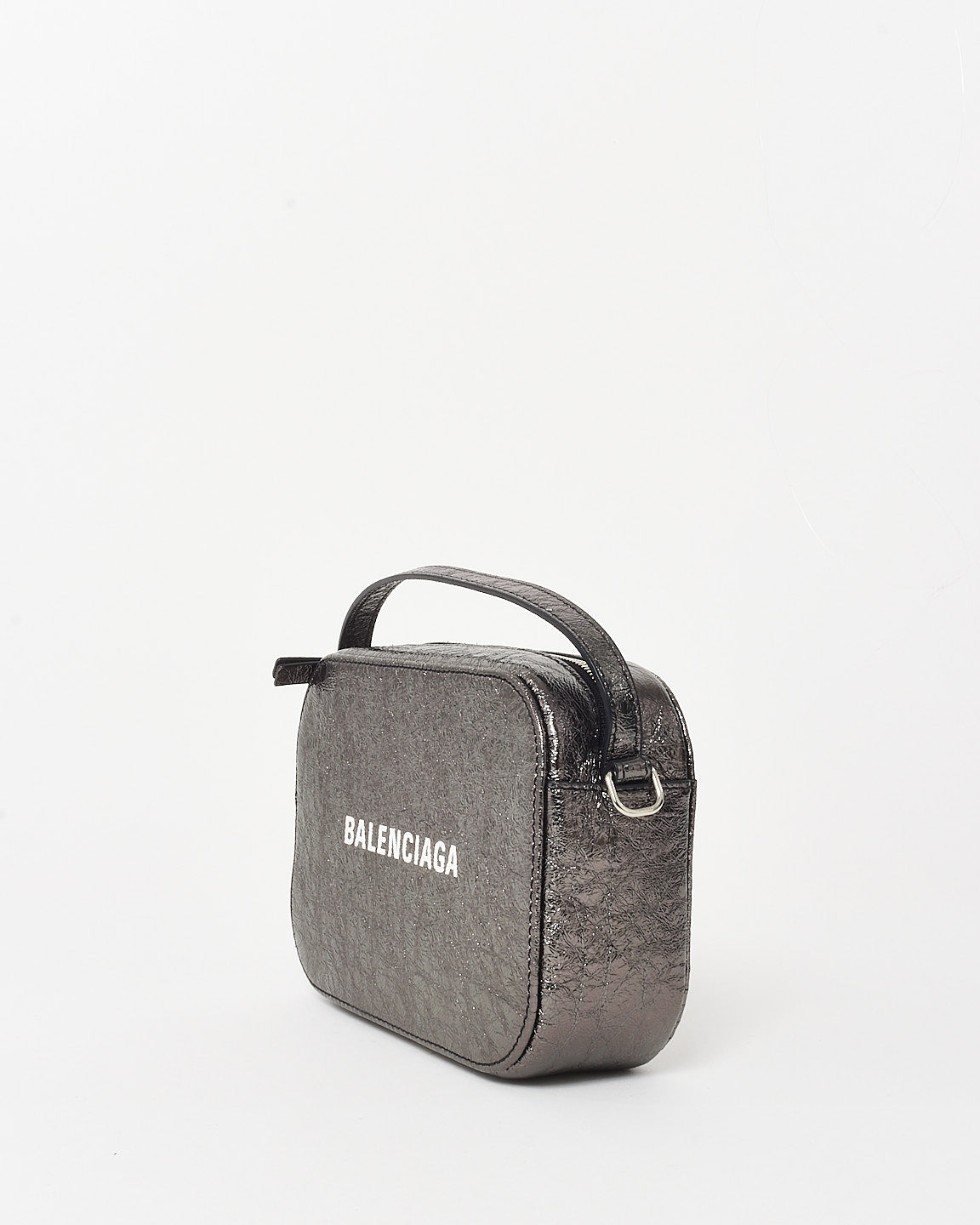 A sleek and modern staple, the pre-owned authentic Balenciaga Black Metallic Textured Calfskin Leather Everyday XS Camera Bag is a compact yet statement-making accessory. Crafted from black metallic textured calfskin leather, this bag offers a subtle shimmer, adding a contemporary edge to its minimalist design.