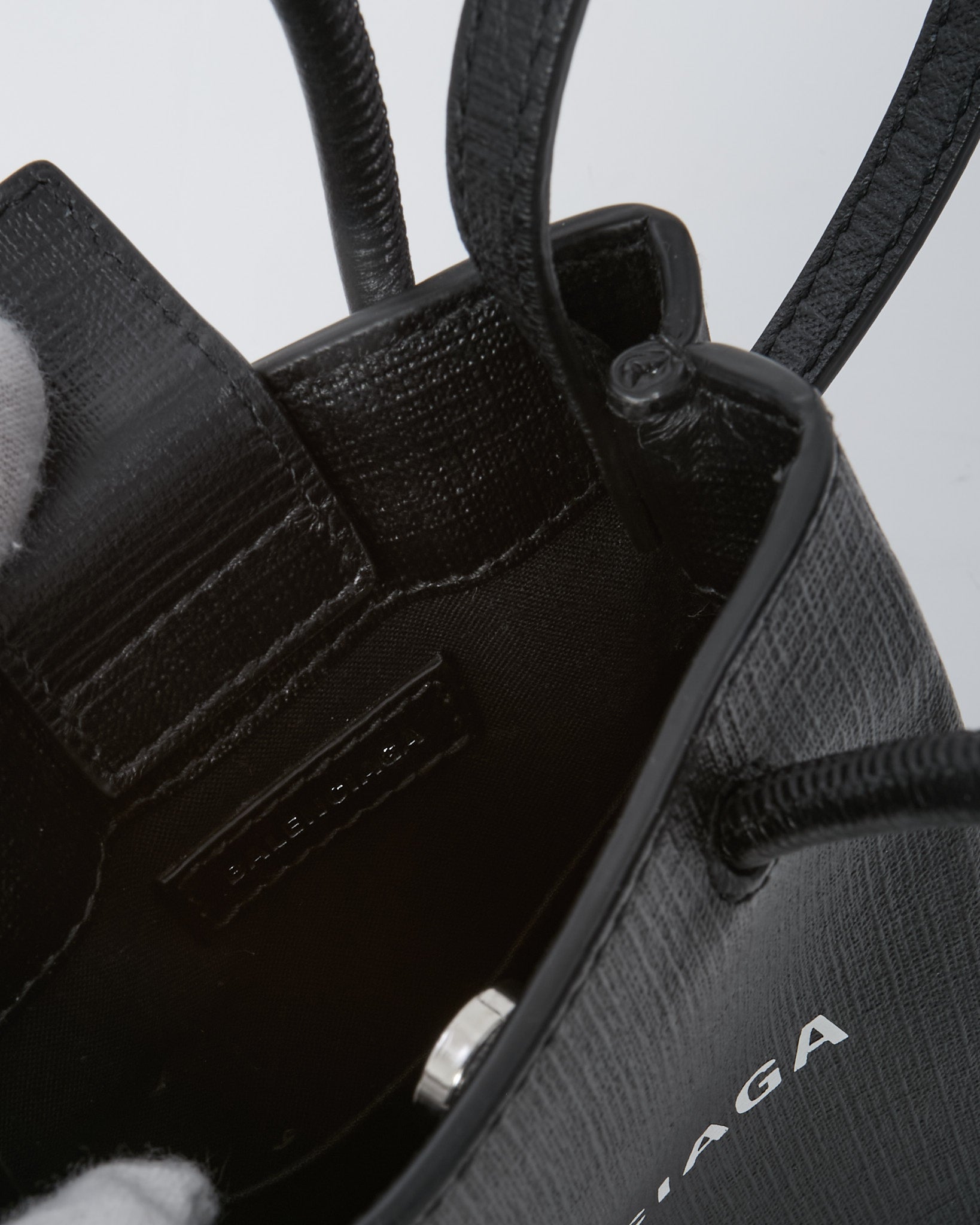 Add sleek utility to your everyday rotation with this pre-loved authentic Balenciaga Mini Shopping Phone Case Crossbody Bag, crafted in black textured leather with a bold white logo print. Featuring a compact silhouette, open top, and slim strap, this hands-free design keeps your phone and essentials close in streamlined style. Perfect for city days or on-the-go moments, it delivers minimalism with a high-fashion edge.