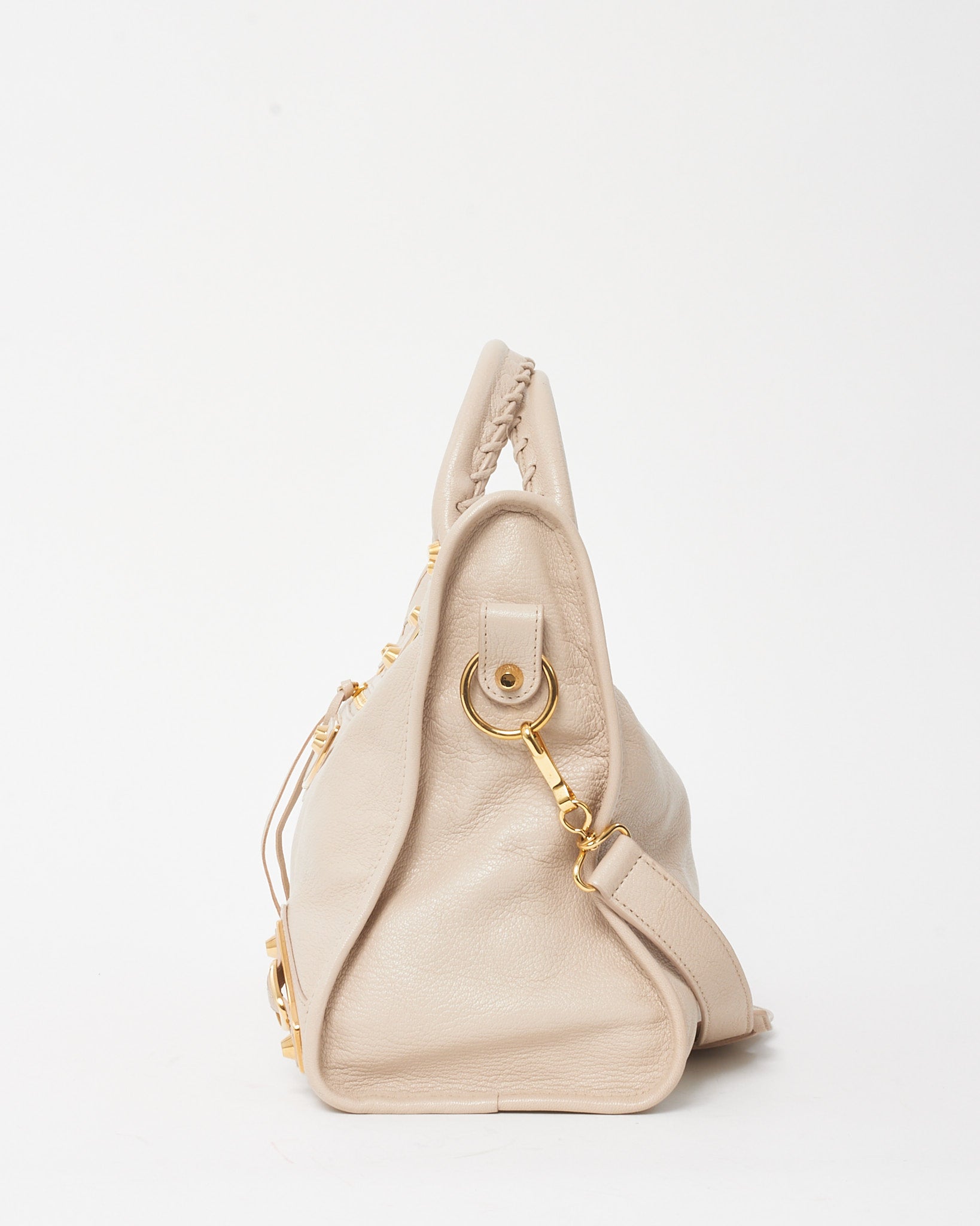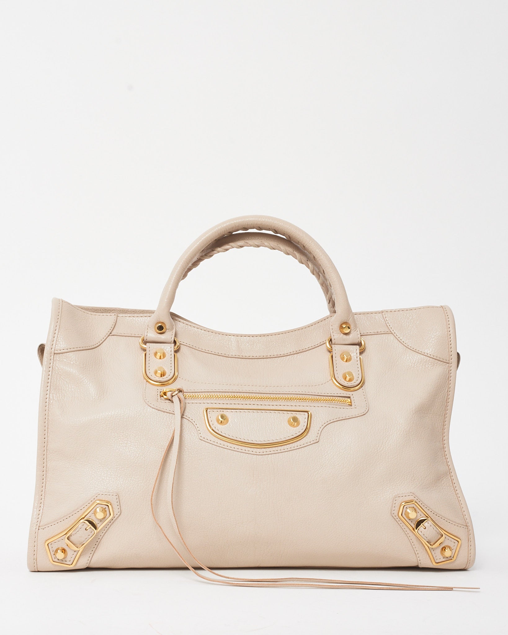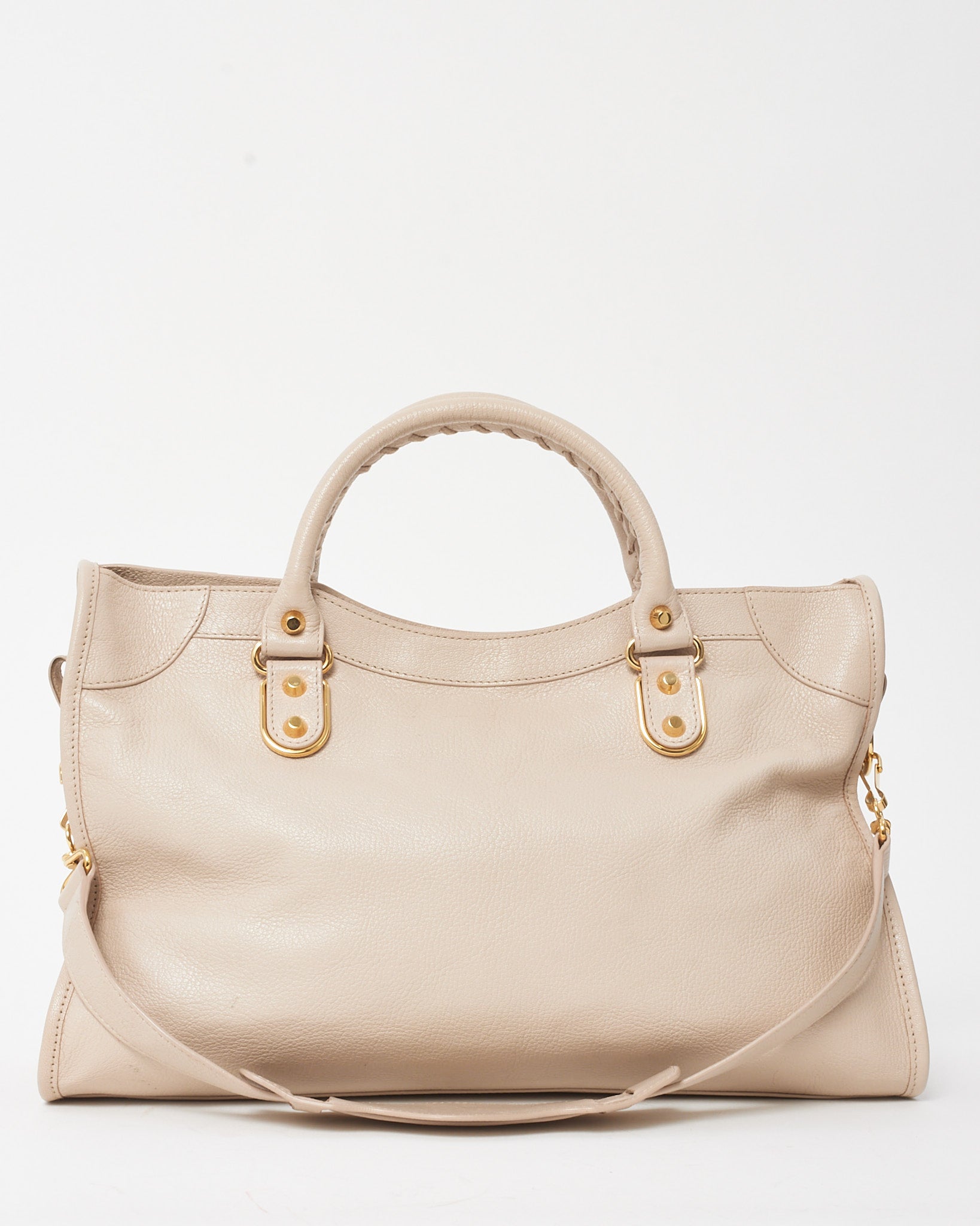 This pre-loved authentic Balenciaga Blush Pink Beige Praline Leather Gold Metallic Edge Moto City Bag delivers iconic edge with a feminine twist. Crafted from soft, distressed leather in a delicate blush tone, it features signature gold metallic edge hardware, whipstitched top handles, and moto-inspired detailing. Spacious yet lightweight, it includes a detachable shoulder strap and mirror for on-the-go ease.