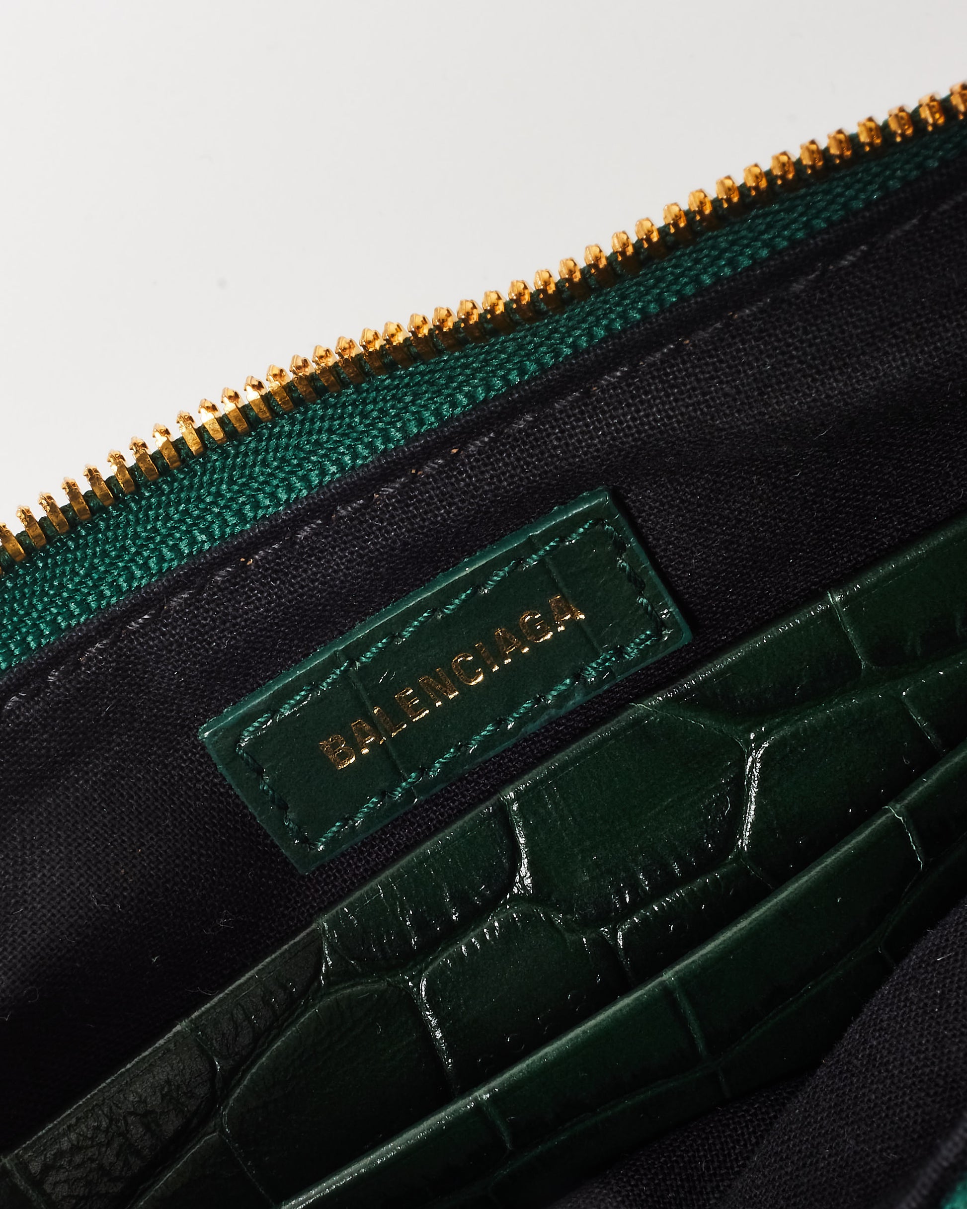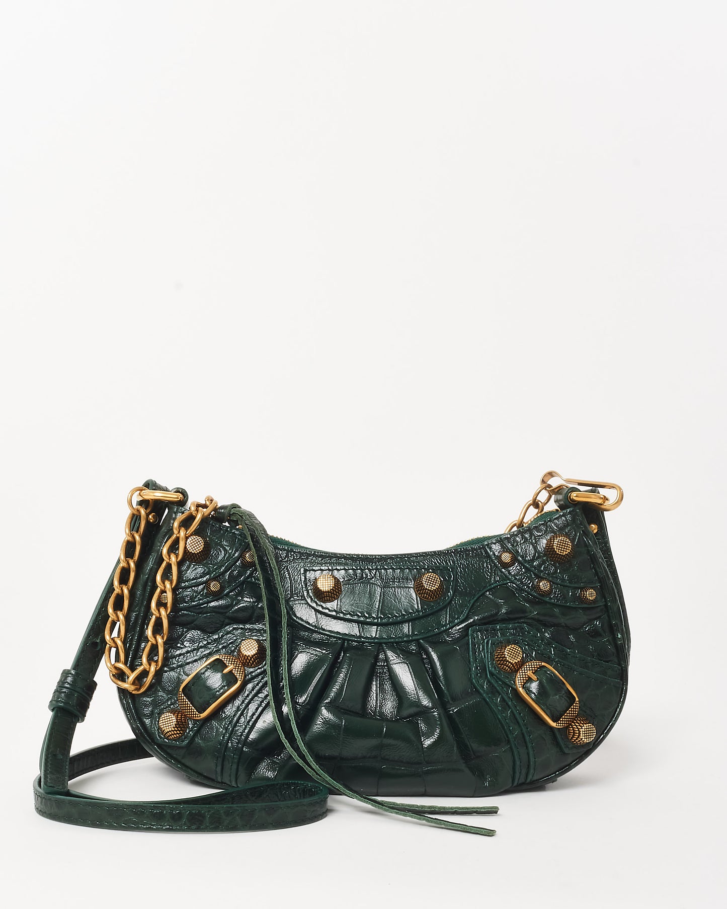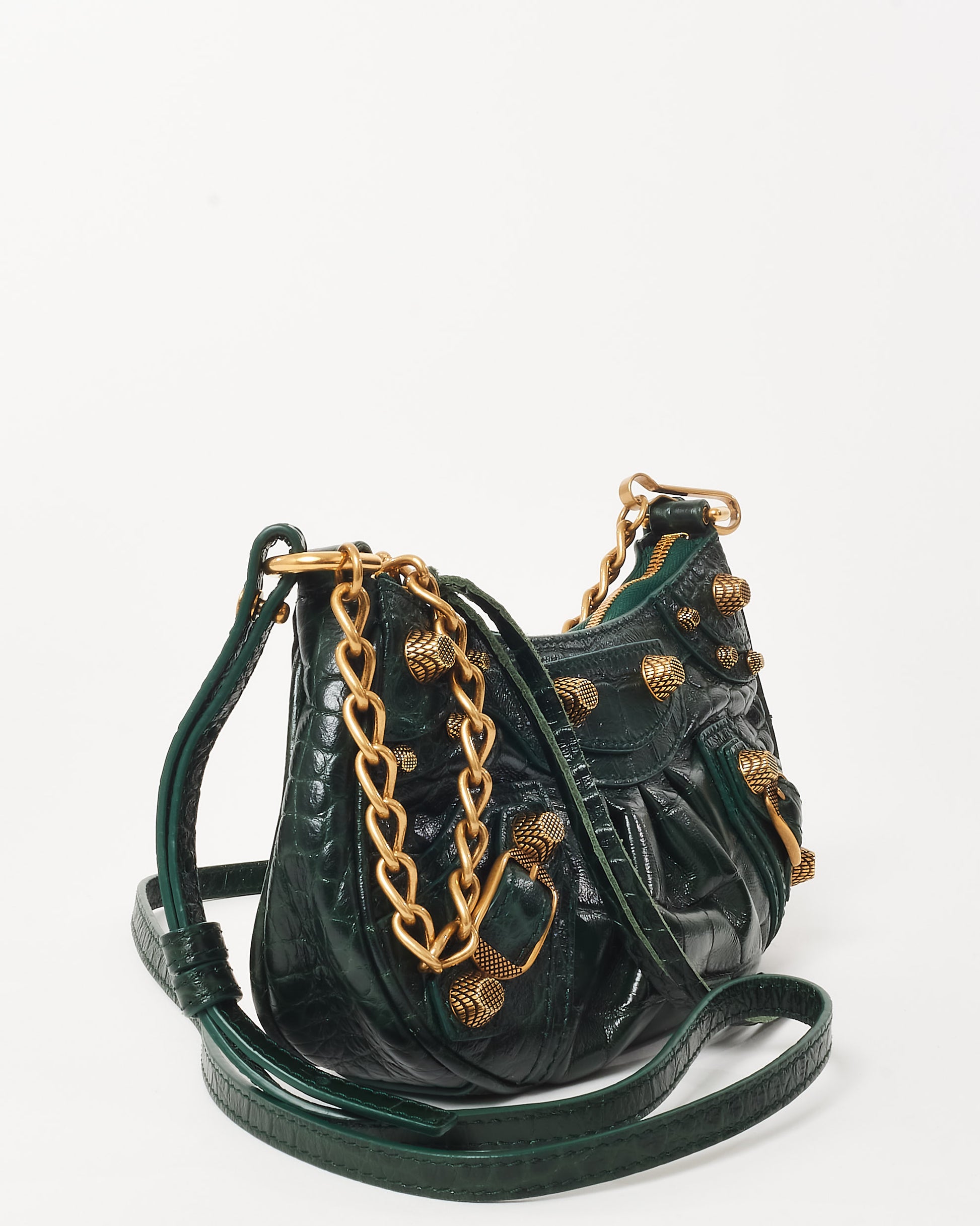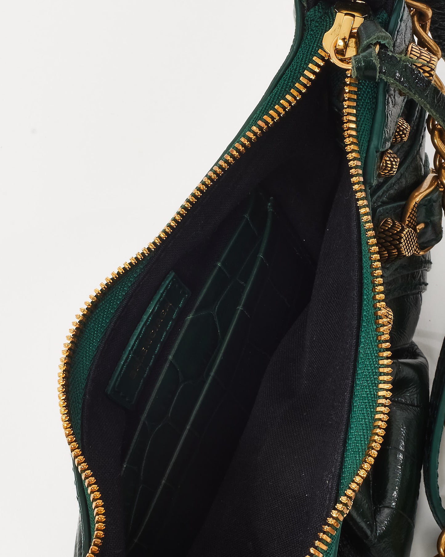 Edgy with a touch of glam, the pre-owned authentic Balenciaga Green Croc Embossed Leather Le Cagole Mini Bag is a bold statement in a compact silhouette. Crafted from vibrant green croc-embossed leather, this mini bag reimagines Balenciaga’s iconic moto aesthetic with chunky gold-tone hardware and studded detailing throughout.