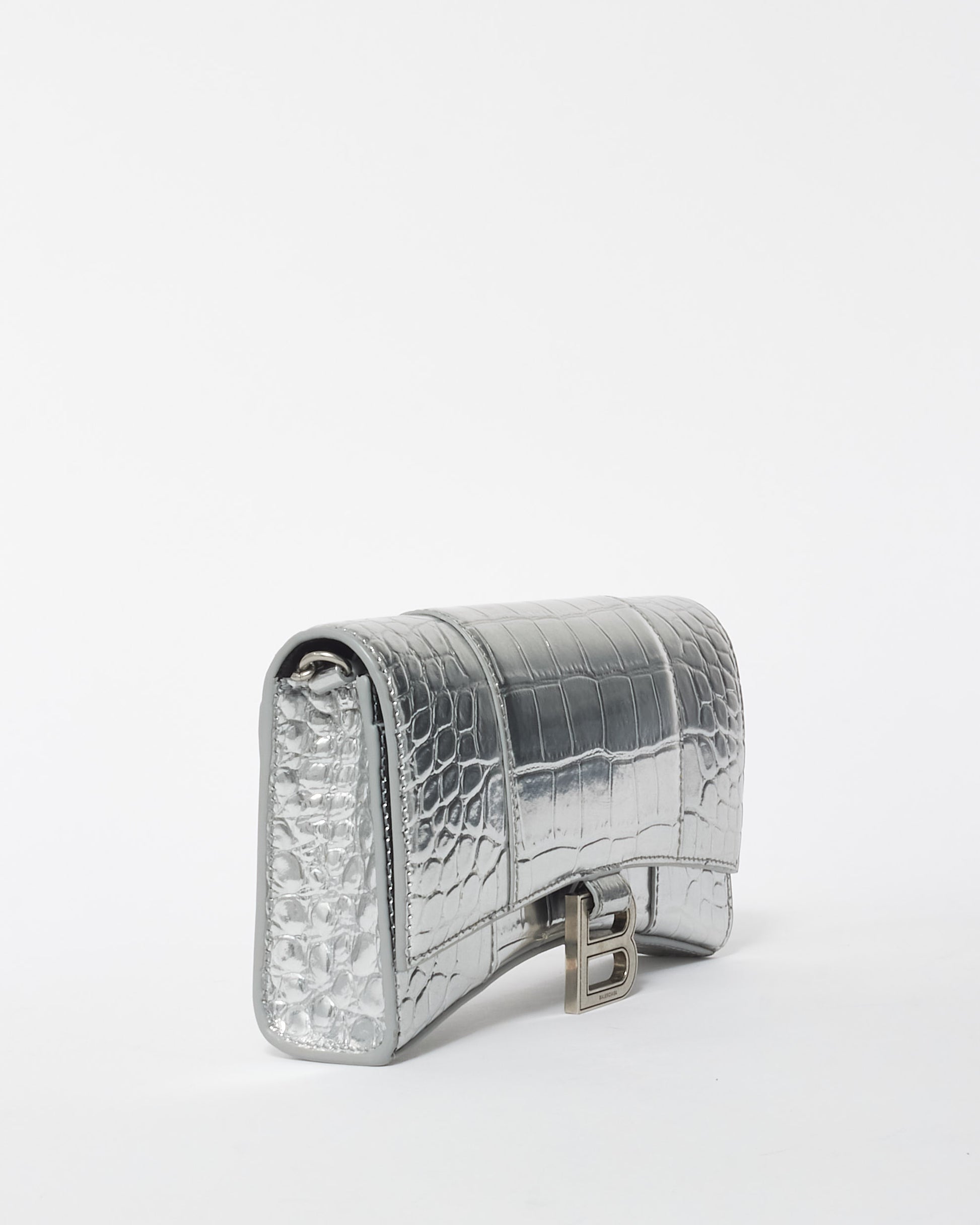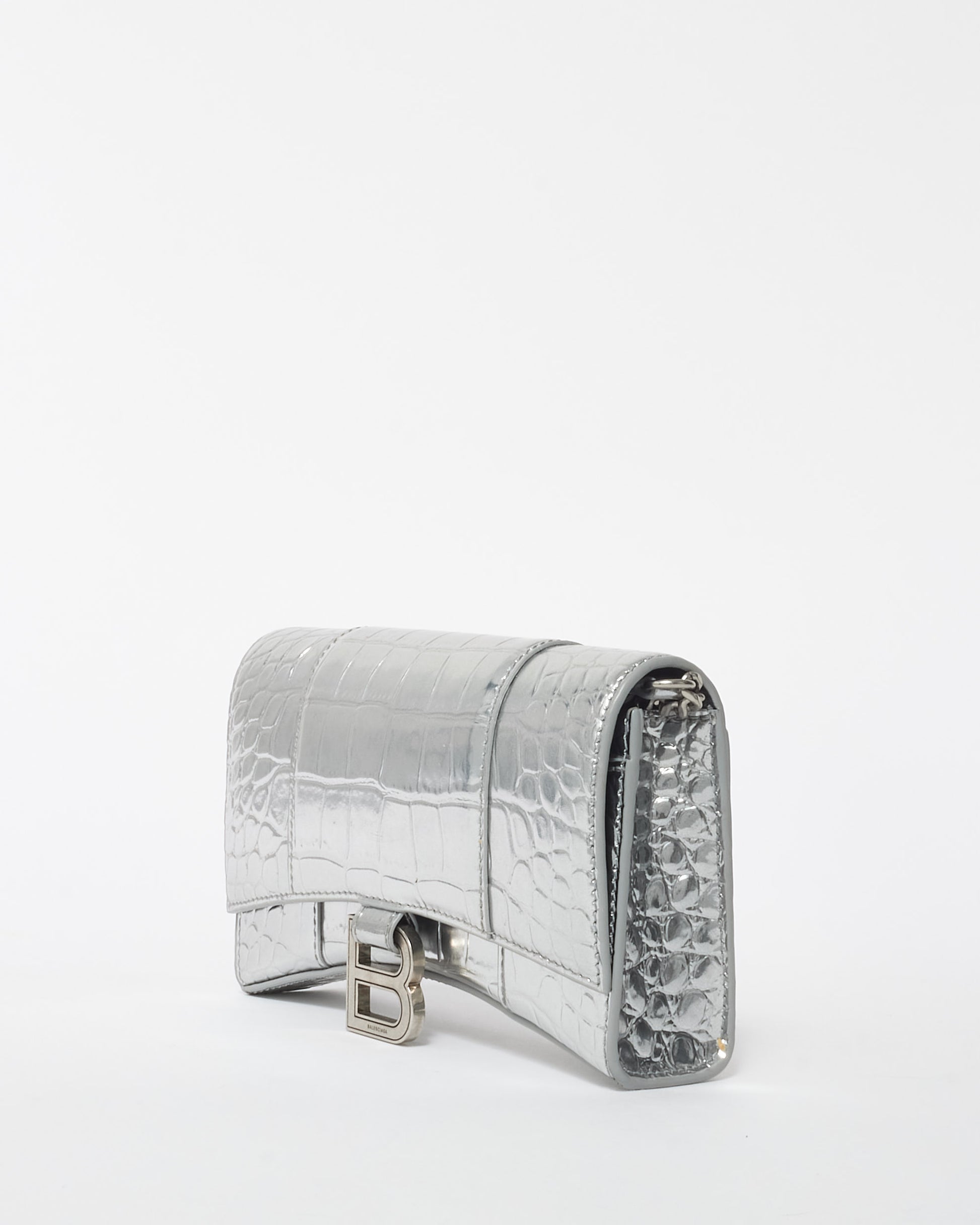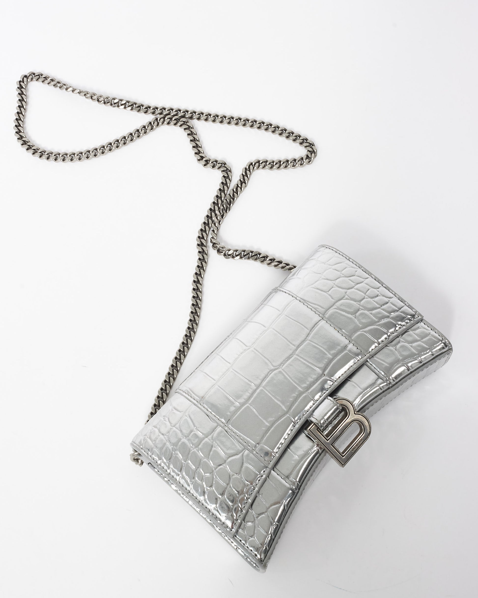 Explore Balenciaga's exquisite collection of Handbags, featuring this certified pre-owned Silver Croc Embossed Hourglass Chain Bag. Embodying timeless elegance and modern sustainability, each piece, including favorites like this, is authenticated by Retyche. Discover sustainable luxury — shop our current treasures or find inspiration for your next coveted find.
