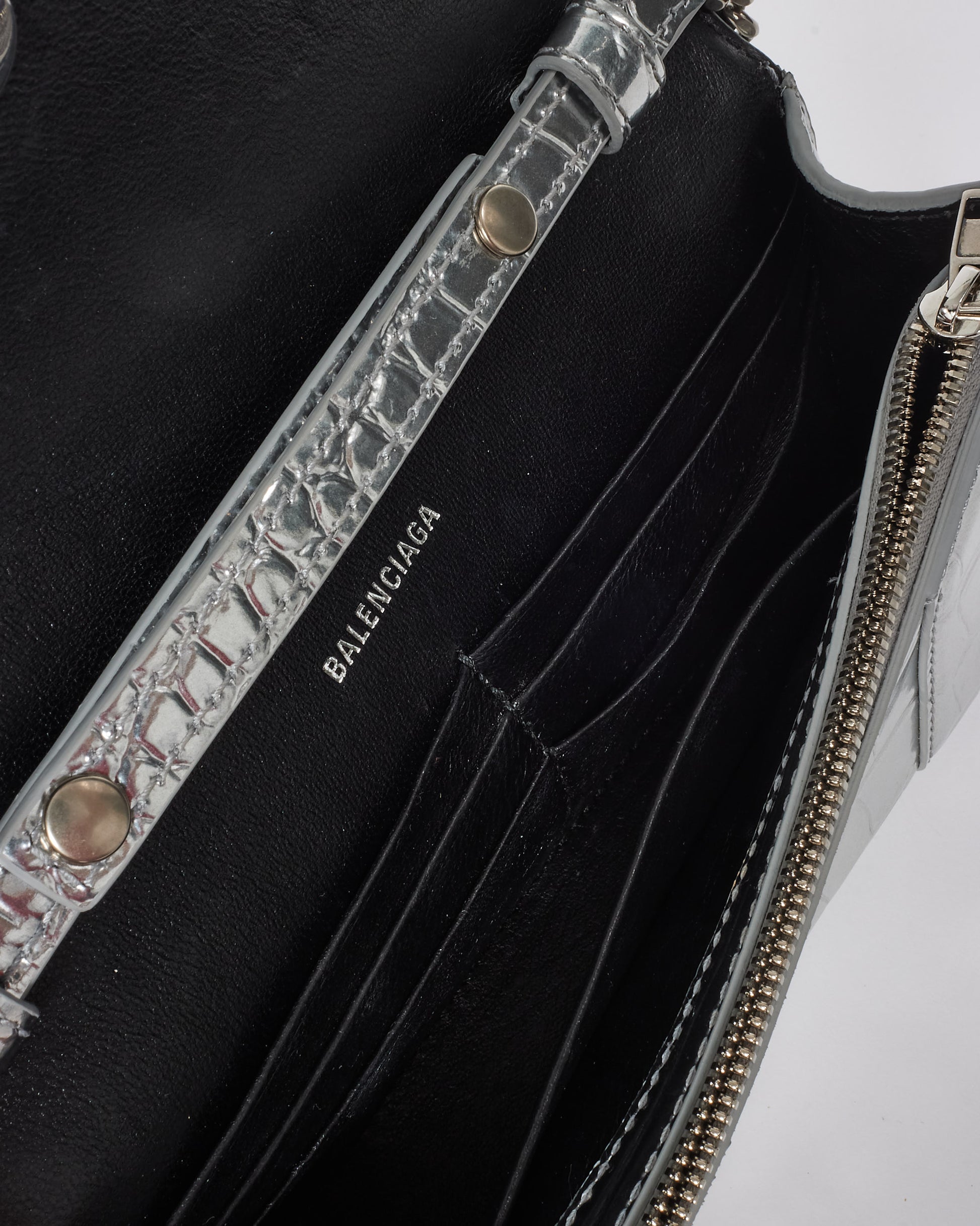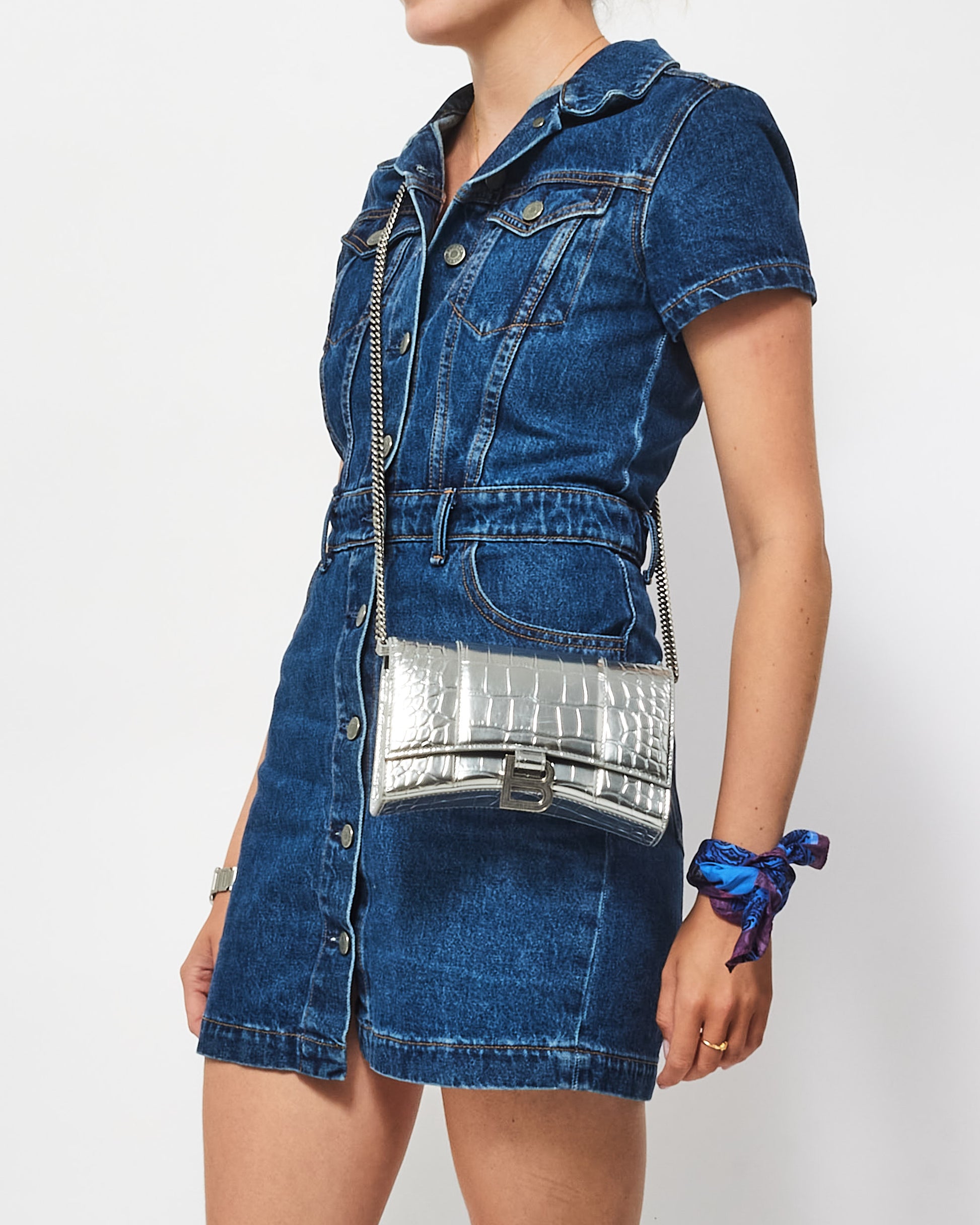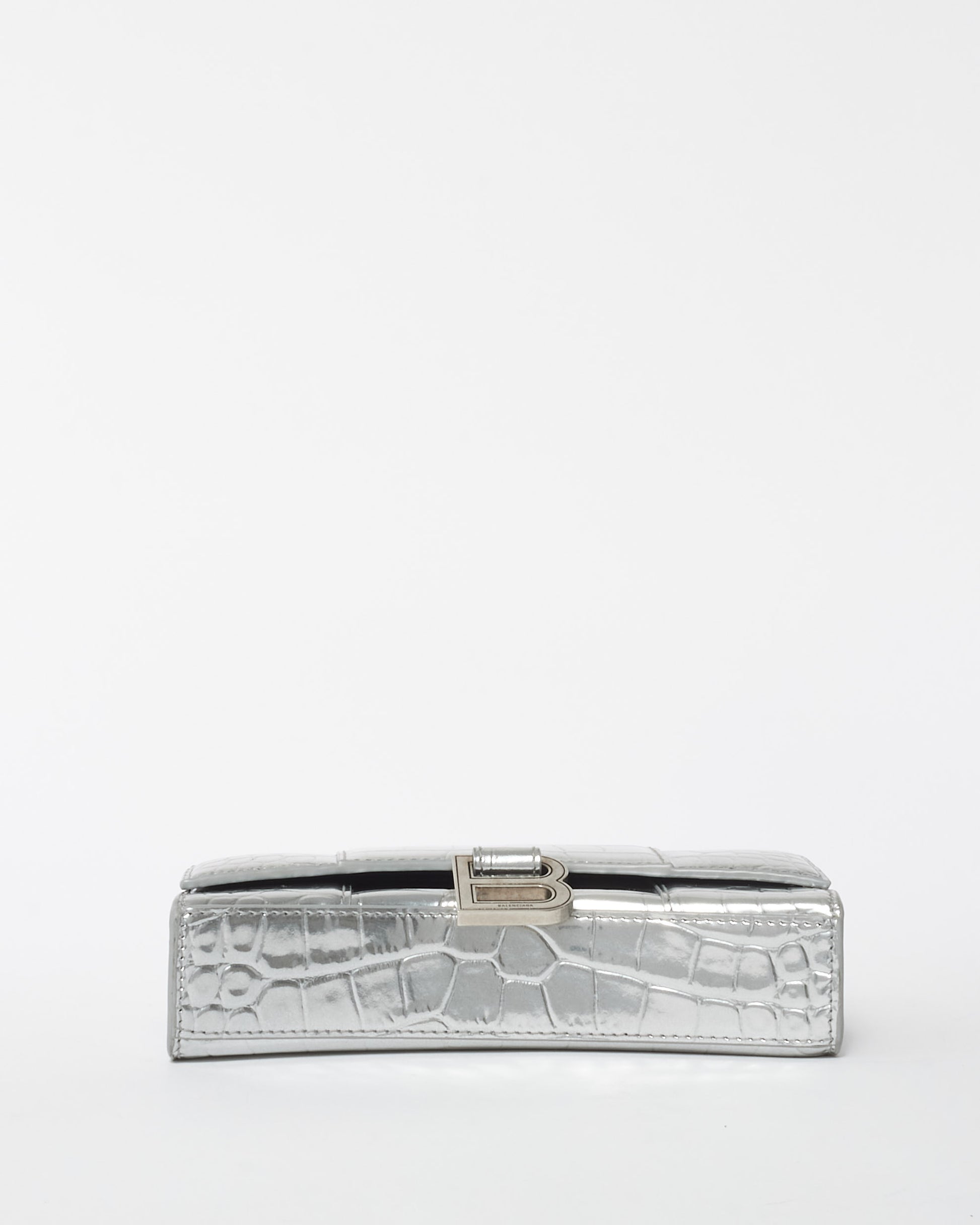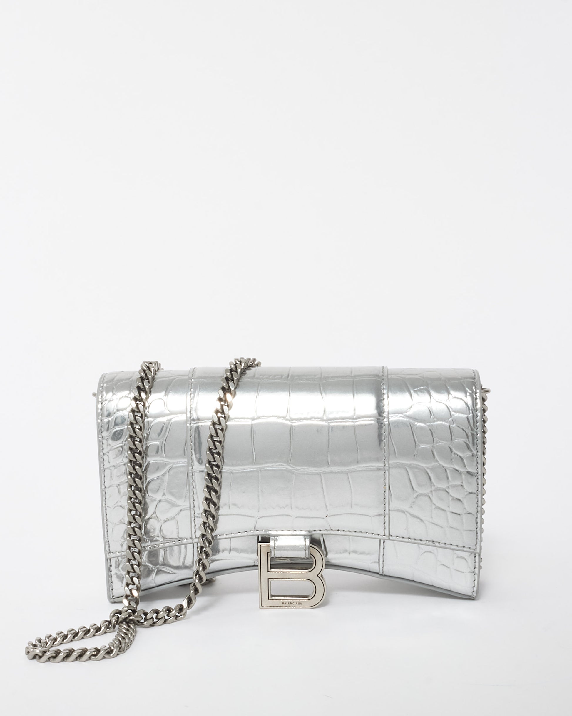 Explore Balenciaga's exquisite collection of Handbags, featuring this certified pre-owned Silver Croc Embossed Hourglass Chain Bag. Embodying timeless elegance and modern sustainability, each piece, including favorites like this, is authenticated by Retyche. Discover sustainable luxury — shop our current treasures or find inspiration for your next coveted find.