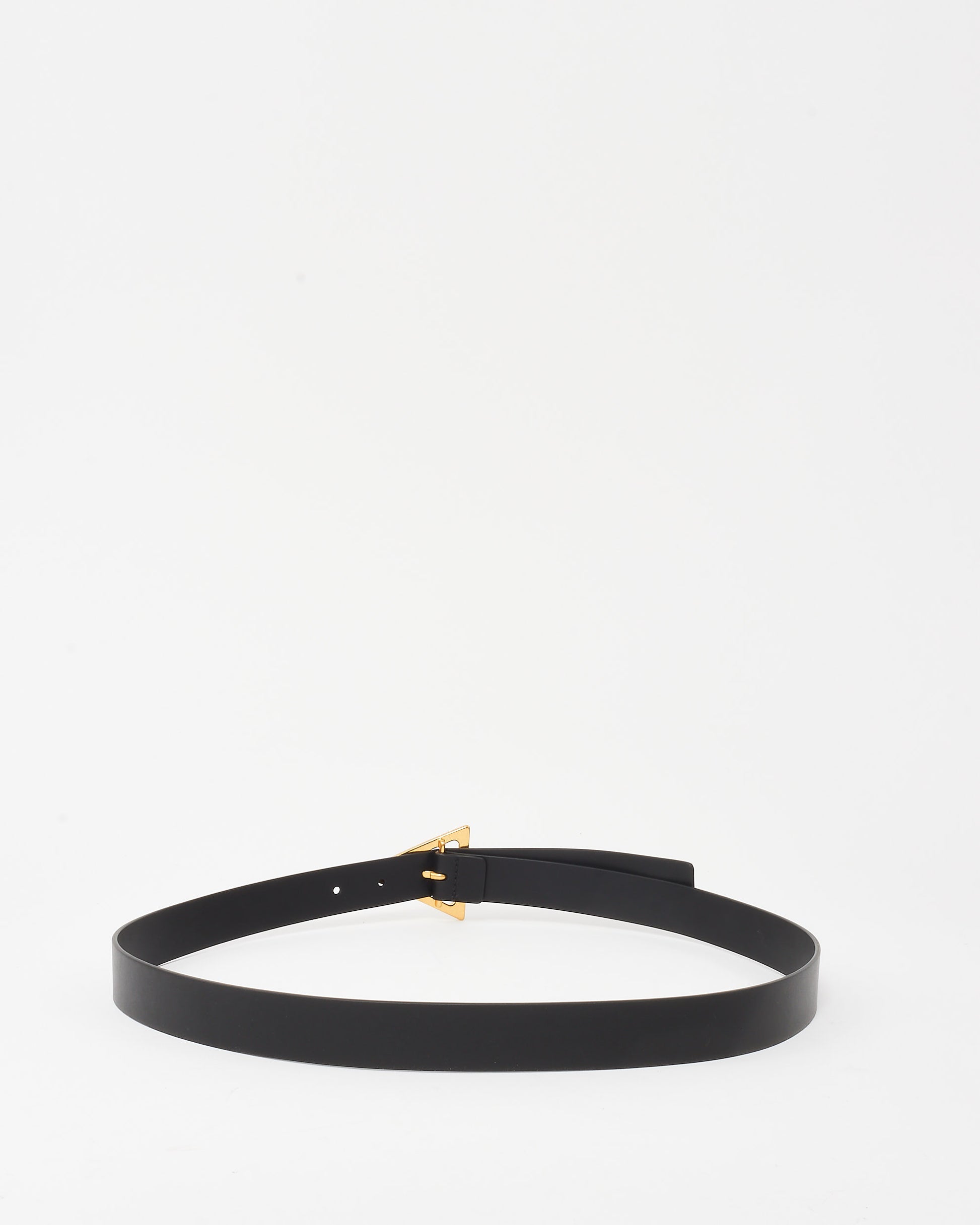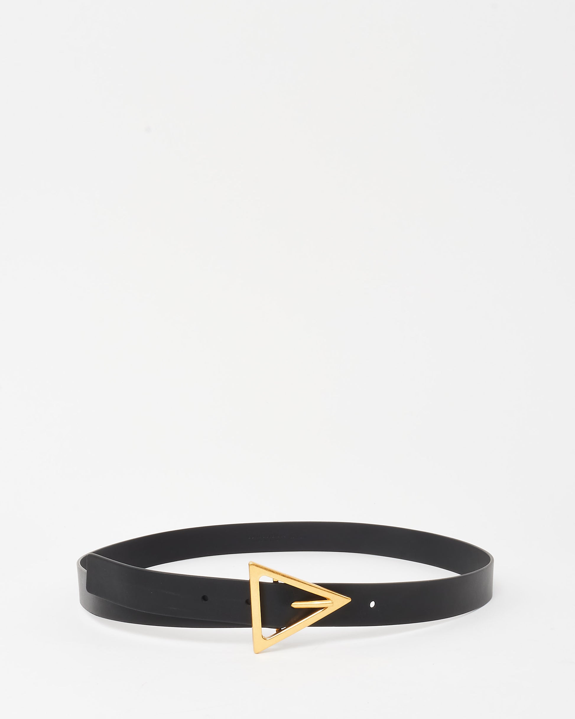 A sleek and modern statement piece, the authentic pre-owned Bottega Veneta Black Leather Gold Triangle Belt embodies the brand’s signature minimalist aesthetic with a bold touch. Crafted from smooth black leather, this belt features a slim, structured silhouette, making it a versatile accessory for any wardrobe.