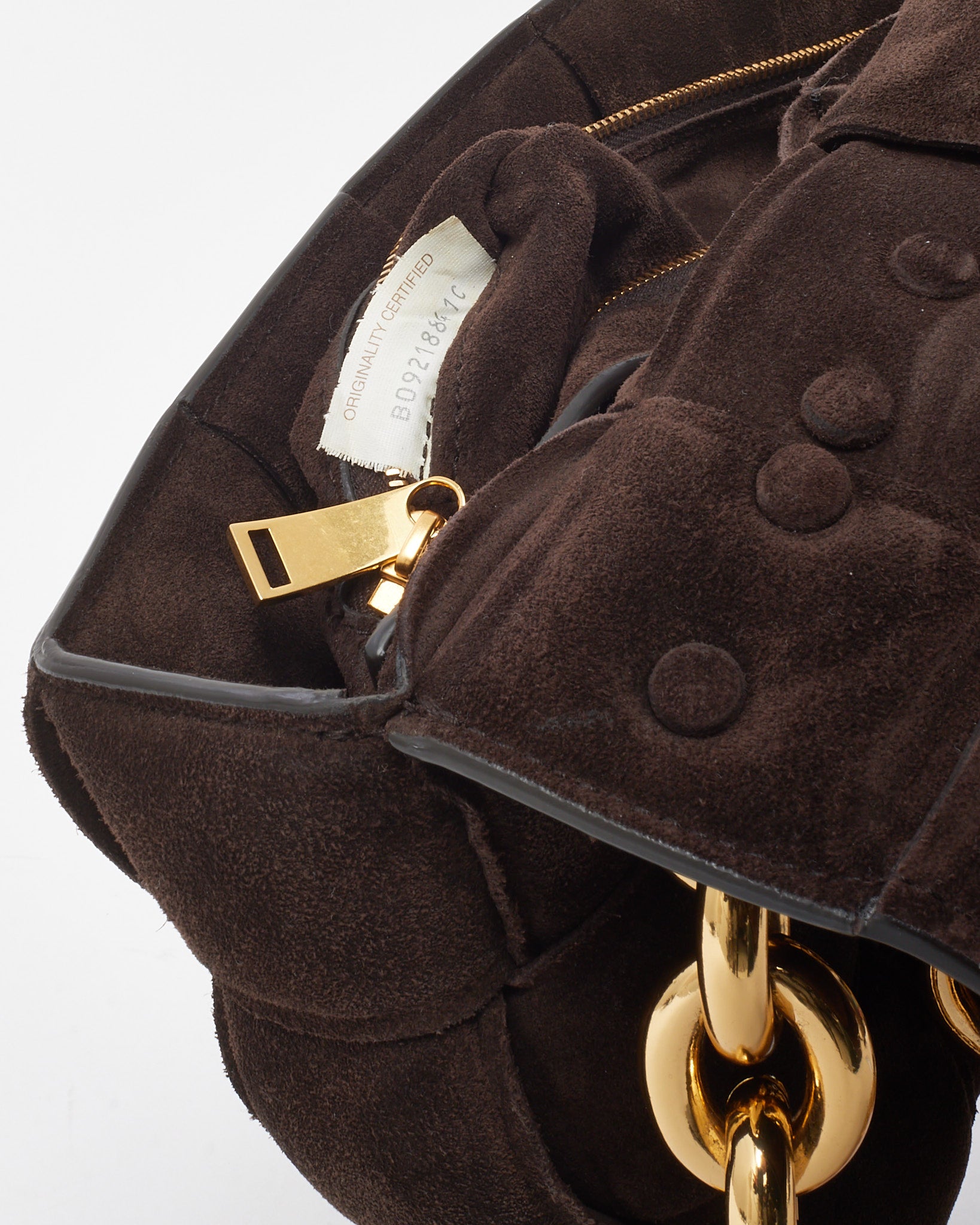 Make a statement with this pre-loved authentic Bottega Veneta Chain Cassette bag, rendered in rich brown suede and defined by the house’s signature oversized intrecciato weave. The structured, padded silhouette is elevated with a bold gold-tone chain strap, offering a tactile contrast and luxurious edge. Designed to wear over the shoulder or as a crossbody, this standout piece brings modern artistry and everyday functionality into one striking design — a timeless accessory for the style-conscious collector.