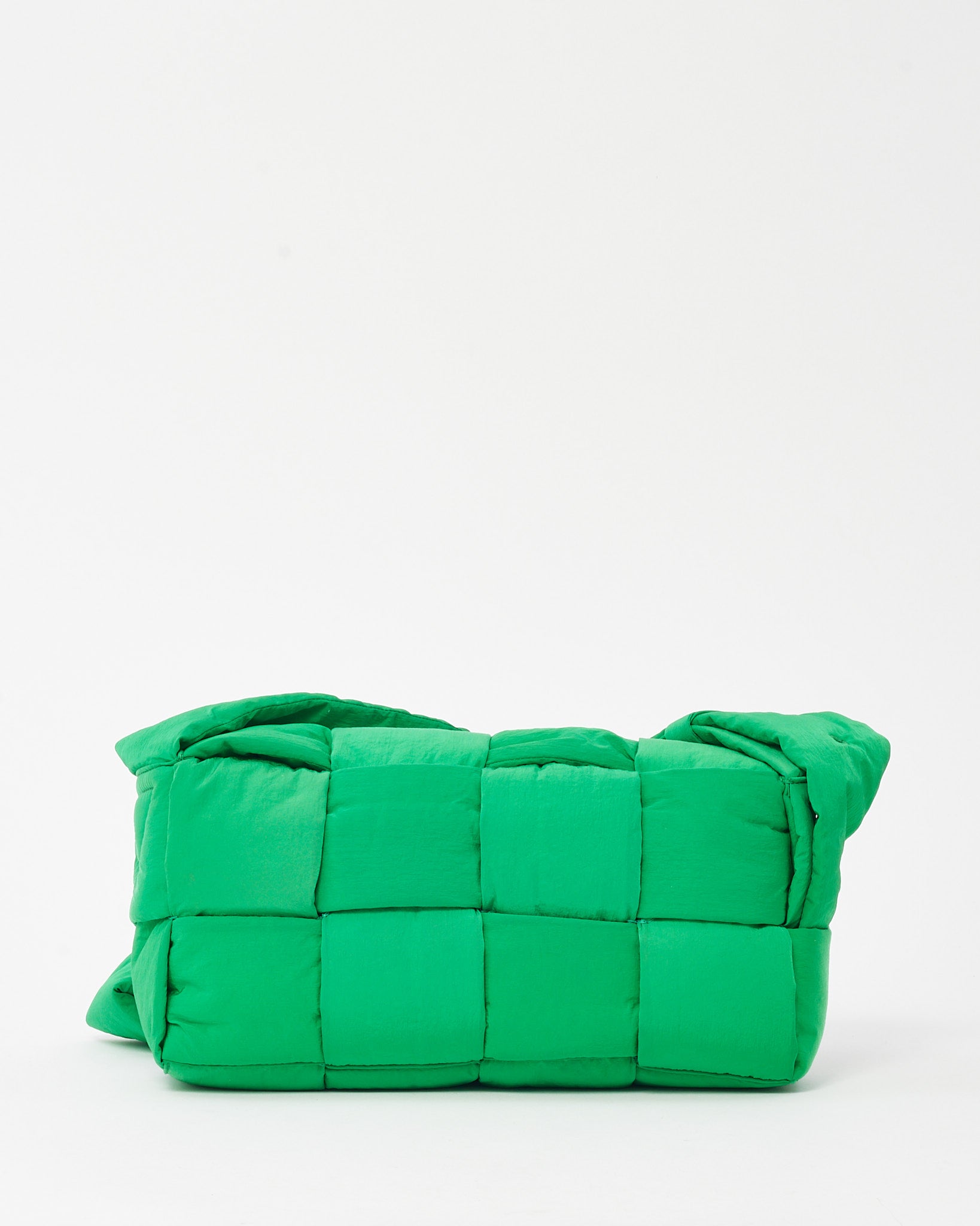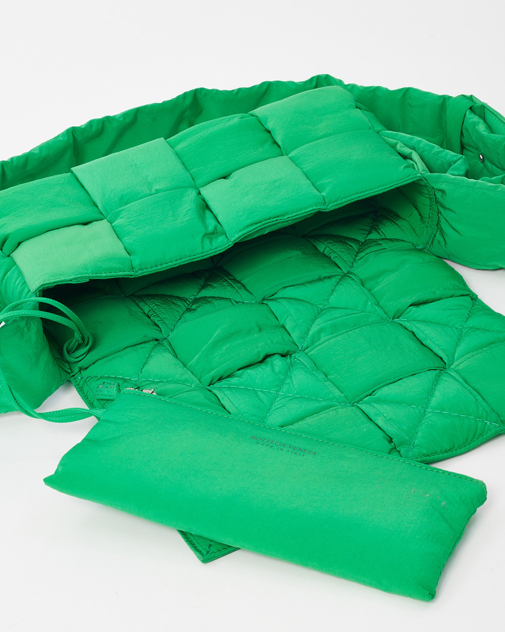 Step out in bold color with this pre-loved authentic Bottega Veneta Tech Cassette Bag, rendered in signature Parakeet green padded nylon. A modern reimagining of the house’s classic Intrecciato weave, this lightweight crossbody features oversized quilting, a magnetic flap closure, and an adjustable tech fabric strap for sporty-luxe ease. Compact yet striking, it offers a fresh and functional twist on a cult favorite, perfect for daily wear or weekend escapes.