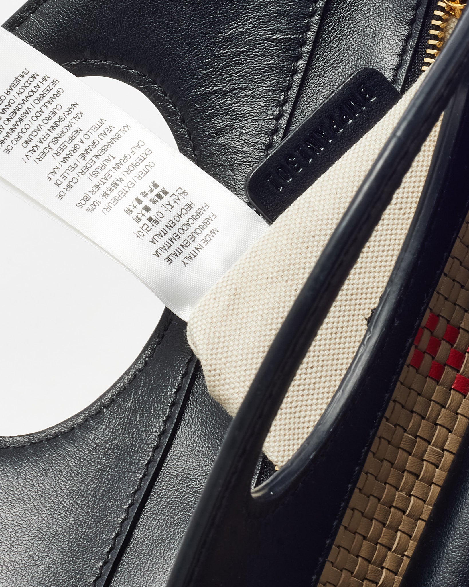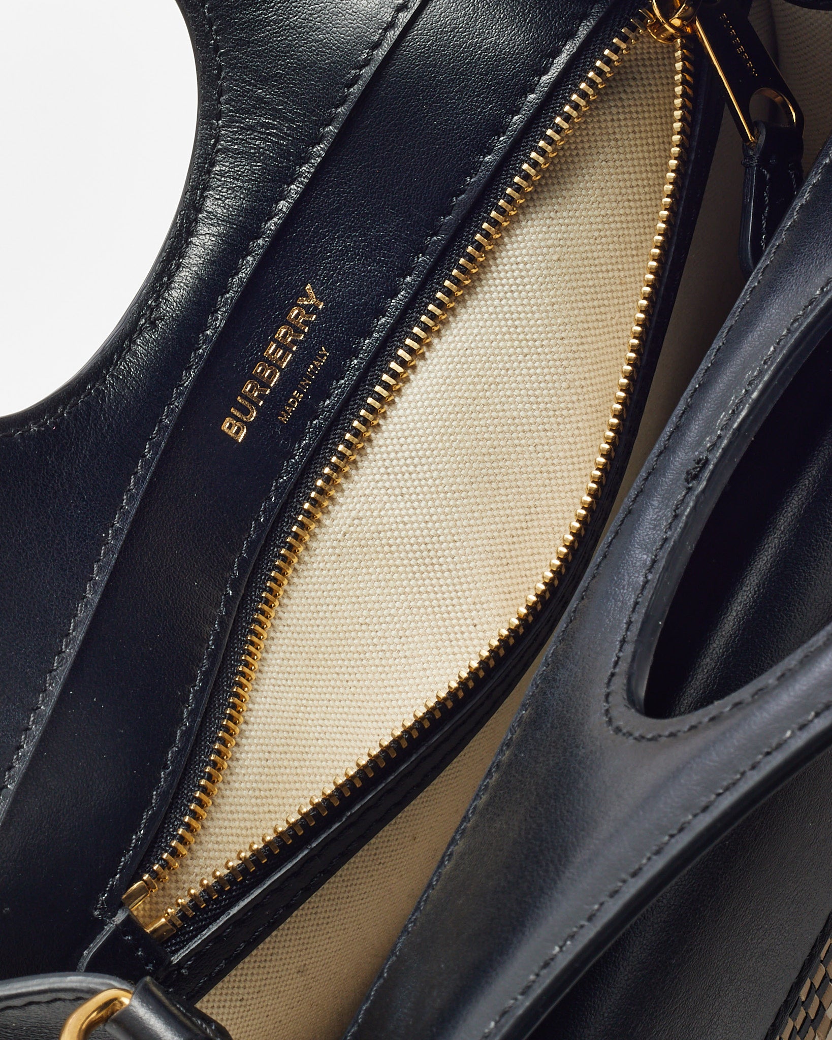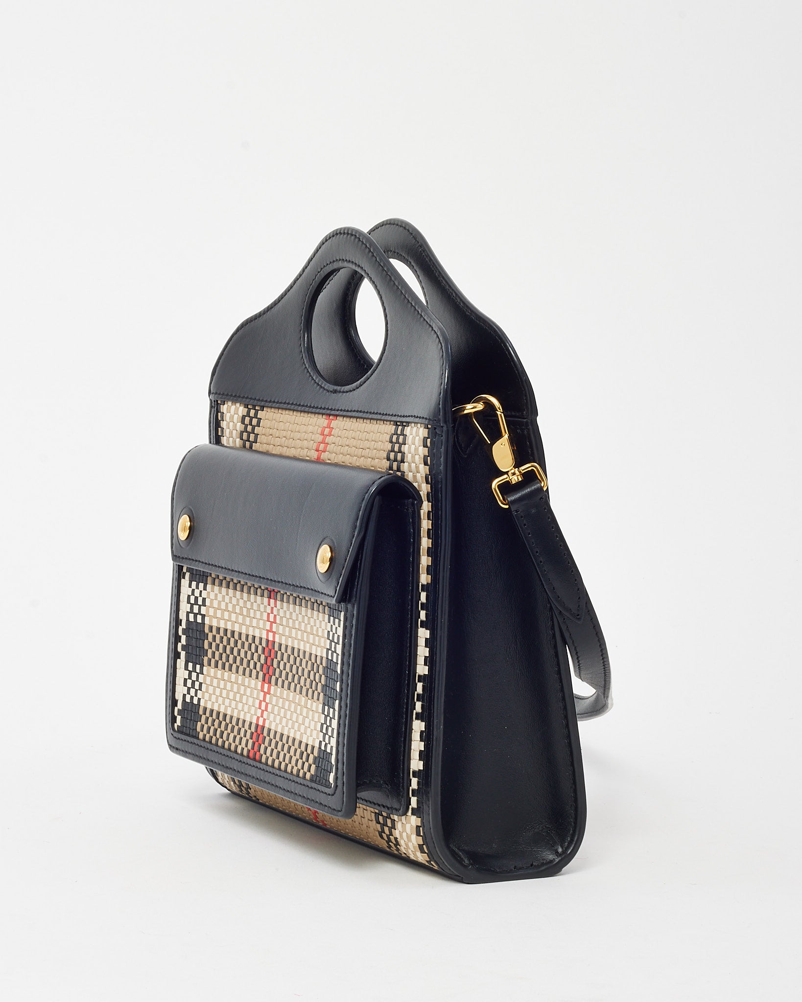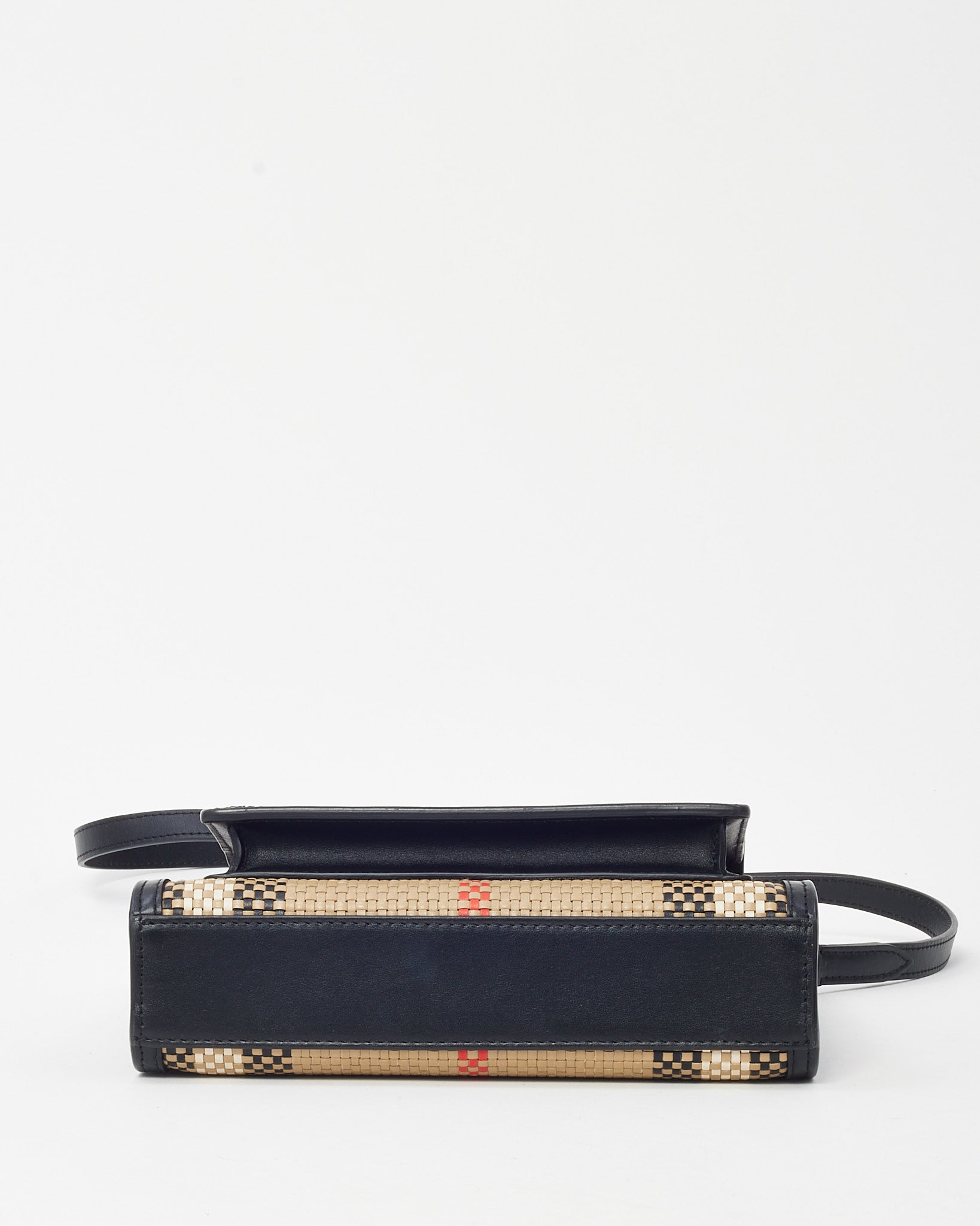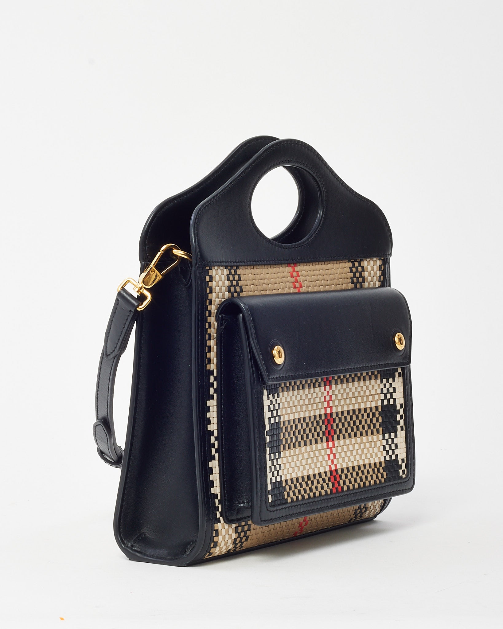 Black Leather and Beige House Check Woven Canvas Mini Pocket Crossbody Bag