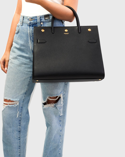 Explore Burberry's exquisite collection of handbags, featuring this certified pre-owned Black Leather Medium Title Tote Bag. Embodying timeless elegance and modern sustainability, each piece, including favorites like this, is authenticated by Retyche. Discover sustainable luxury — shop our current treasures or find inspiration for your next coveted find.
